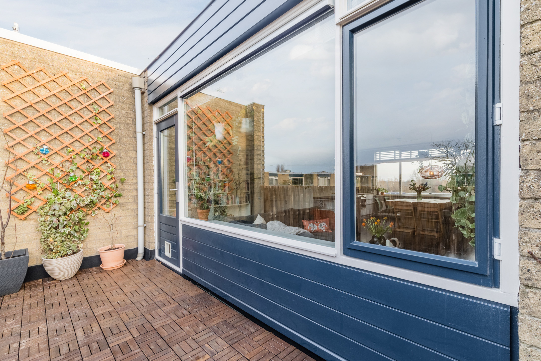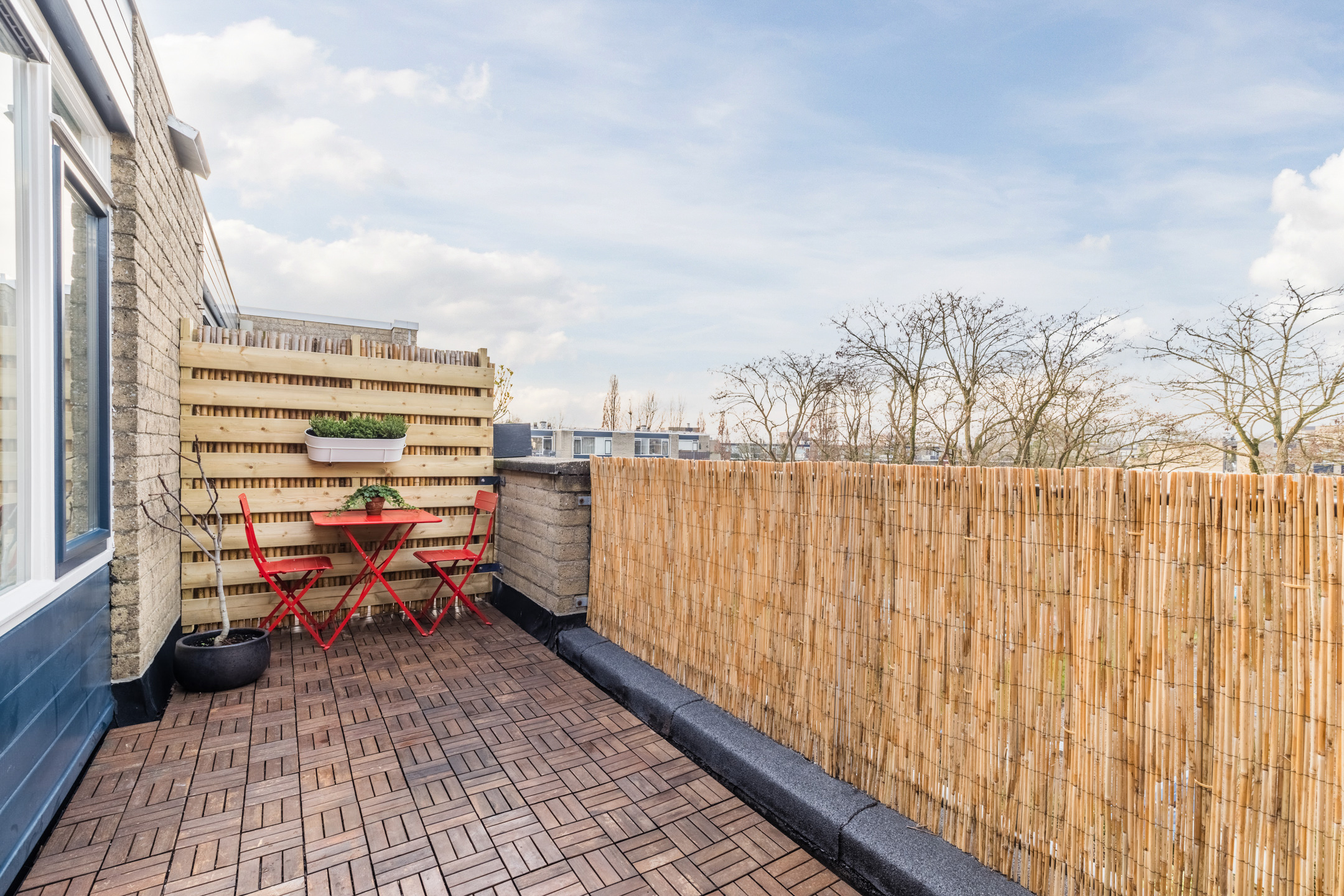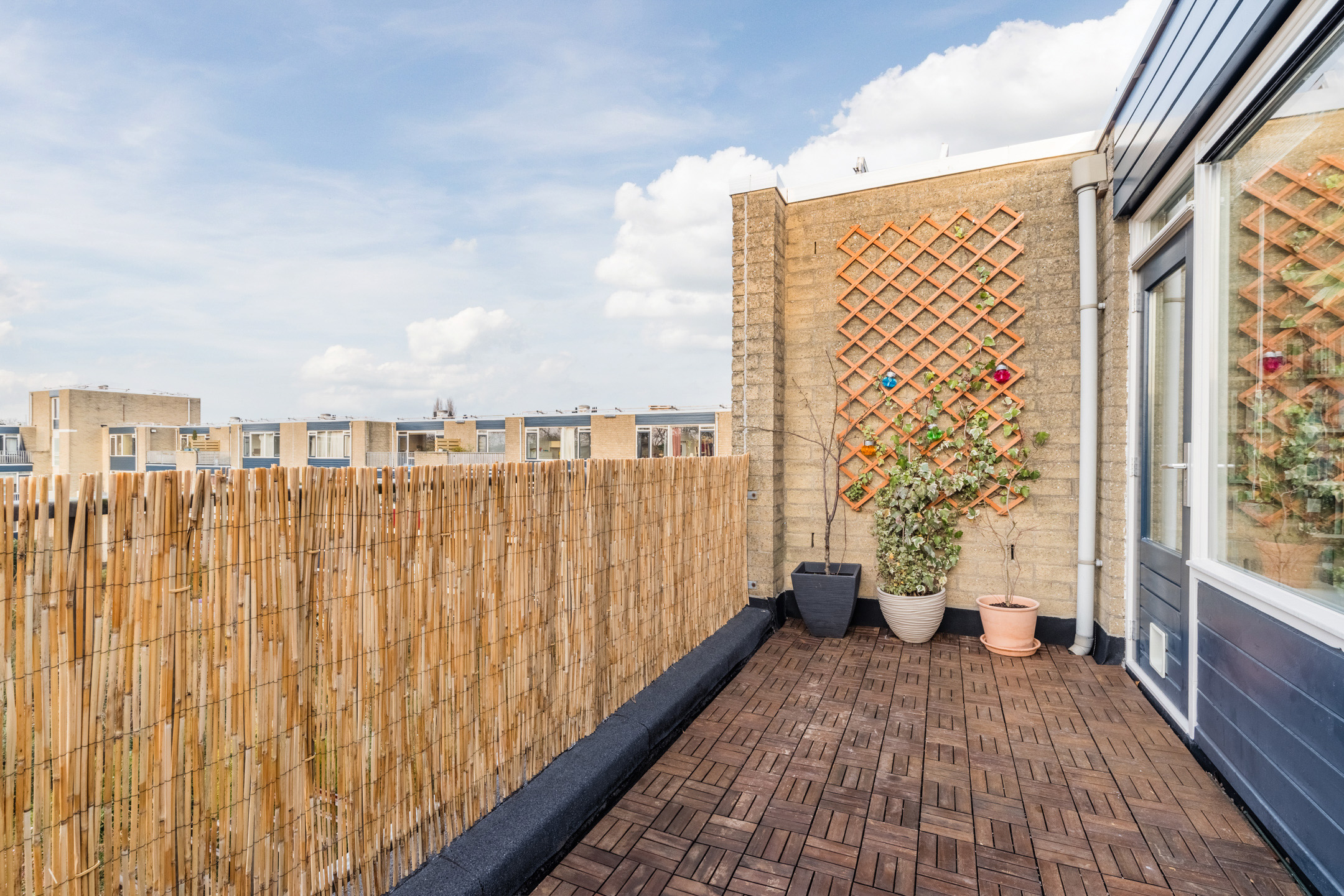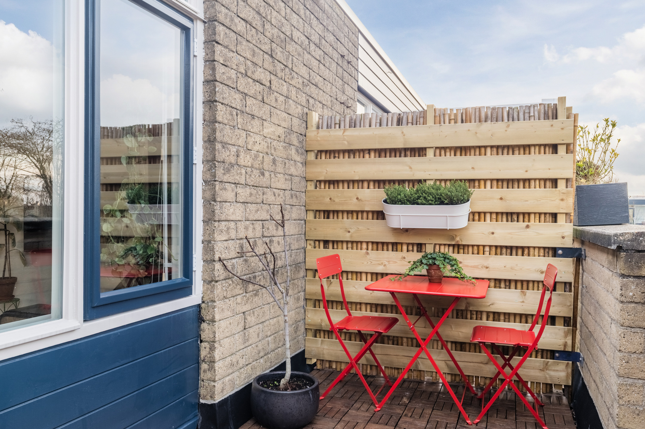 Via een deur in de woonkamer bereik je het grote balkon, dat over de volledige breedte van de woonkamer is gesitueerd. Het balkon is gelegen op het zuiden en biedt een fijne plek om buiten te zitten en te genieten van het uitzicht en de rust.