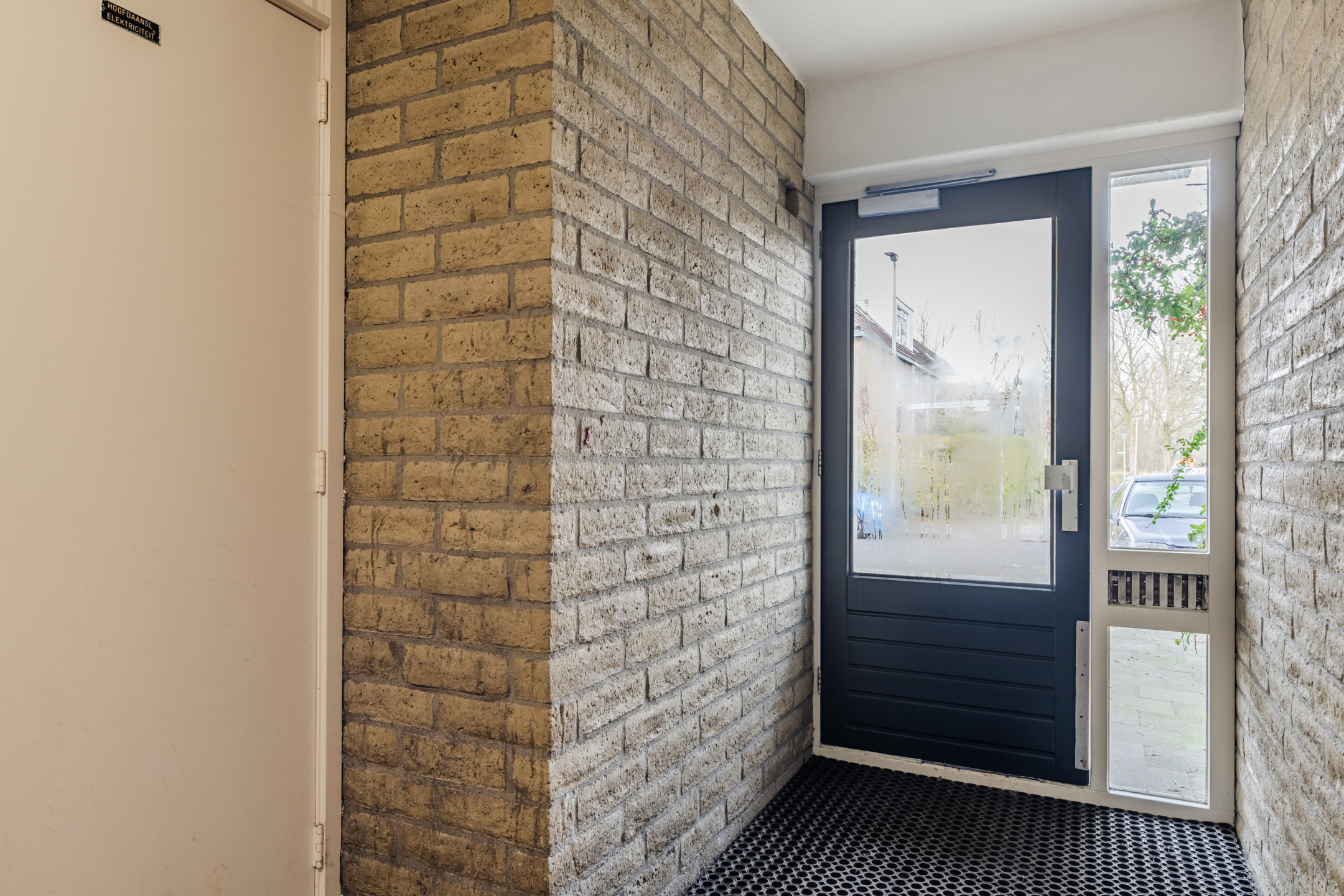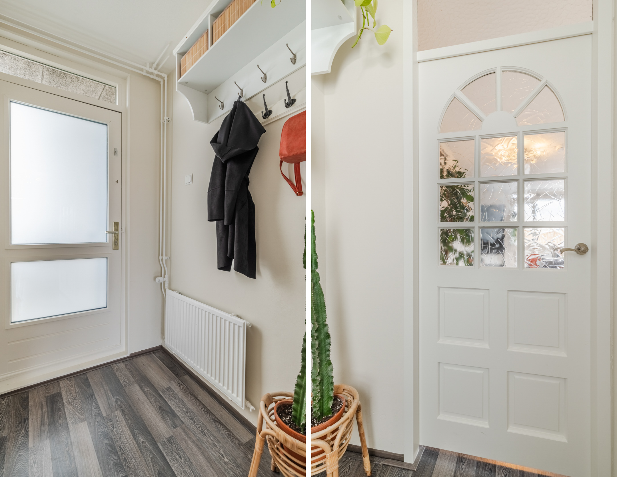Entree met garderobe en toegang tot de woonkamer met open keuken.