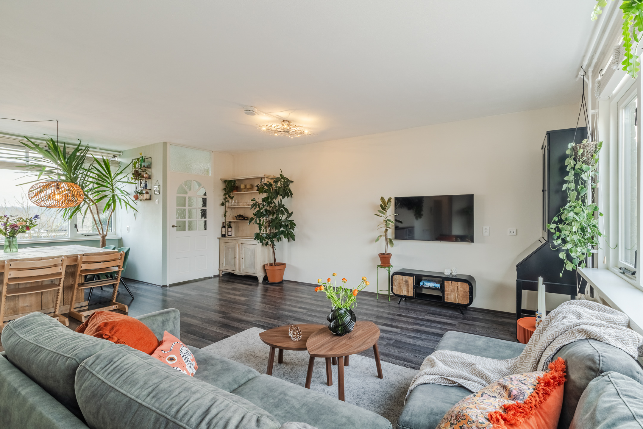 De woonkamer is ruim opgezet en biedt voldoende plaats voor het creëren van een gezellige zit-/ en eethoek. Tevens beschikt de woonkamer over een grote raampartij met vrij uitzicht, waardoor het daglicht rijkelijk binnenvalt en de gehele ruimte licht en aangenaam aanvoelt.