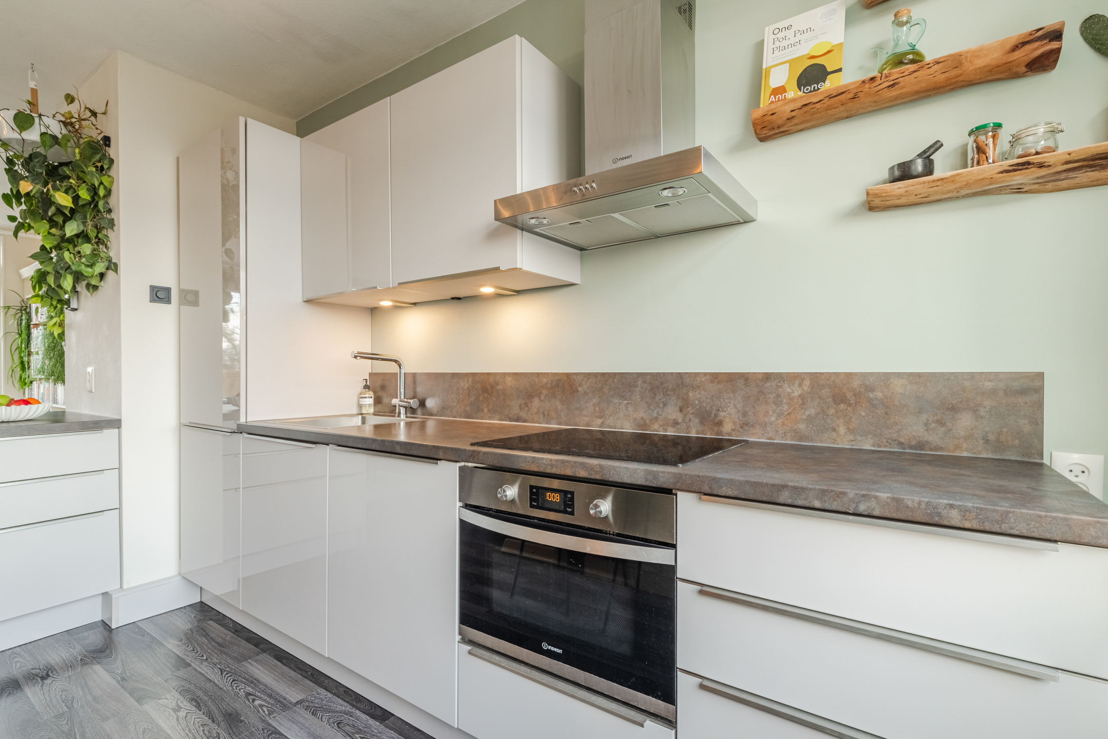 Aan de voorzijde van het appartement bevindt zich de moderne open keuken, geplaatst in een wandopstelling met een klein schiereiland. De keuken is uitgevoerd in een neutrale witte kleurstelling met een kunststof betonlook werkblad en voorzien van alle wenselijke inbouwapparatuur, waaronder een 4-pits inductiekookplaat, een vaatwasser, een koel-/vriescombinatie, een combi-oven/magnetron en een rvs-afzuigkap. Dankzij de grote raampartijen is ook de keuken een heerlijk lichte ruimte en kijk je prachtig weg over de groene omgeving én daarnaast voor de echte liefhebber van UUUUtrecht; stadion Galgenwaard!