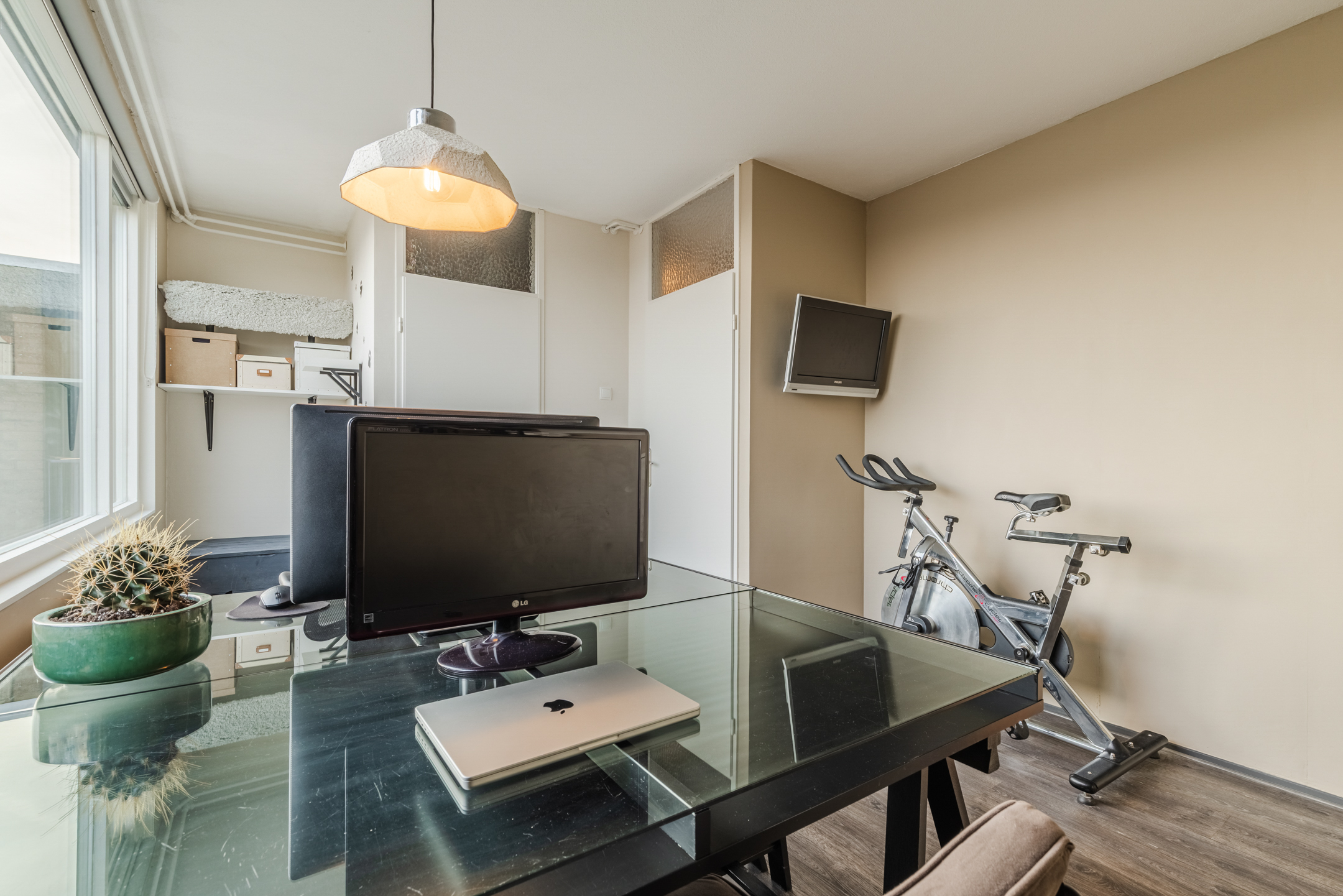 Aan de voorzijde bevindt zich de eerste slaapkamer. Deze slaapkamer is momenteel in gebruik als dubbele werkkamer. In deze slaapkamer is een praktische inbouwkast aanwezig, waar zich de opstelplaats voor de wasmachine en droger bevindt.