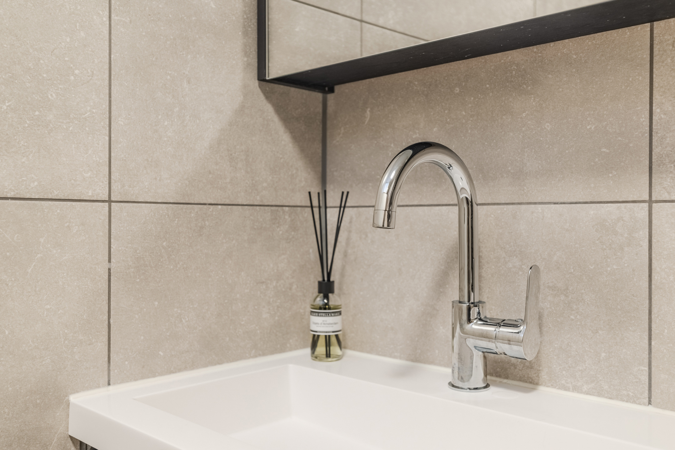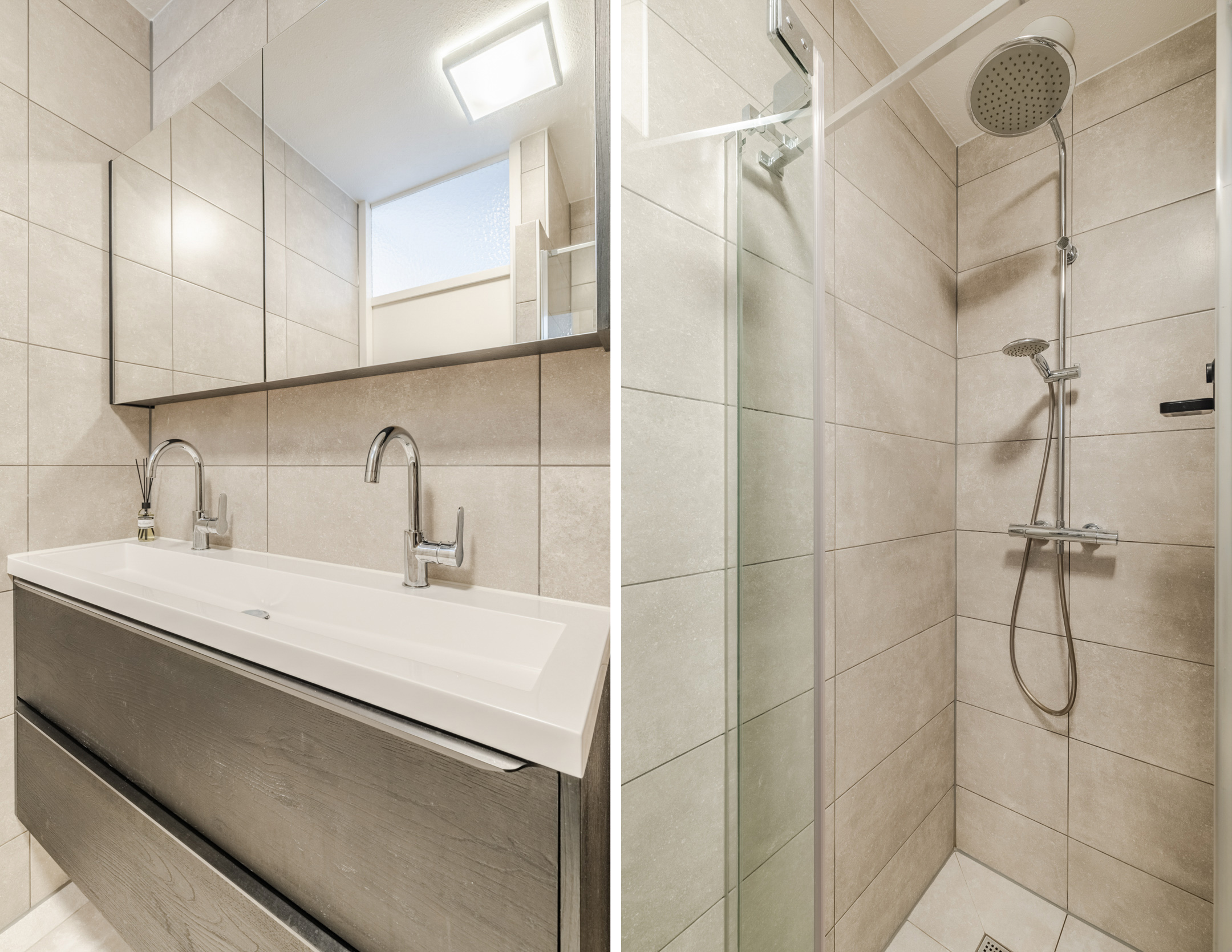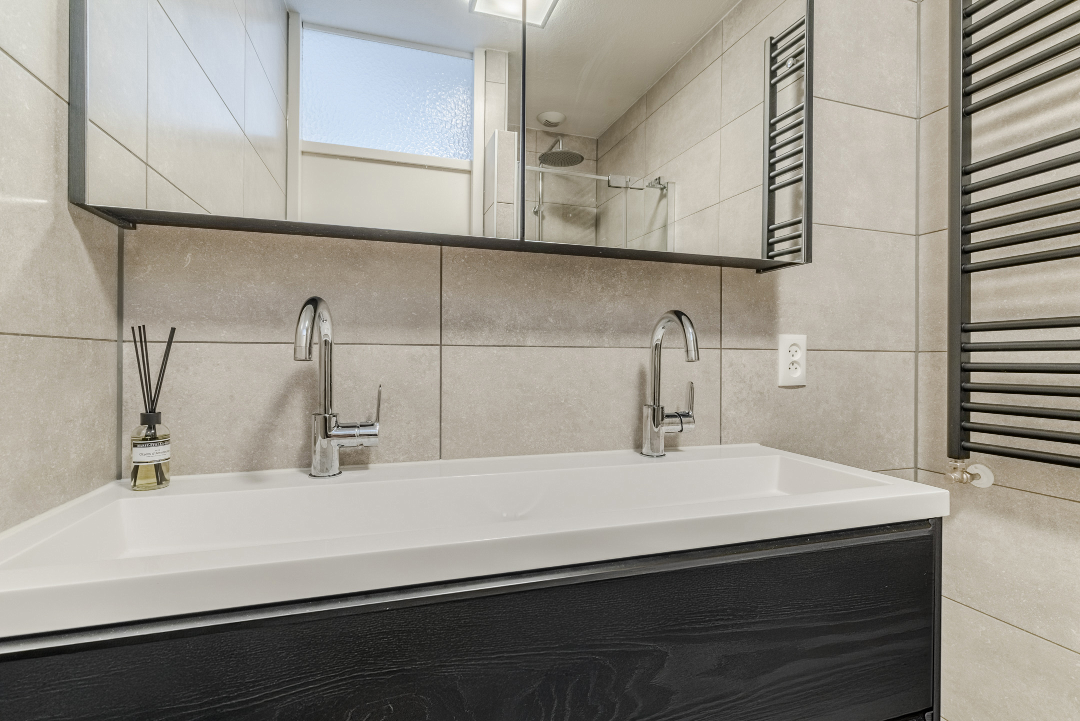 De inpandige badkamer is medio 2021 gerenoveerd en uitgevoerd in een moderne grijze wand- en vloertegel met donkere voeg. De badkamer is voorzien van een douche met regendouche, een dubbele wastafel met meubel, een spiegelkast en een designradiator.