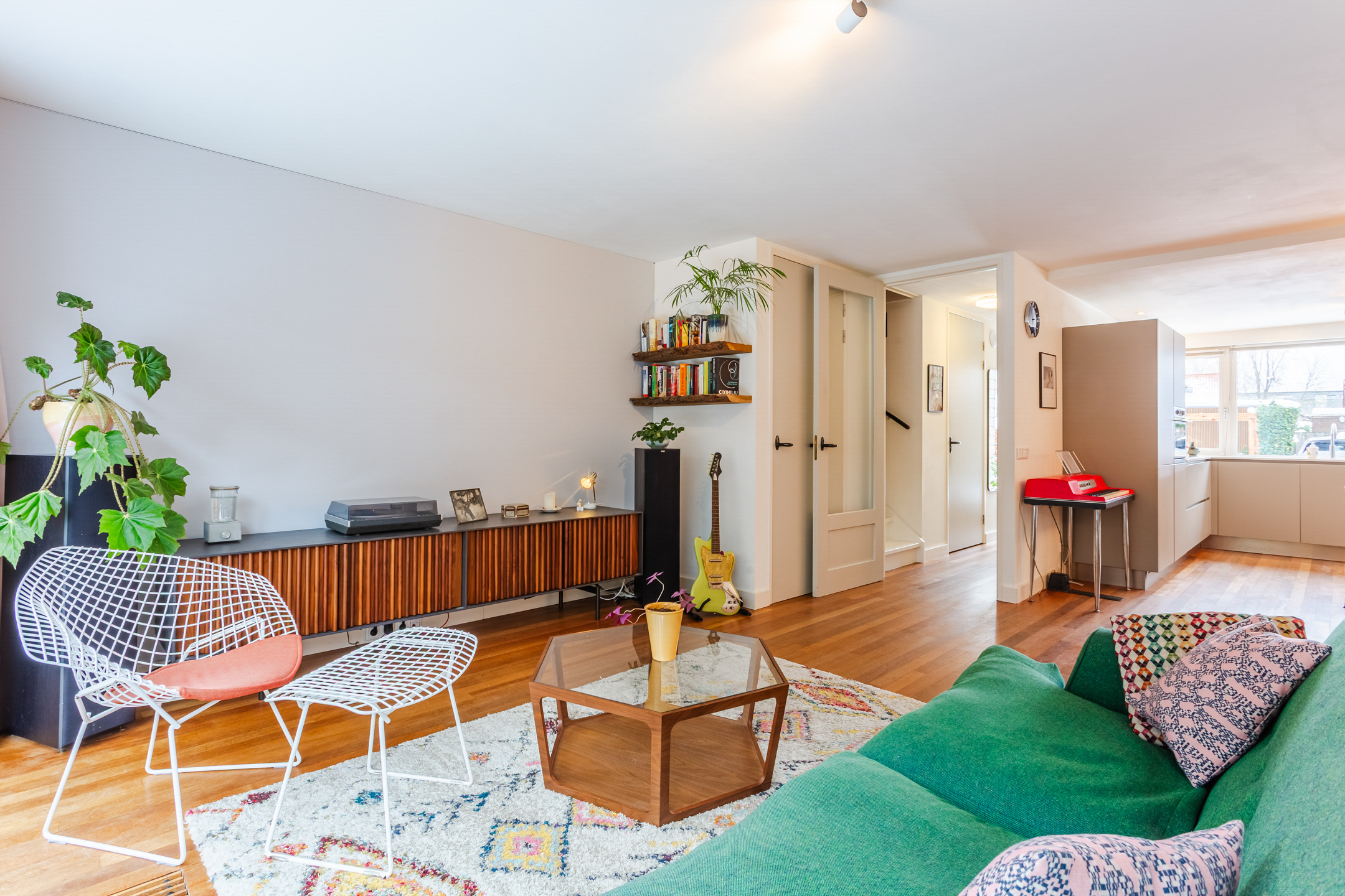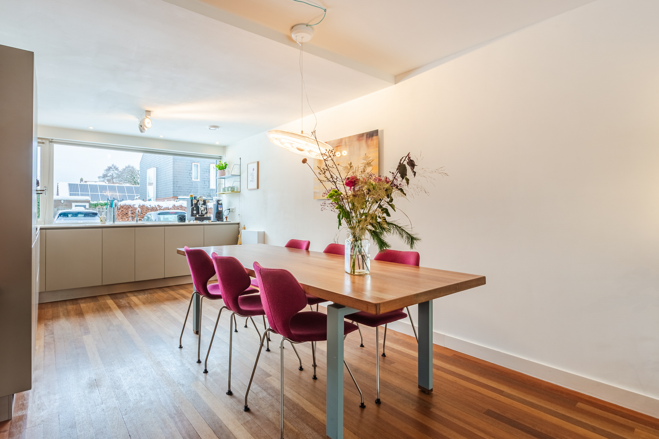 Dankzij de slimme indeling is er meer dan voldoende ruimte voor een grote eettafel voor acht personen. De begane grond is keurig afgewerkt met een unieke houten vloer, die oorspronkelijk afkomstig is uit een ouderwetse gymzaal. De vloer heeft hier een tweede leven gekregen aan de Tjeerdsraklaan en geeft de woning een warme en sfeervolle uitstraling.