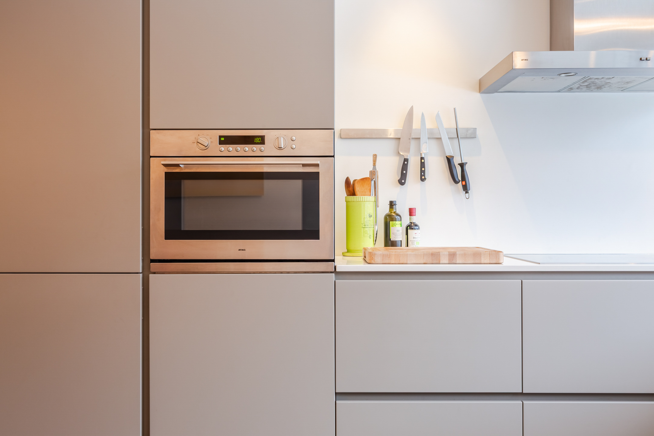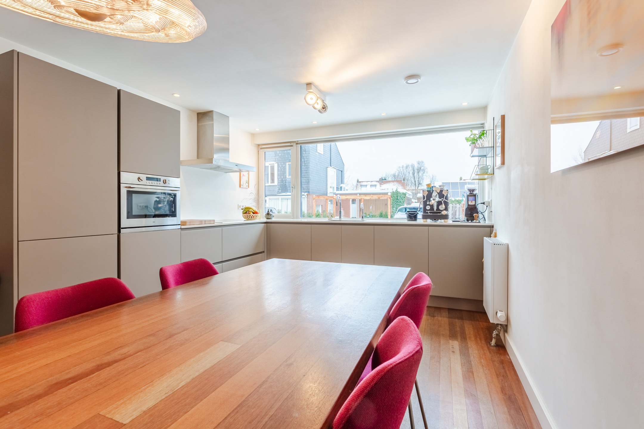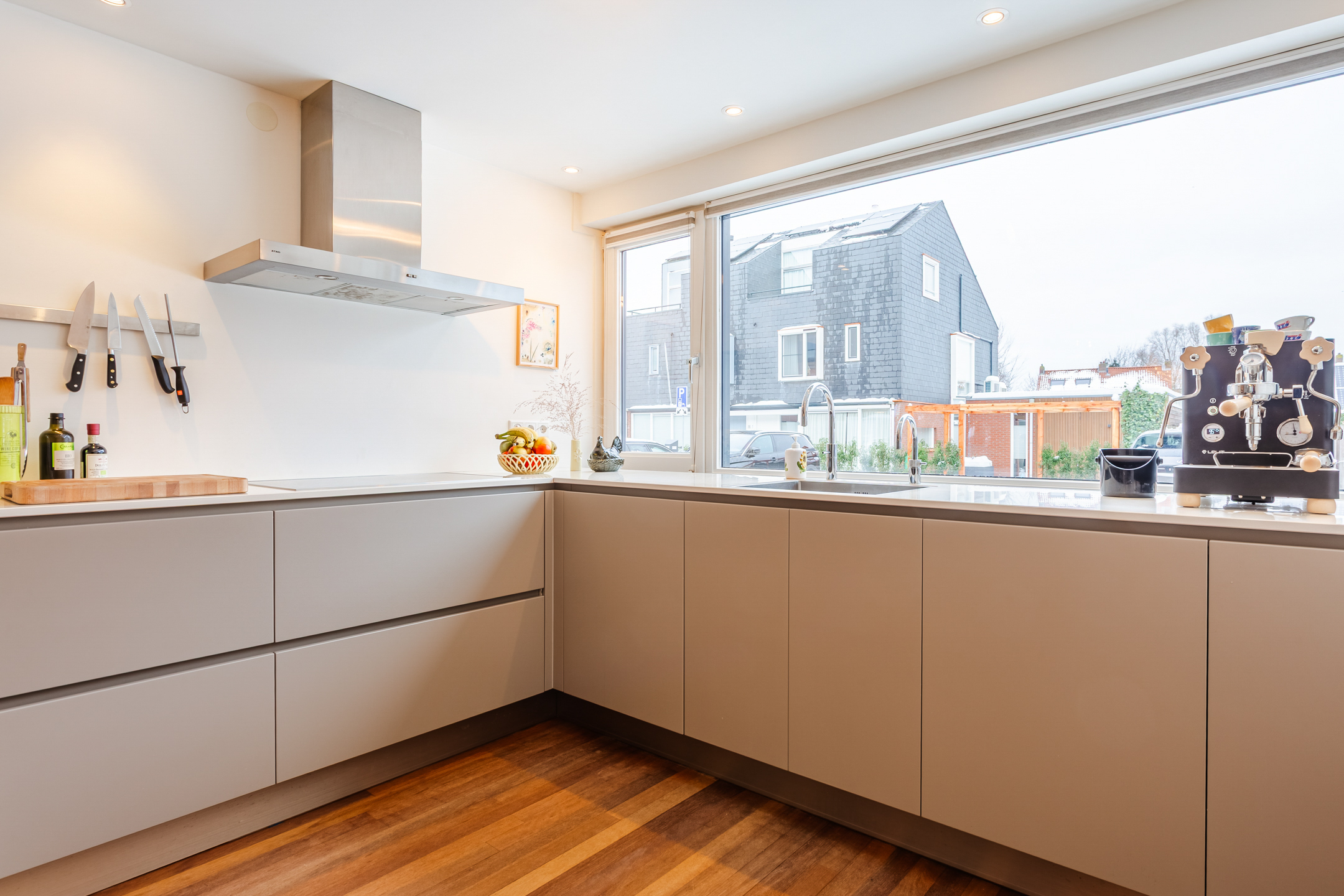 De moderne en complete keuken is gesitueerd aan de voorzijde van de woning en biedt daardoor een leuk uitzicht over de straat. De keuken is opgesteld in een ruime L-opstelling en uitgevoerd in een tijdloze, moderne kleurstelling. Er is gekozen voor licht beige/nude kasten in combinatie met een strak wit composieten werkblad. De keuken is voorzien van alle wenselijke inbouwapparatuur, waaronder een inductiekookplaat (Miele), koelkast, vriezer, afzuigkap, combi-oven, vaatwasser en een handige Quooker.