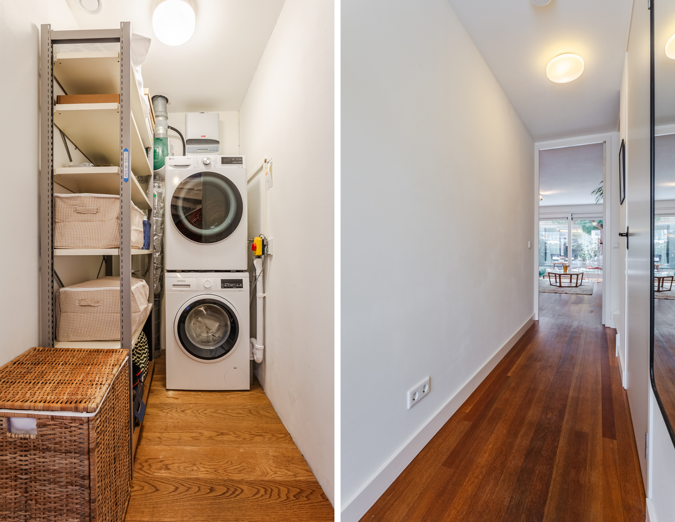 Op deze verdieping bevindt zich tevens een aparte bergruimte met de aansluitingen voor wasmachine en droger. De gehele eerste verdieping is afgewerkt met een laminaatvloer en nette wandafwerking.