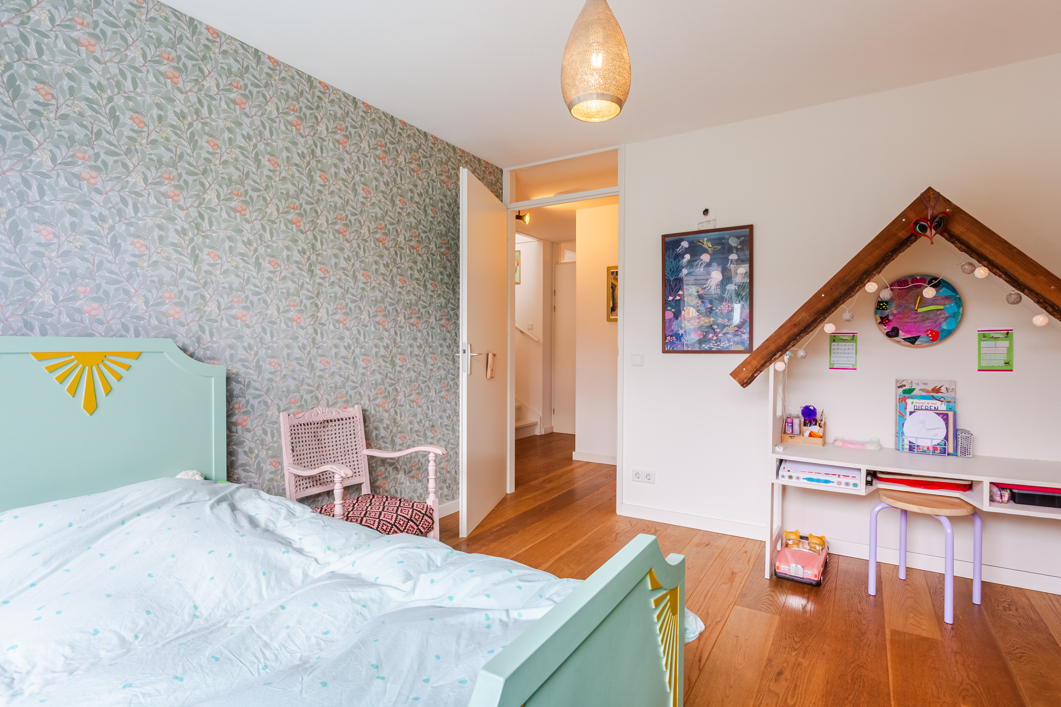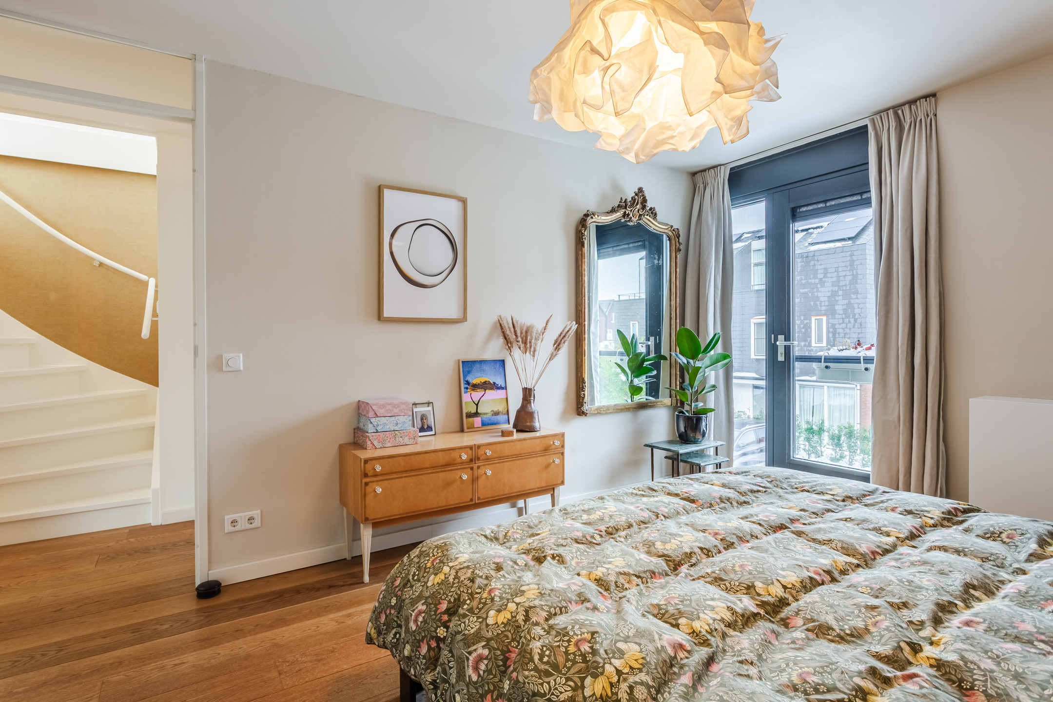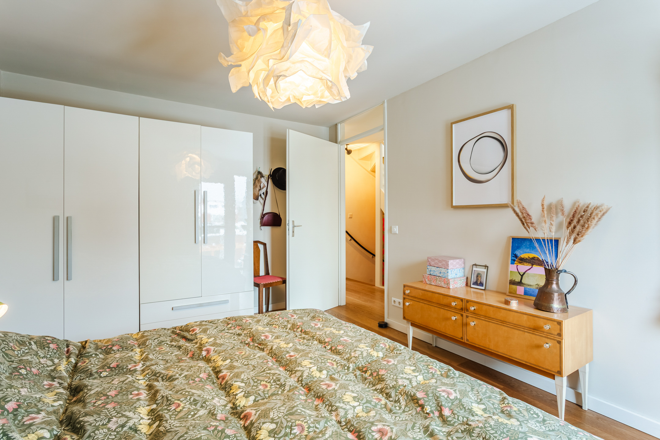 Via de trap bereik je de overloop op de eerste verdieping, waaraan drie slaapkamers, de badkamer en een ruime opbergkast/ wasruimte grenzen. Aan de tuinzijde van de woning bevinden zich twee slaapkamers, beide voorzien van grote glaspartijen en met uitzicht op de tuin. Aan de voorzijde zijn de master bedroom, met een gezellig Frans balkon, en de badkamer gesitueerd.