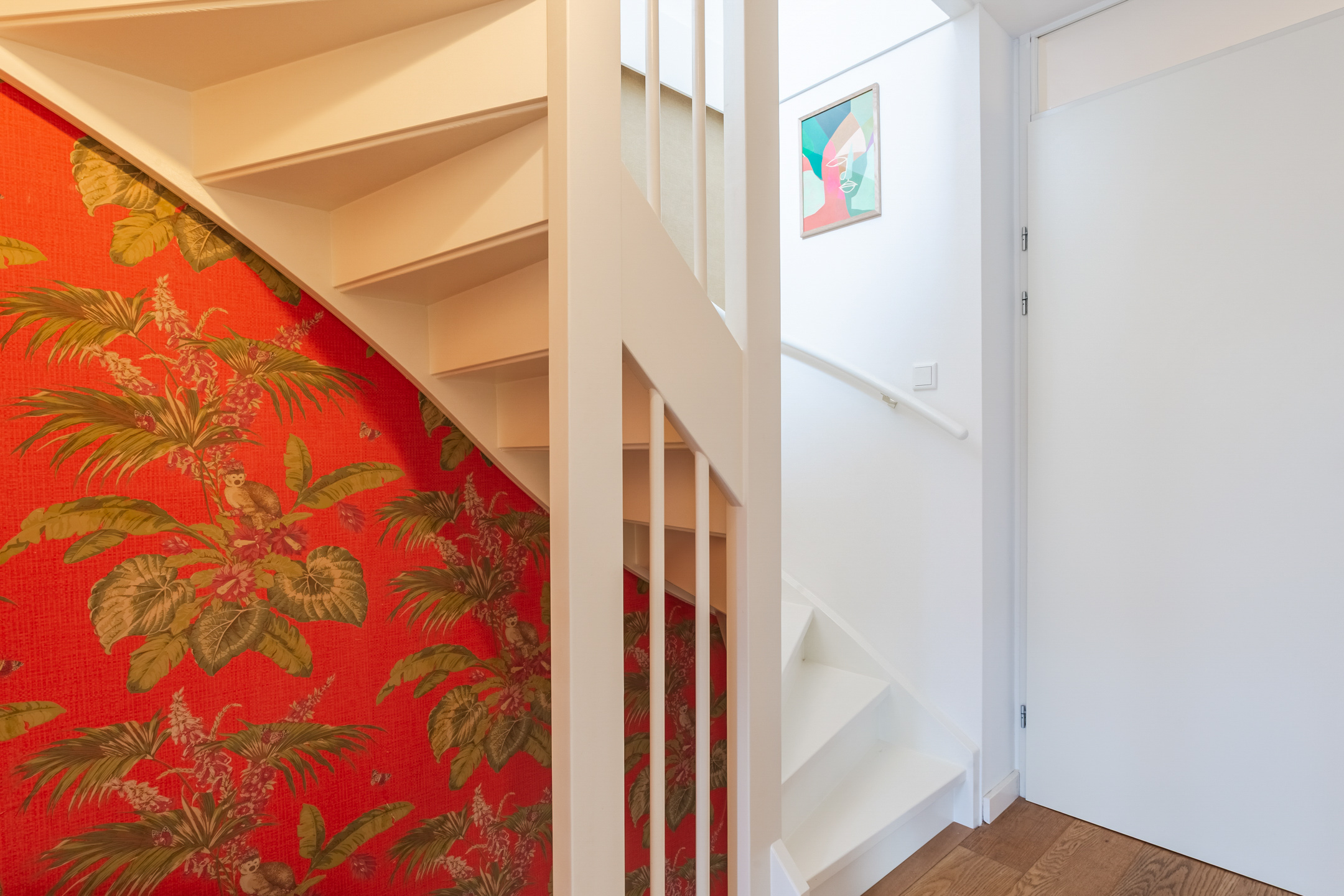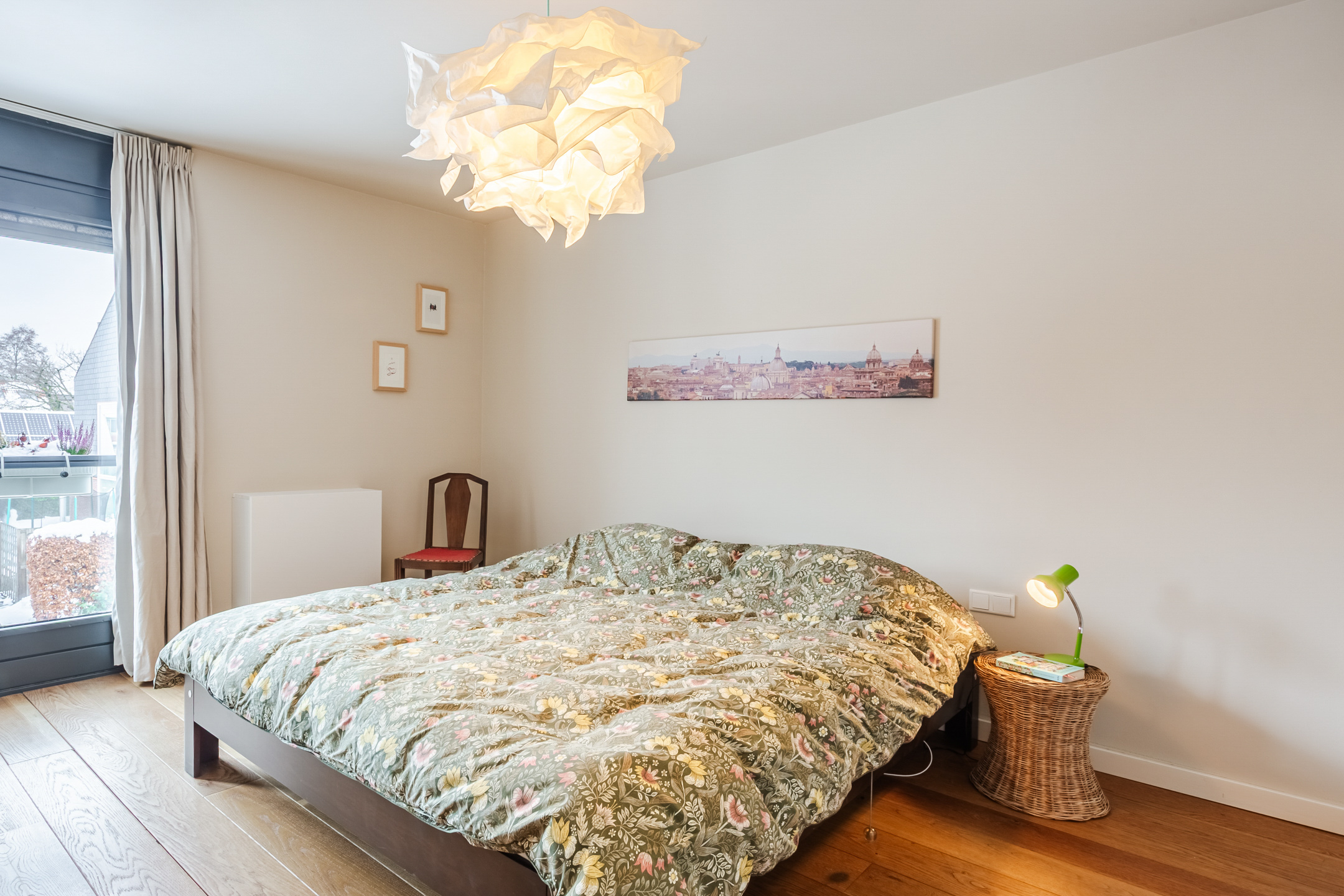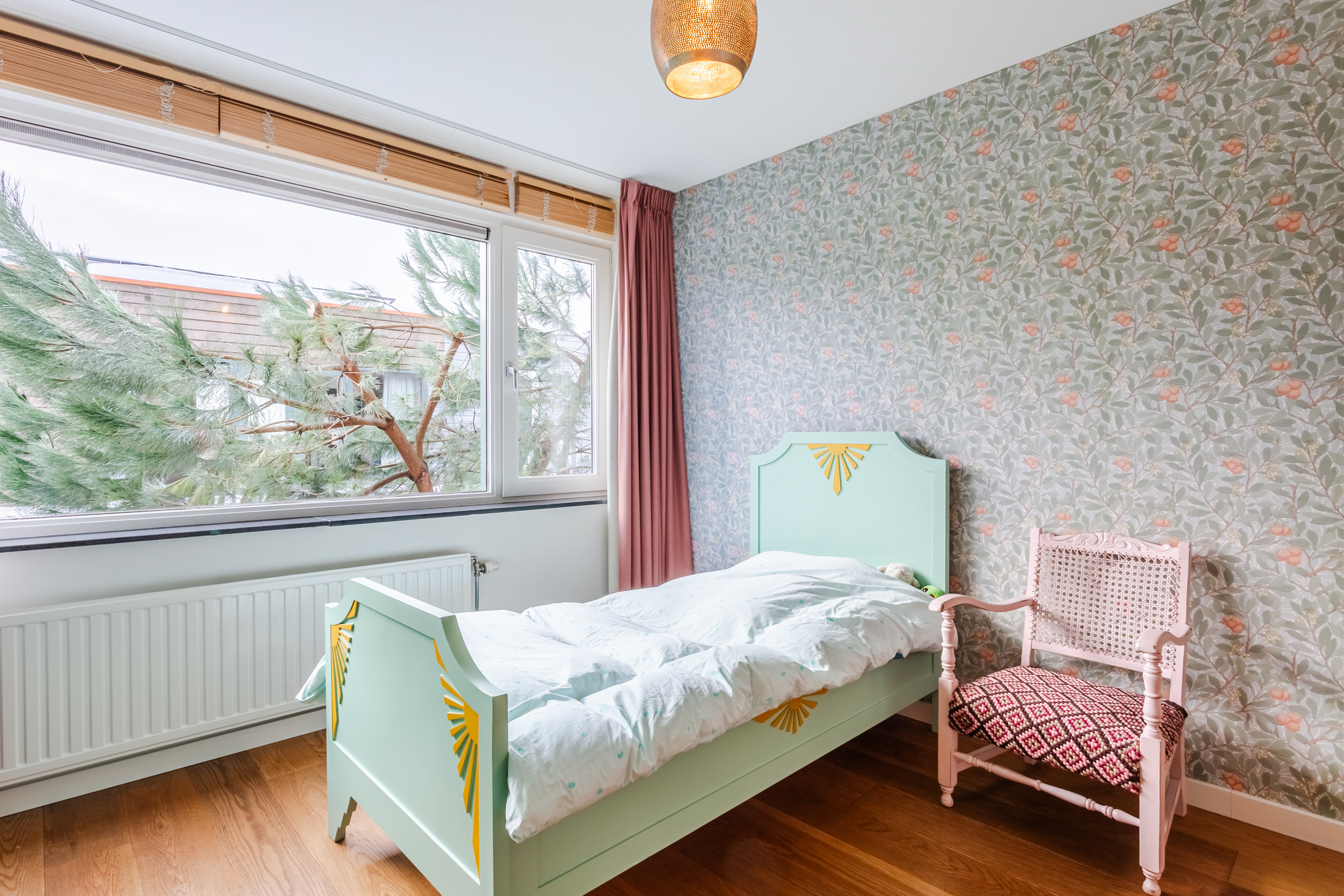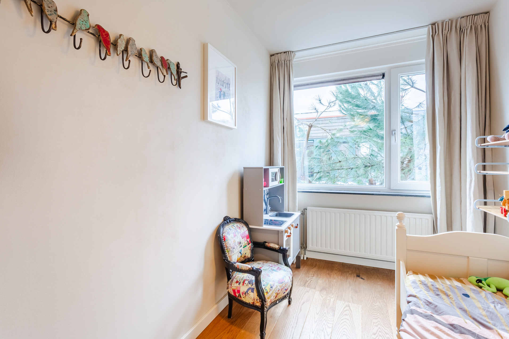 Via de trap bereik je de overloop op de eerste verdieping, waaraan drie slaapkamers, de badkamer en een ruime opbergkast/ wasruimte grenzen. Aan de tuinzijde van de woning bevinden zich twee slaapkamers, beide voorzien van grote glaspartijen en met uitzicht op de tuin. Aan de voorzijde zijn de master bedroom, met een gezellig Frans balkon, en de badkamer gesitueerd.