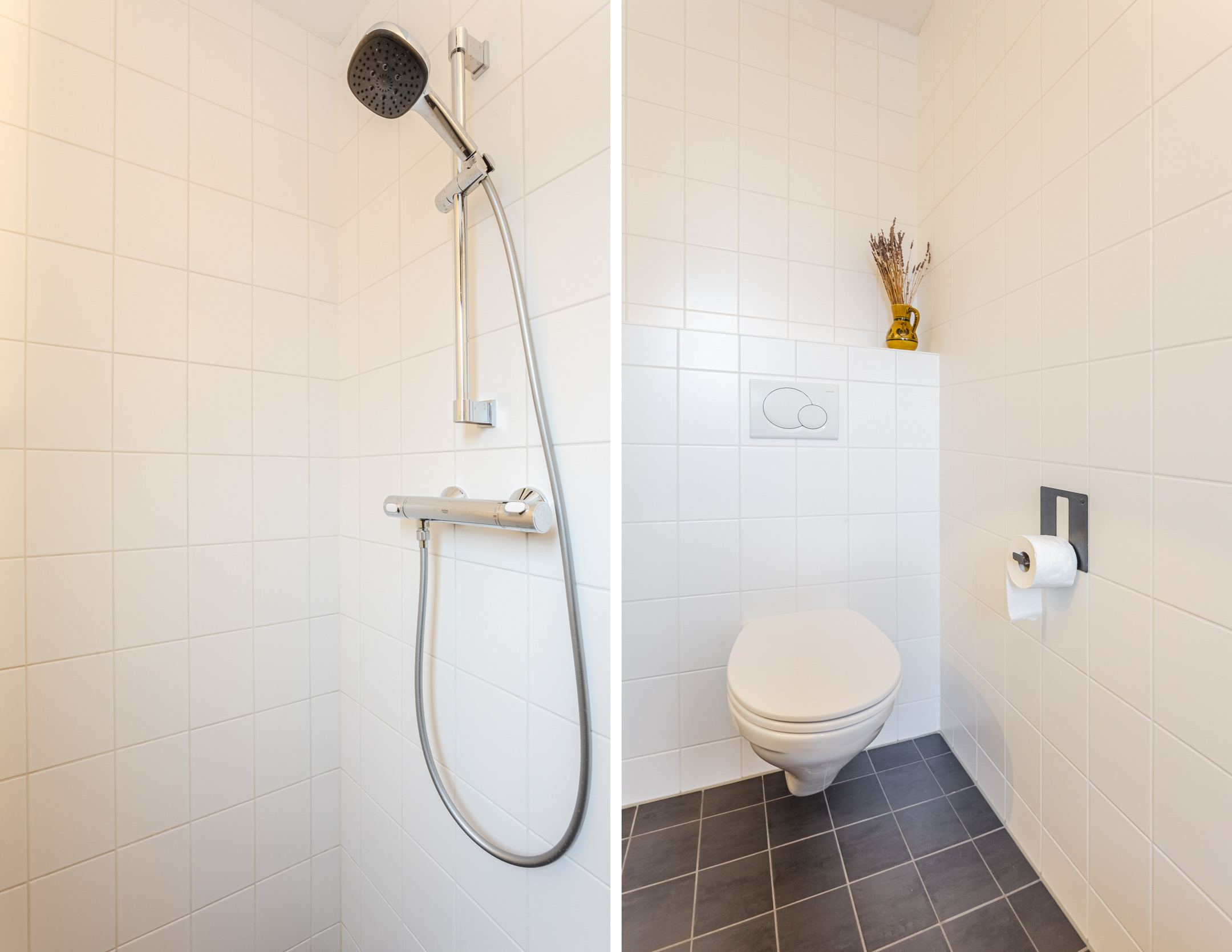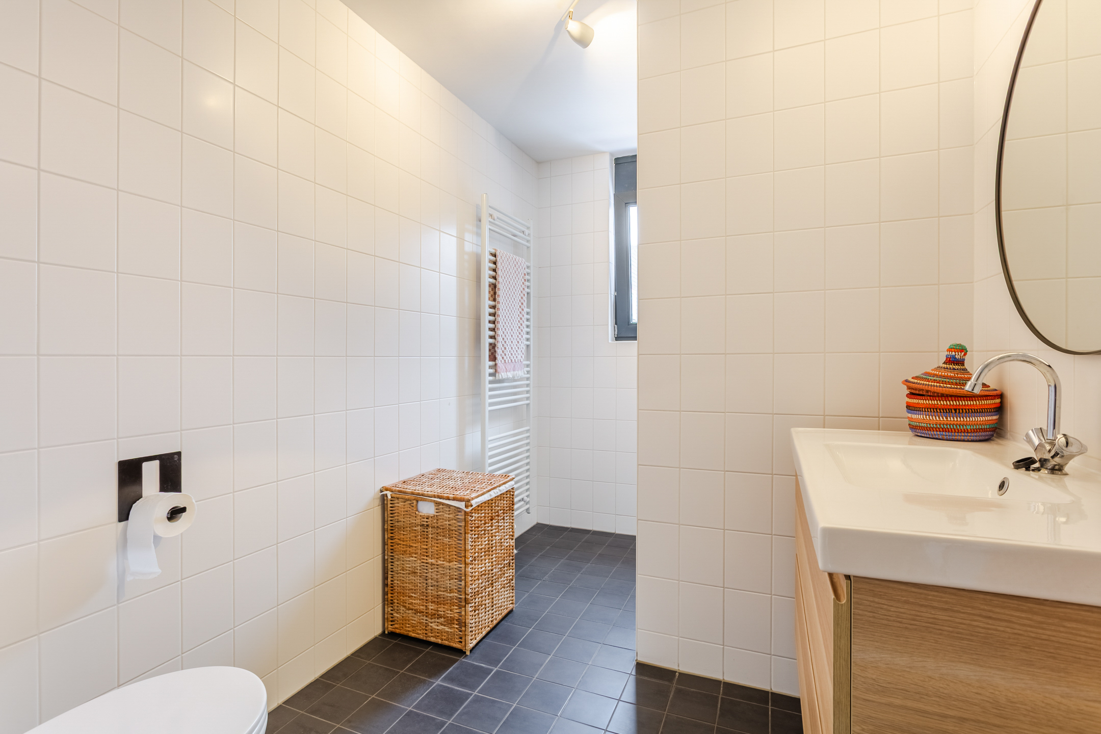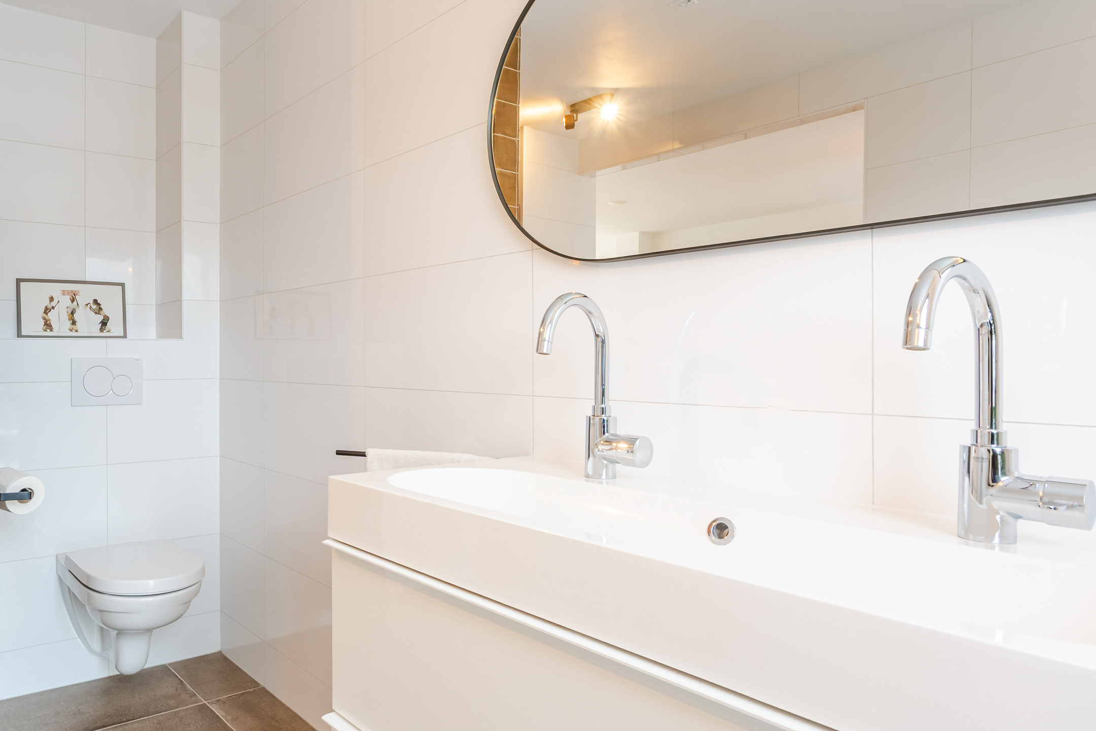 De goed verzorgde en complete badkamer is uitgevoerd in een tijdloze witte kleurstelling en beschikt over een inloopdouche, een tweede toilet en een wastafelmeubel met kraan, ruime lades en een mooie ronde spiegel. Het kiepraam zorgt voor veel daglicht en biedt, naast de aanwezige mechanische ventilatie, de mogelijkheid tot extra ventilatie.