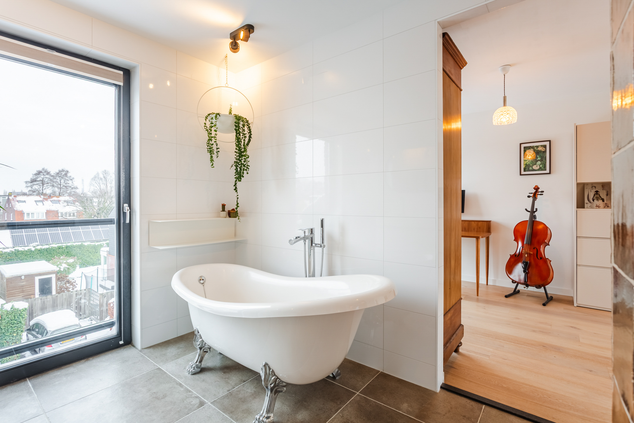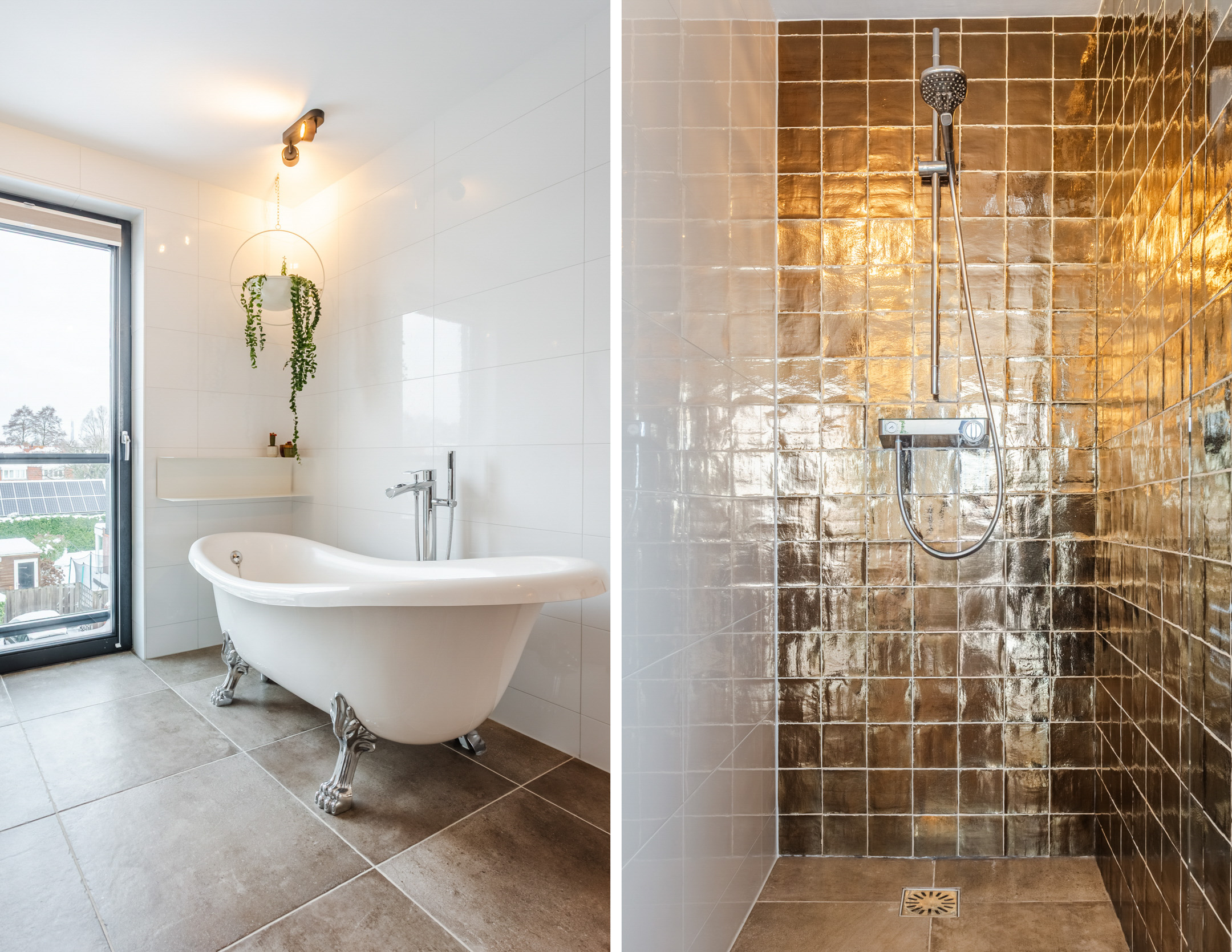Op deze etage bevindt zich aan de voorzijde van de woning tevens een tweede, luxe badkamer. Deze badkamer is gerealiseerd in 2018 en uitgevoerd met stijlvolle gouden detailtegels, een bad op pootjes, een aparte inloopdouche, een dubbele wastafel met bijpassend meubel en een derde toilet.