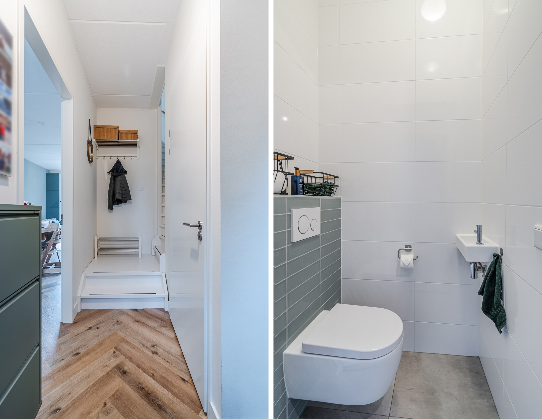 Entree, ruime hal met dubbele garderobe, trapopgang naar de eerste verdieping, toiletruimte met hangend toilet en fontein, meterkast en toegang tot de woonkamer.