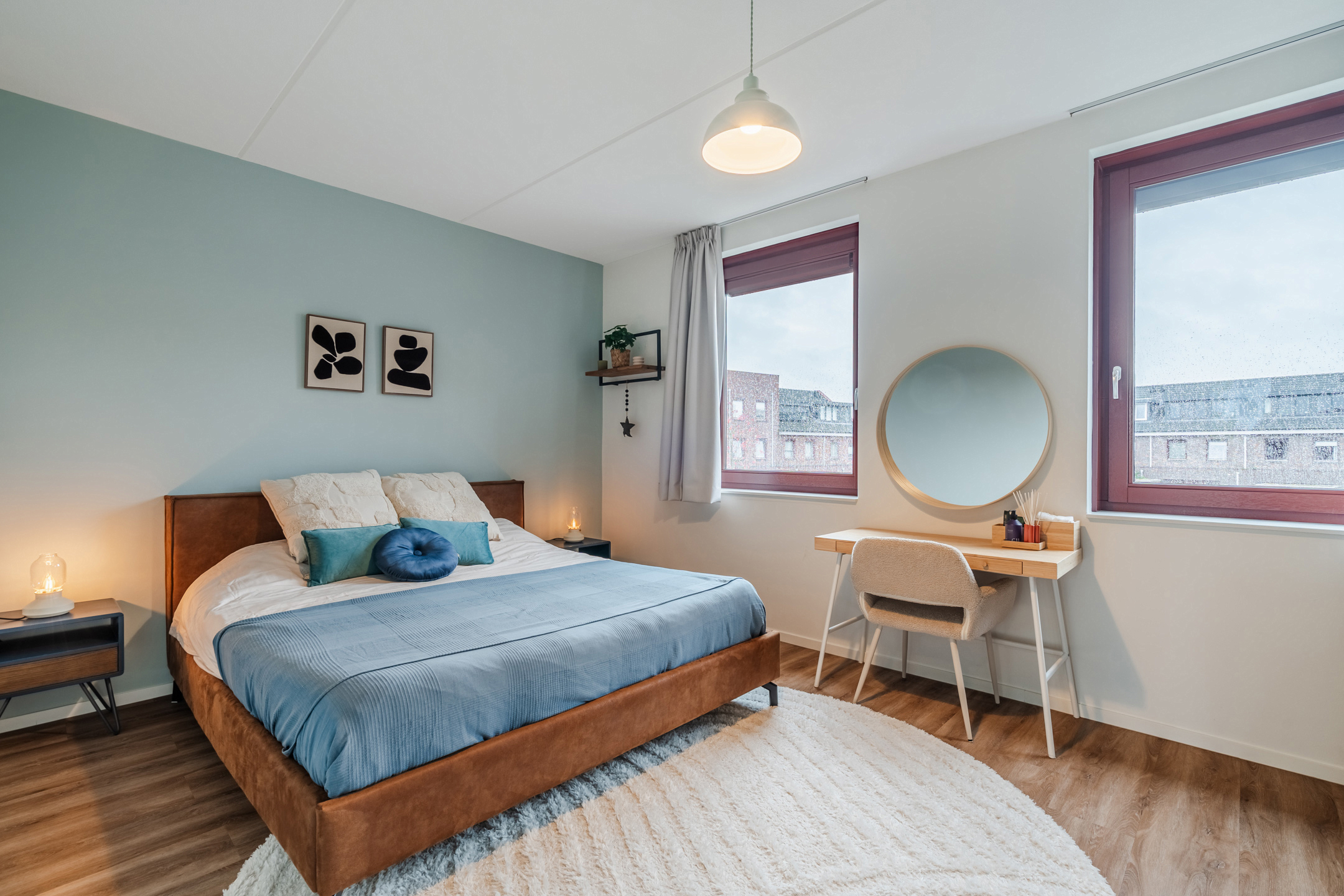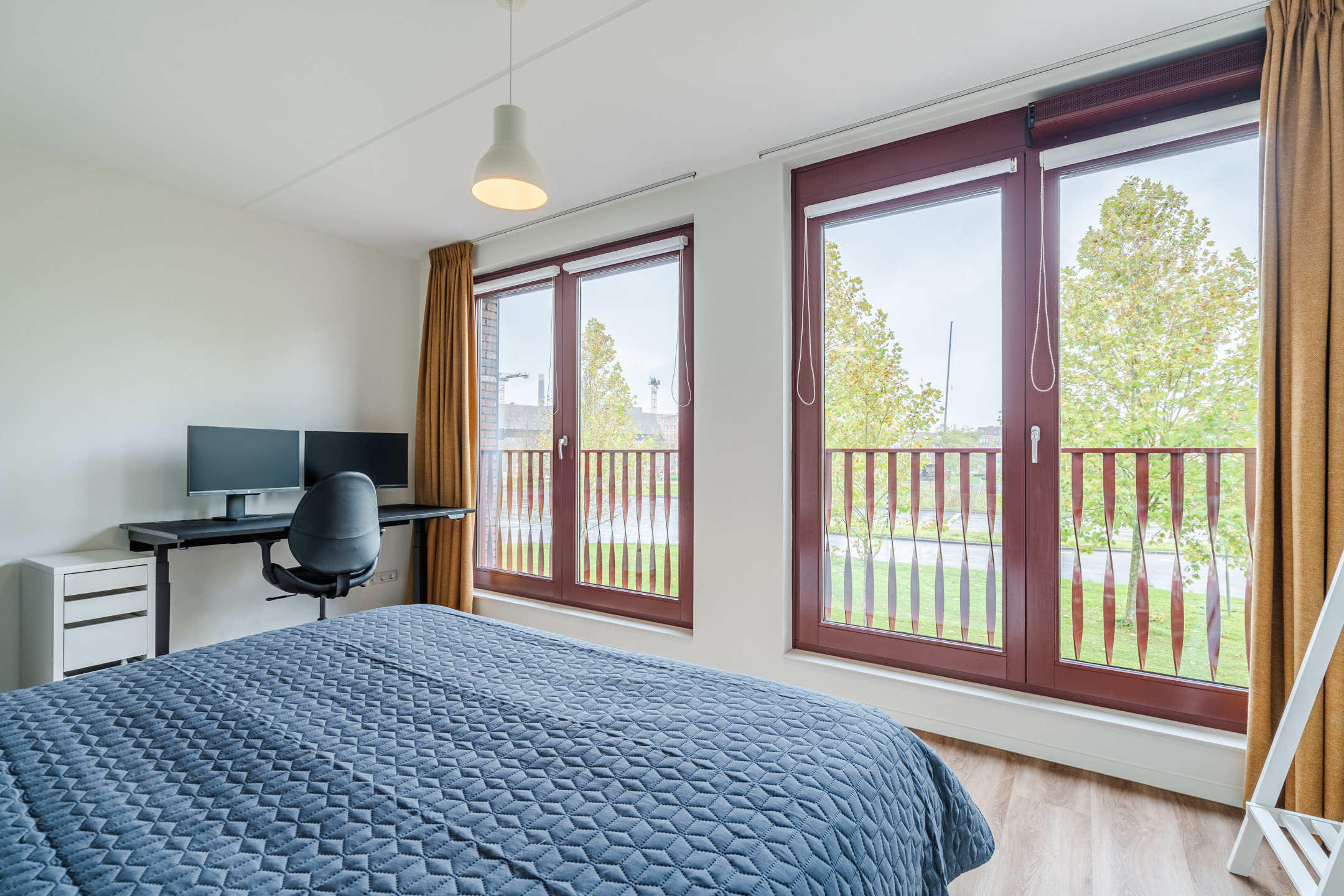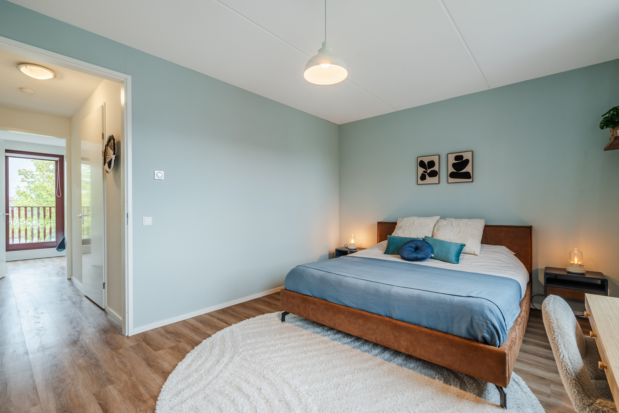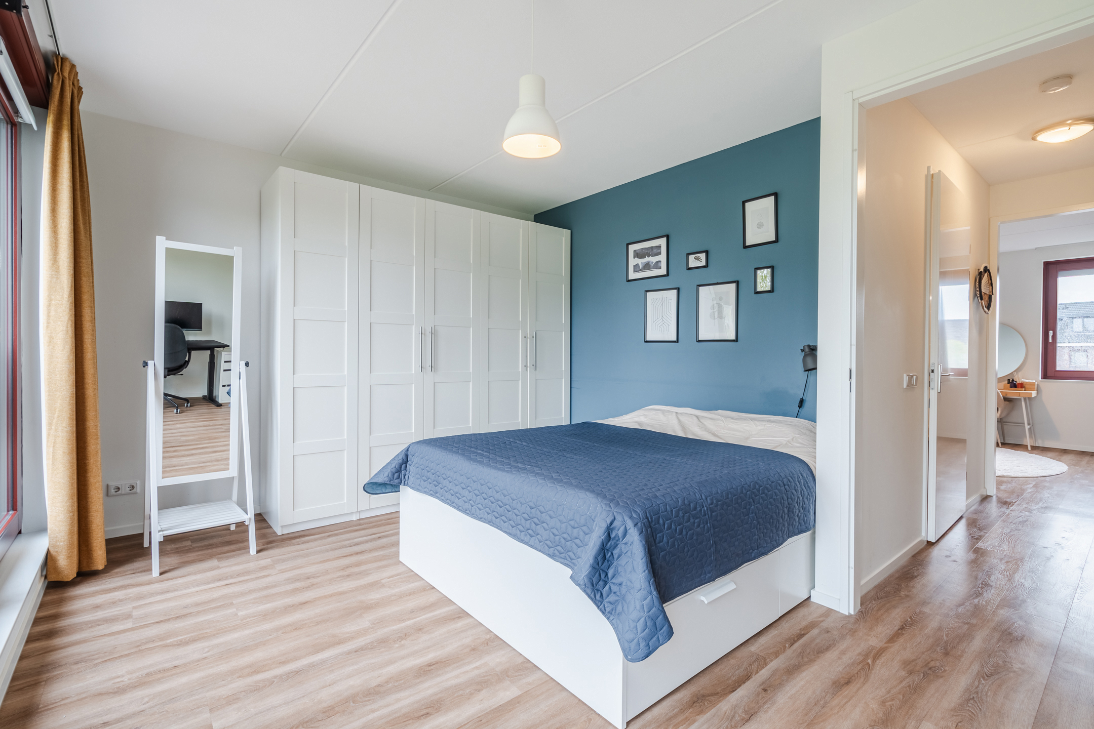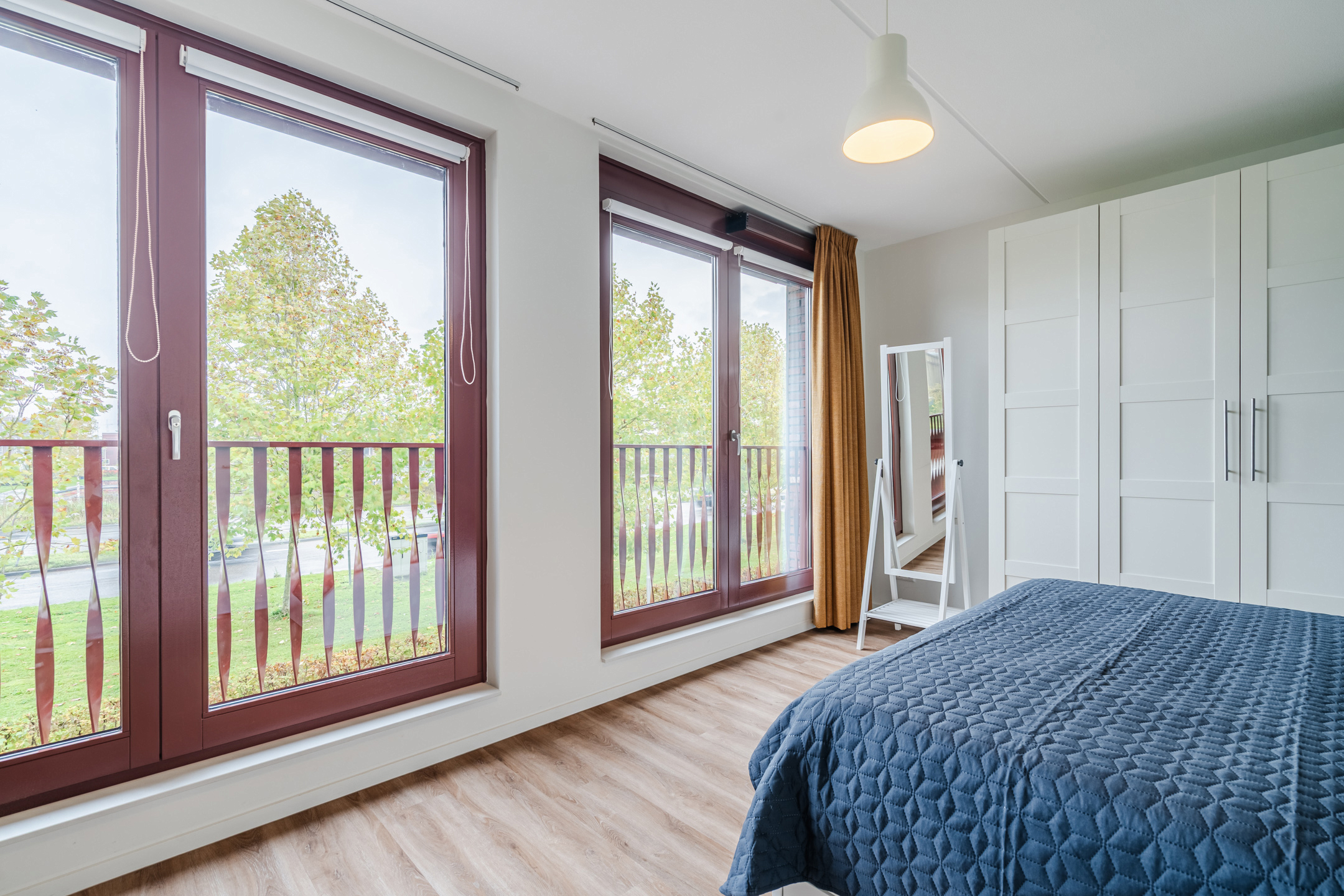 De slaapkamer aan de voorzijde strekt over de gehele breedte van de woning. Deze ruime kamer heeft een fijne lichtinval door het dubbele Franse balkon met draai-/ kiepramen. De tweede slaapkamer is aan de achterzijde gesitueerd en beschikt ook over twee grote raampartijen voorzien van draai-/ kiepramen.