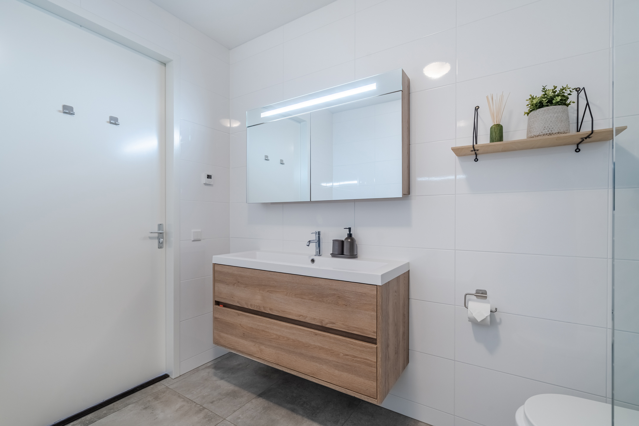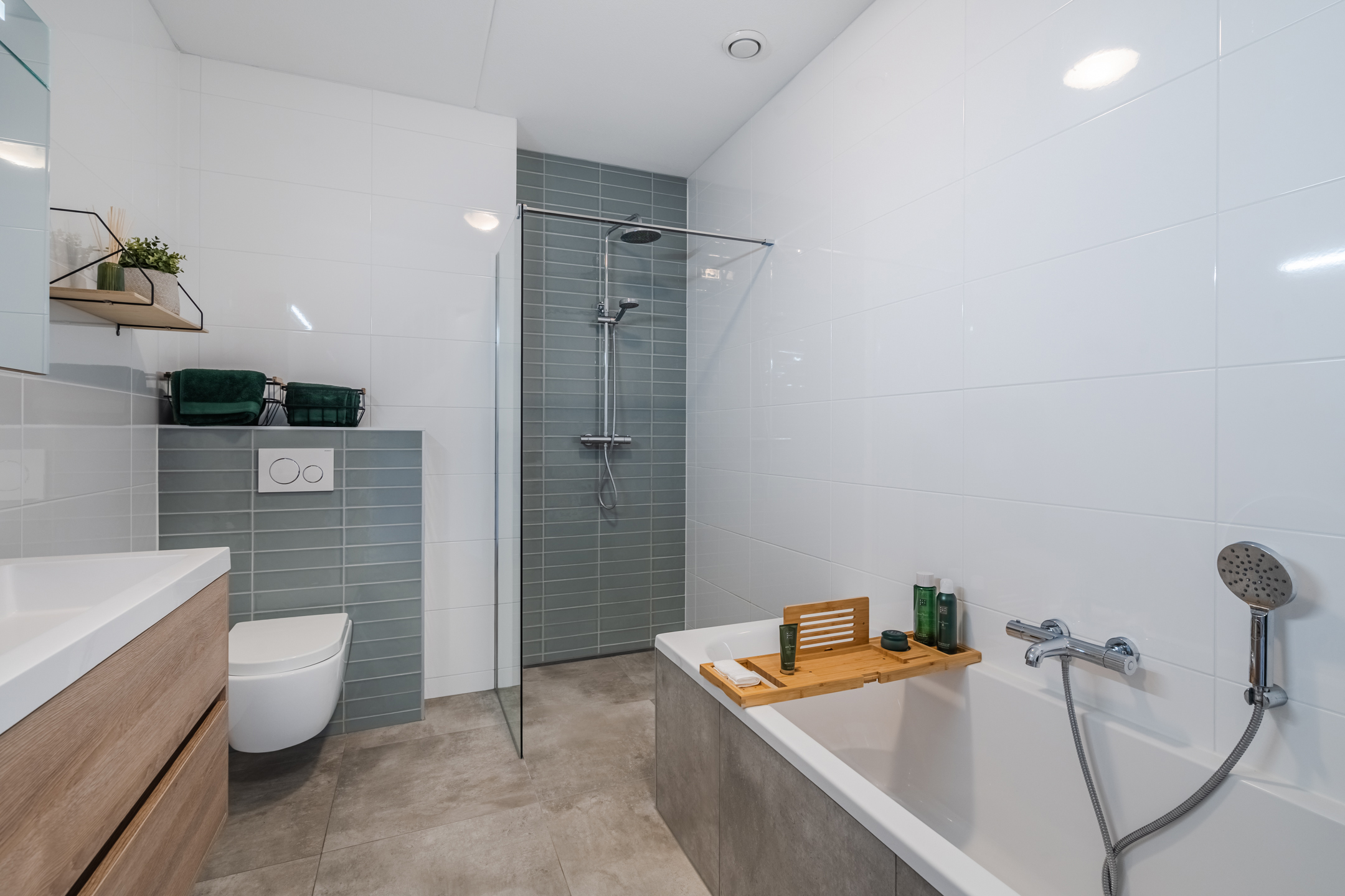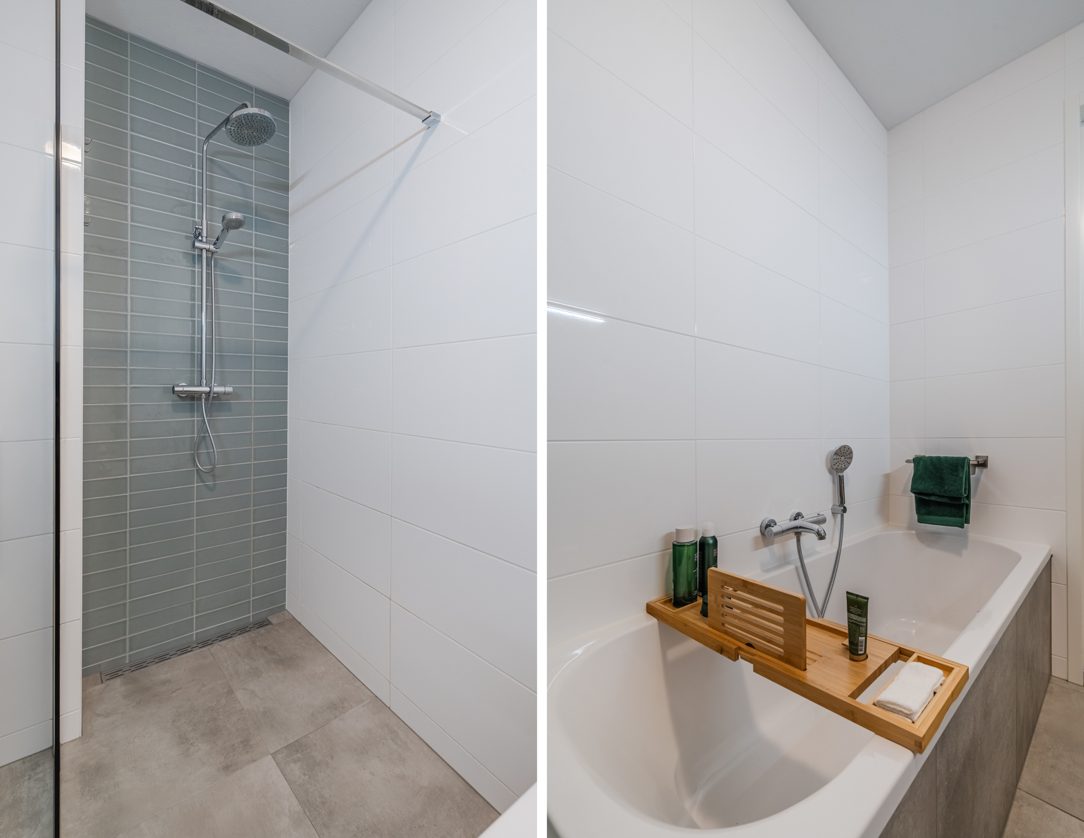 De luxe badkamer (ca. 2,27 x 3,16 m) is strak vormgegeven en uitgevoerd in een smaakvolle vloer- en wandbetegeling in een licht, grijs/blauw kleurpallet. Deze ruimte is voorzien van een ligbad, een ruime inloopdouche met regendouche, een breed badkamermeubel en spiegelkast met verlichting. De badkamer wordt verwarmd middels vloerverwarming en is aan te sturen middels de thermosstaat.