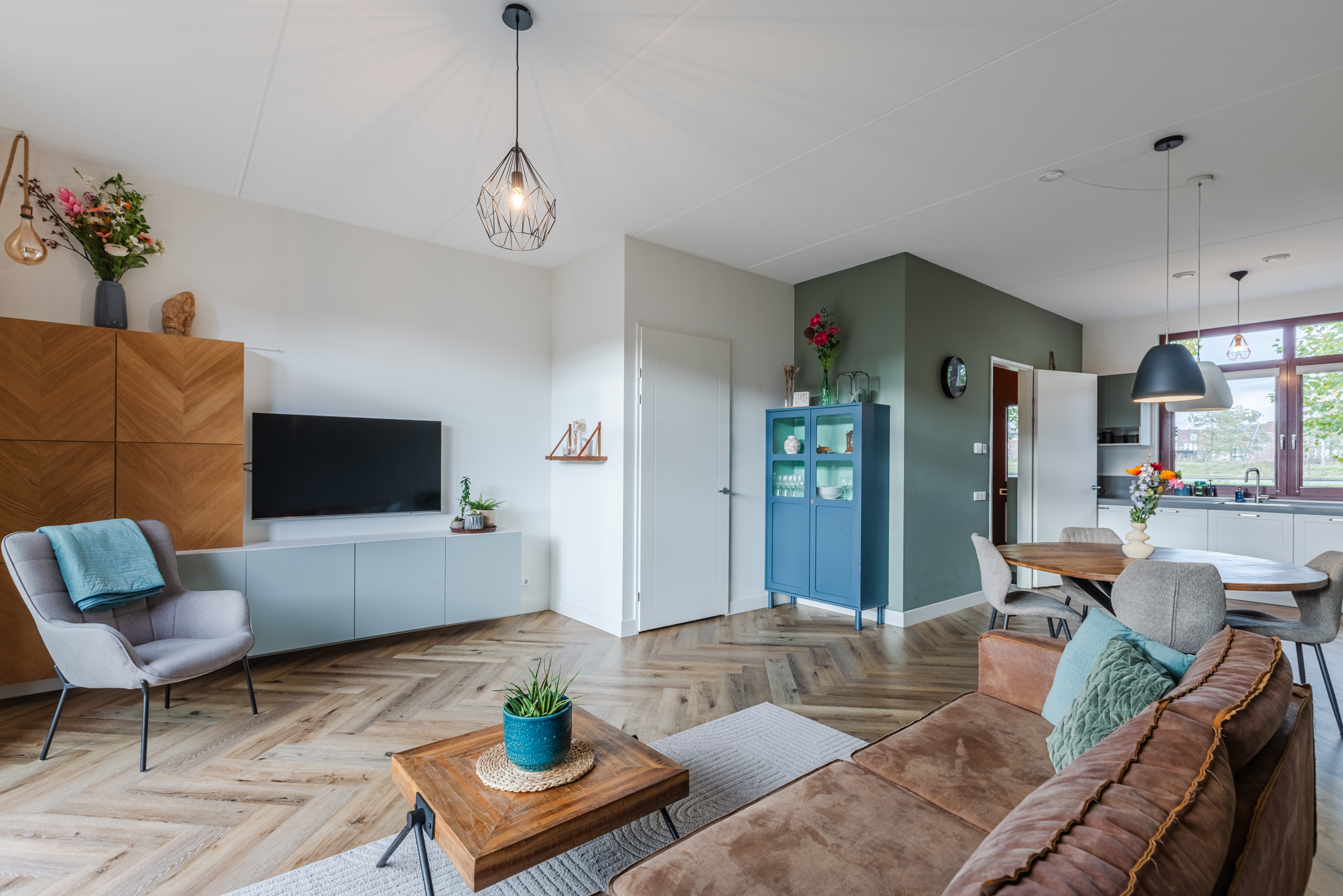 De gehele begane grond beschikt over een strakke wandafwerking en een sfeervolle PVC-vloer in visgraatmotief, voorzien van comfortabele vloerverwarming én vloerverkoeling. Kortom een perfecte basis voor elk interieur!