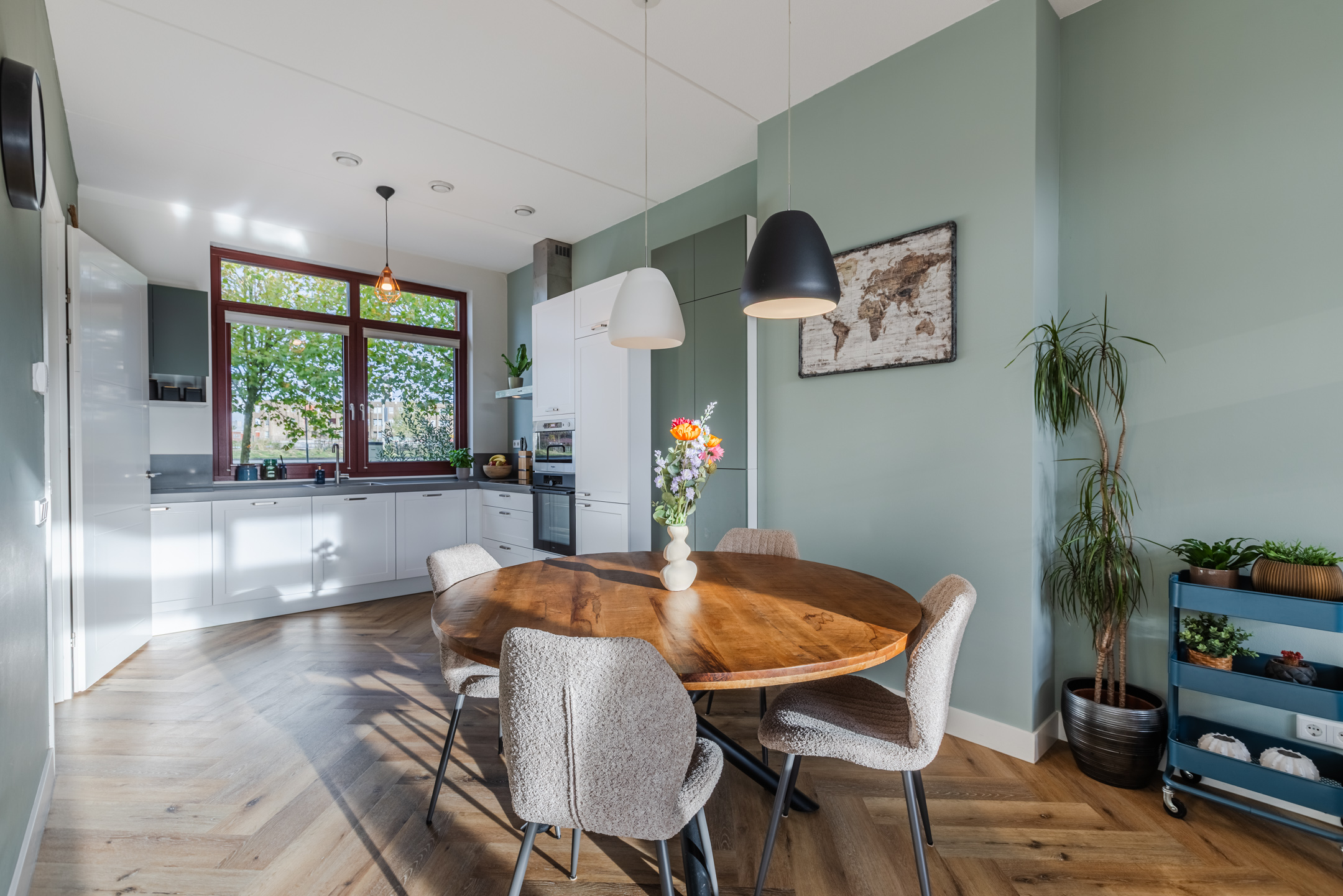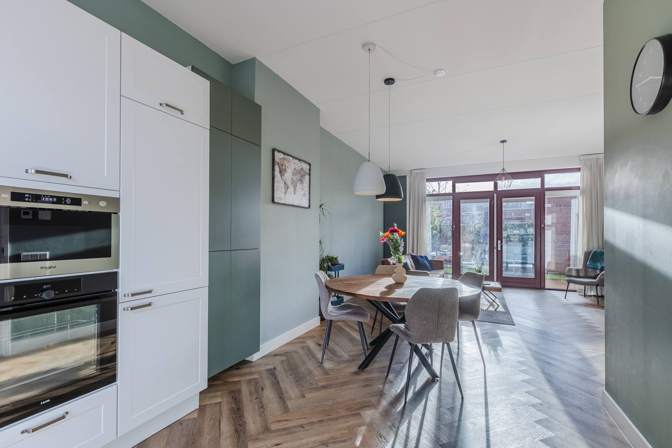 Er is volop ruimte voor een grote eettafel, waar je met vrienden en familie heerlijk lang kunt tafelen. Dankzij de open indeling blijft er een fijne verbinding tussen de keuken en de woonkamer. De eettafel vormt daarmee letterlijk én figuurlijk het hart van deze lichte, uitnodigende leefruimte.