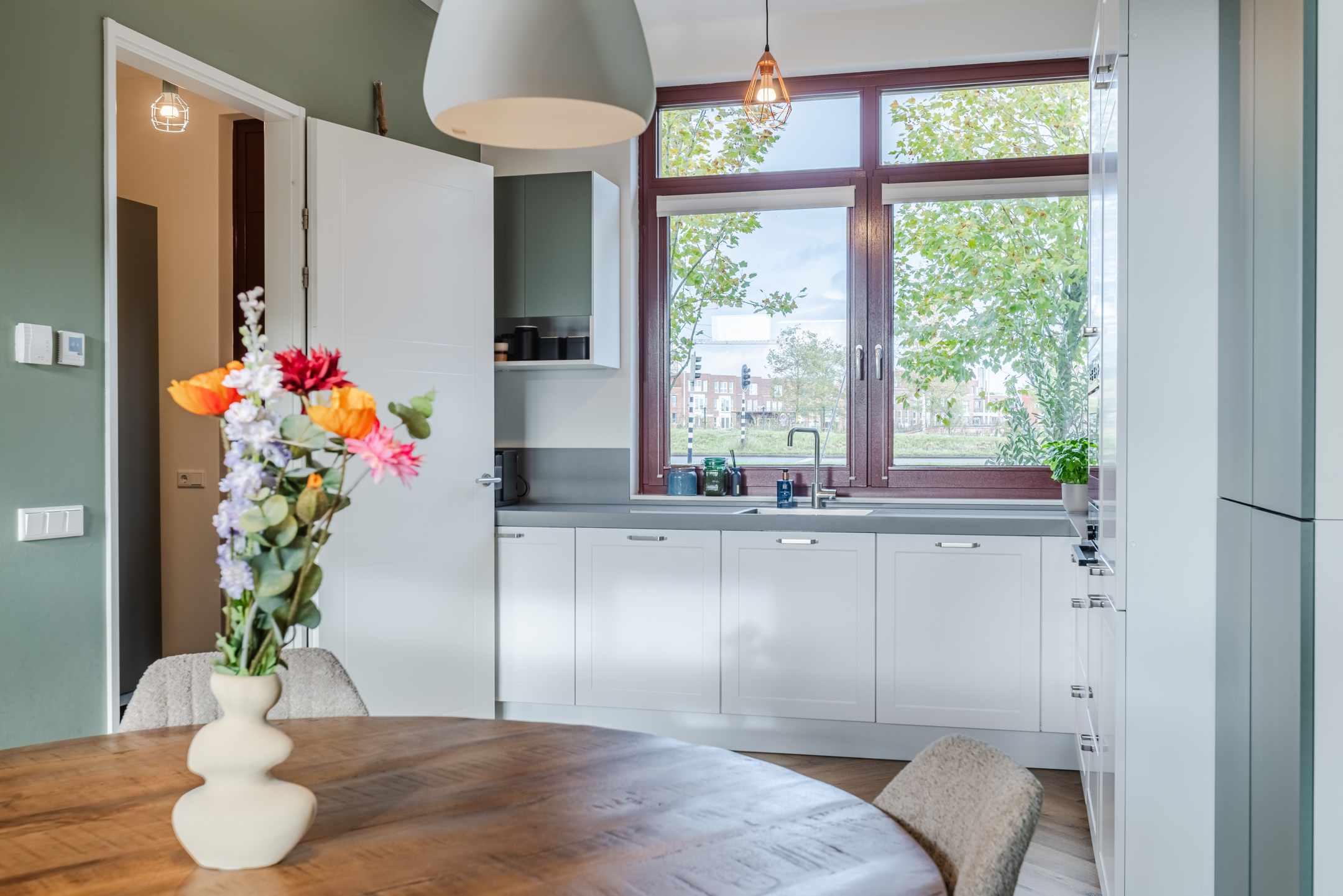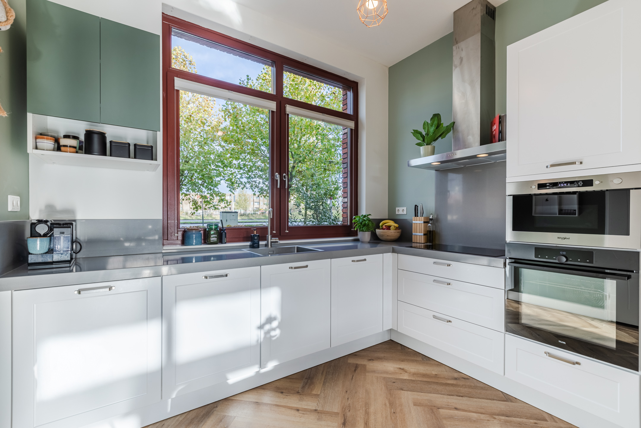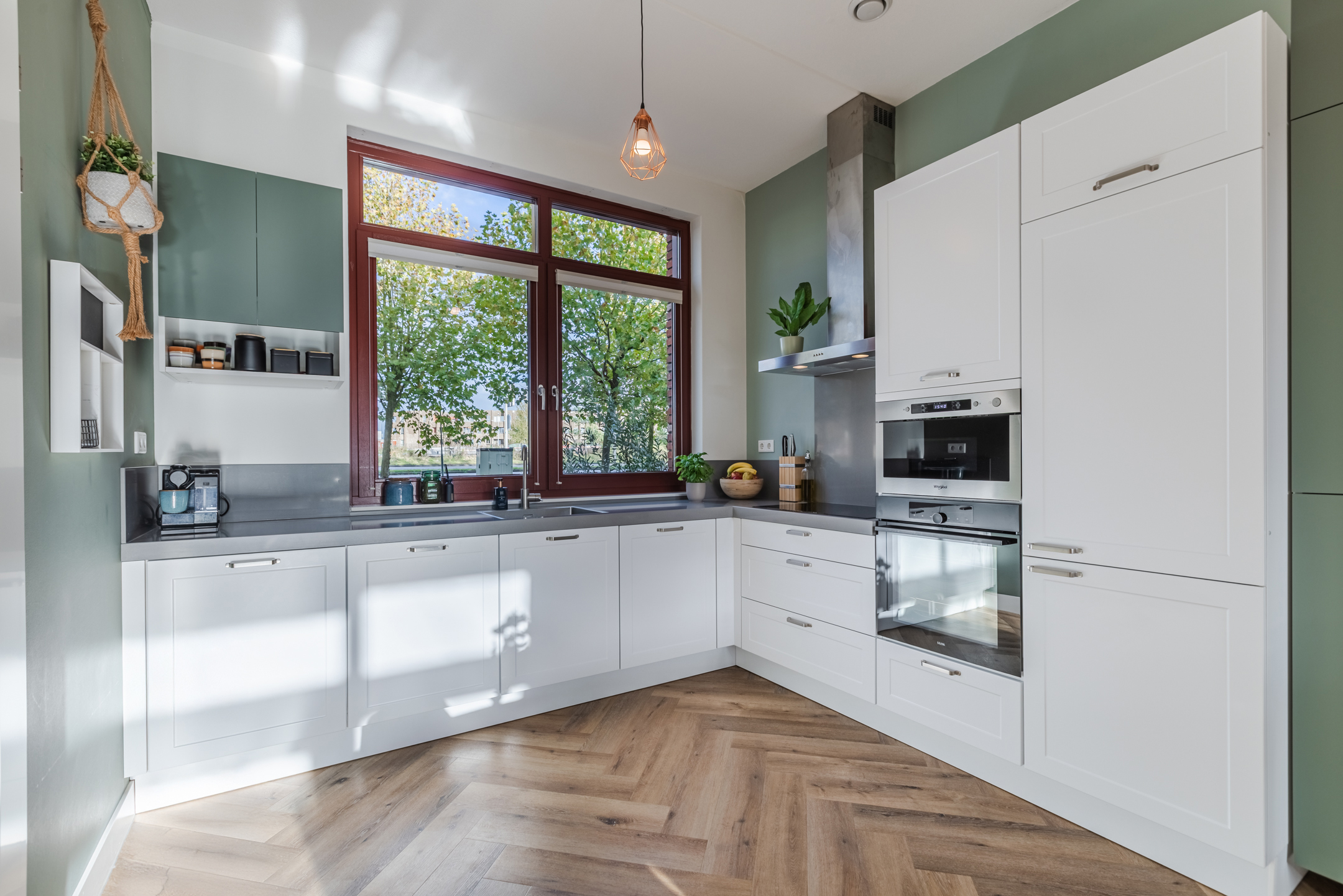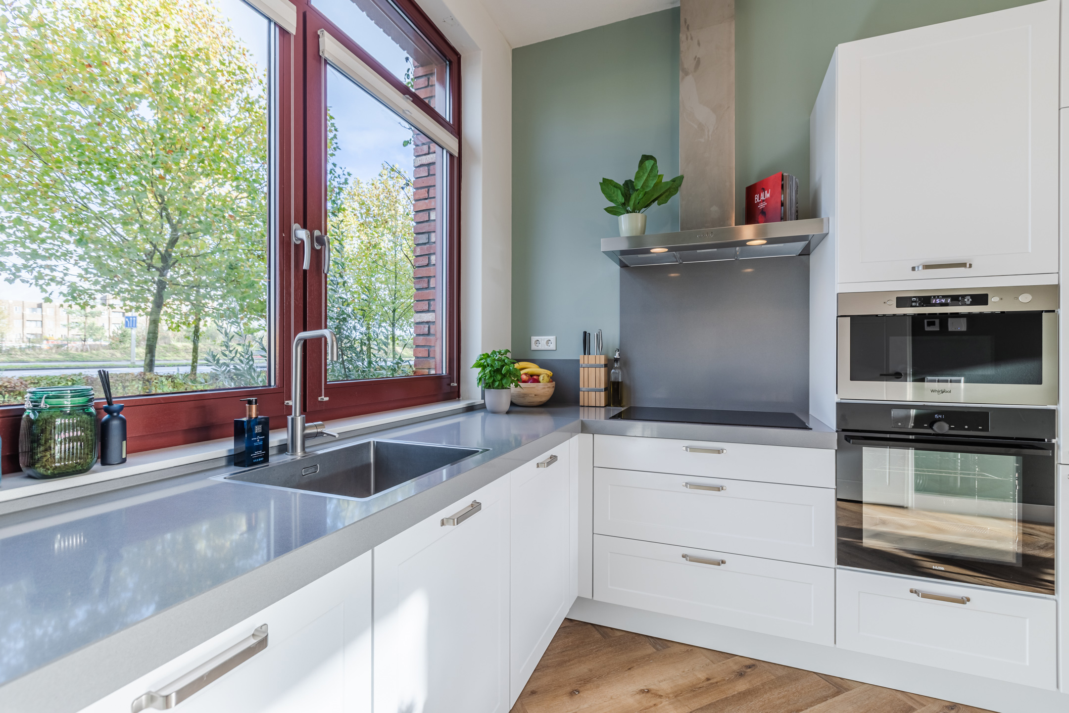 Aan de voorzijde van de woning bevindt zich de moderne en strakke keuken (ca. 12 m2) welke beschikt over een grote raampartij voor een natuurlijke lichtinval en fraai zicht op het groen en de straat. De moderne keuken (geplaatst in 2019) is opgesteld in een ruime L-opstelling en uitgevoerd in een moderne kleurstelling met witte fronten, een stoer antracieten composiet blad en rvs handgrepen. Verder is de keuken voorzien van alle wenselijke inbouwapparatuur, te weten: een 4-pits inductiekookplaat, een oven, een magnetron, een koel/-vriescombinatie, een vaatwasser en een rvs-afzuigkap. Direct naast de keuken heeft de huidige eigenaar extra bergruimte gecreëerd door het plaatsen van de smaakvolle wandkasten.