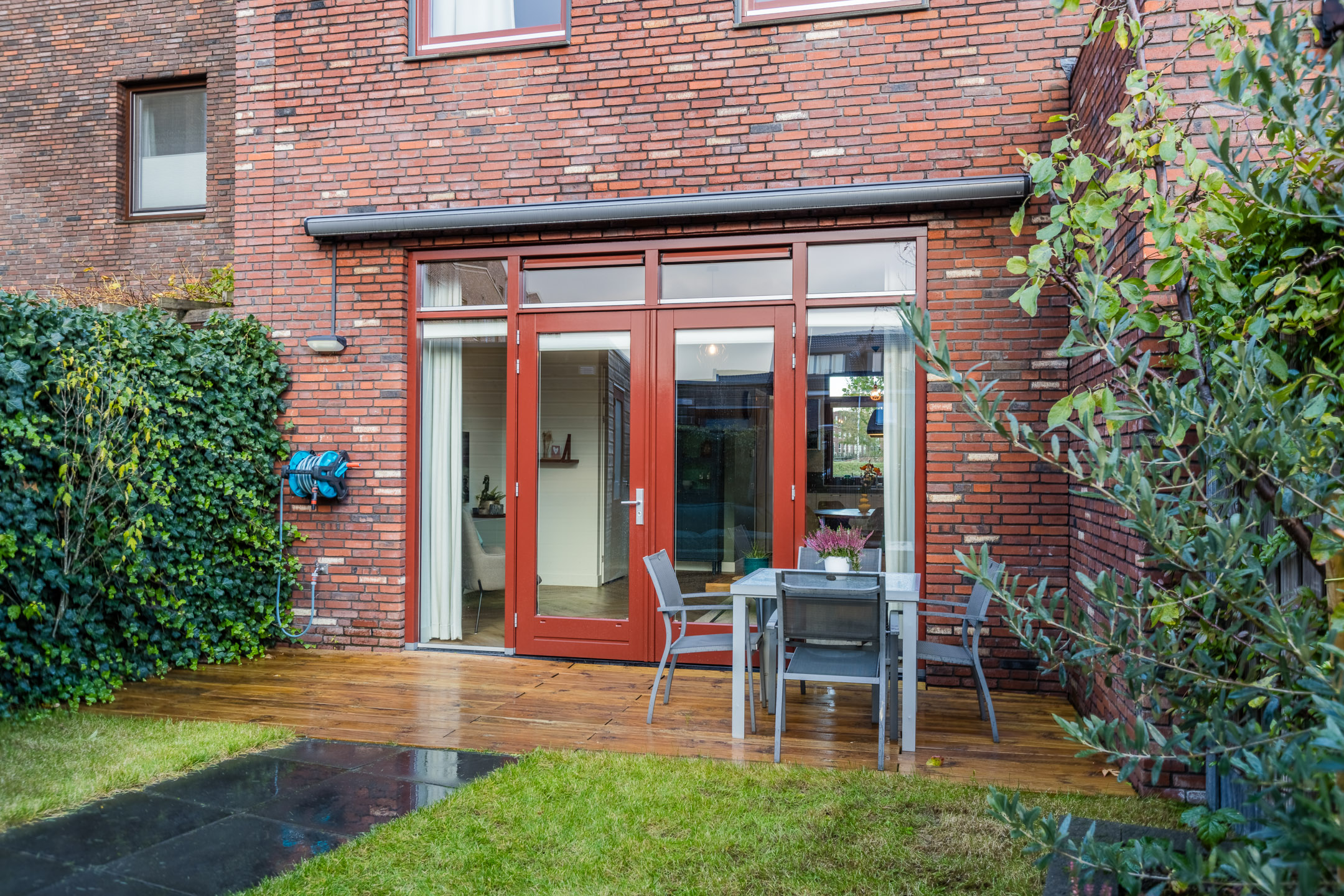 De zonnige achtertuin is gesitueerd op het zuidwesten, waardoor je vanaf het begin van de middag tot laat in de avond kunt genieten van de zon. Het charmante terras met houten vlonderdelen vormt een fijne plek om heerlijk te genieten van een drankje of de barbecue aan te steken op een zwoele zomeravond. In de achtergevel is een buitenkraan aanwezig om de tuin in de zomermaanden goed te kunnen onderhouden. Daarnaast beschikt de tuin over een elektrisch zonnescherm, een goed onderhouden gazon en fraaie plantenborders. Deze plantenborders zorgen voor een kleurrijk geheel van lente tot en met zomer. De vrijstaande houten berging zorgt voor voldoende bergruimte en is voorzien van elektra.