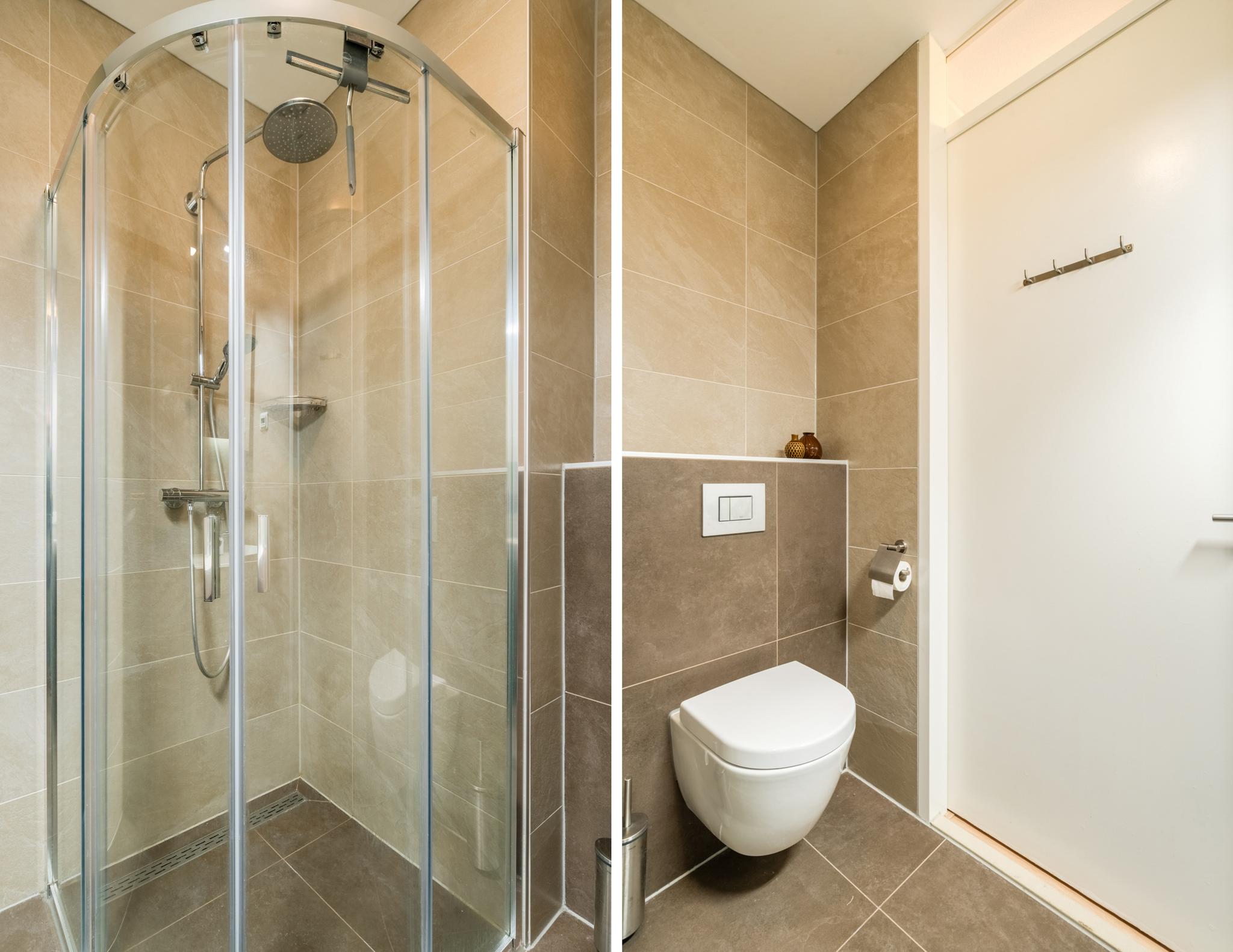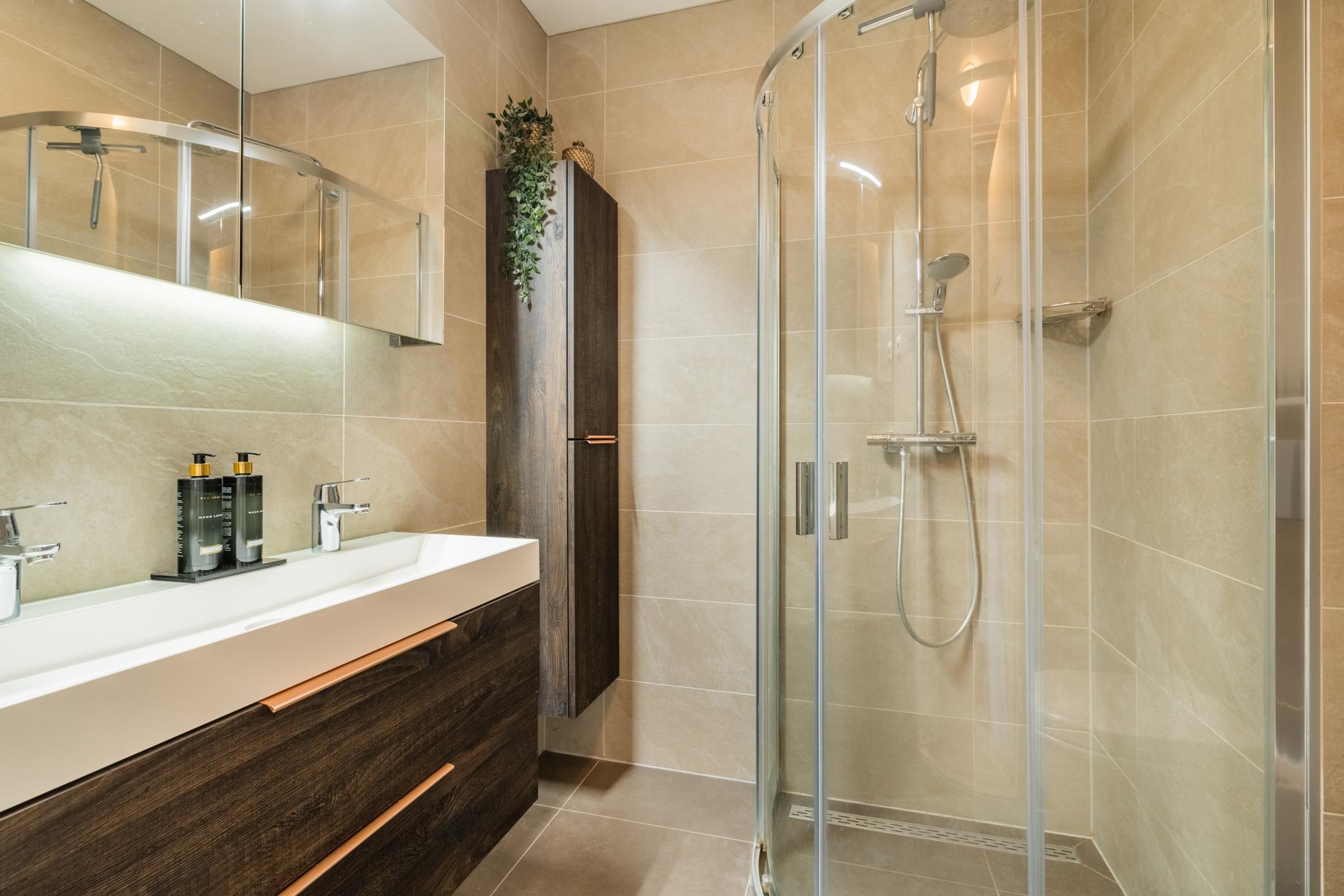 De strakke en complete, inpandige badkamer (ca. 4 m²) is volledig gerenoveerd in 2021 en is voorzien van een douchecabine, moderne dubbele wastafel met wastafelmeubel, badkamerkast, vloerverwarming, hangend toilet en mechanische ventilatie. De badkamer is uitgevoerd in een moderne beige/bruine kleurstelling met smaakvolle houten meubels.