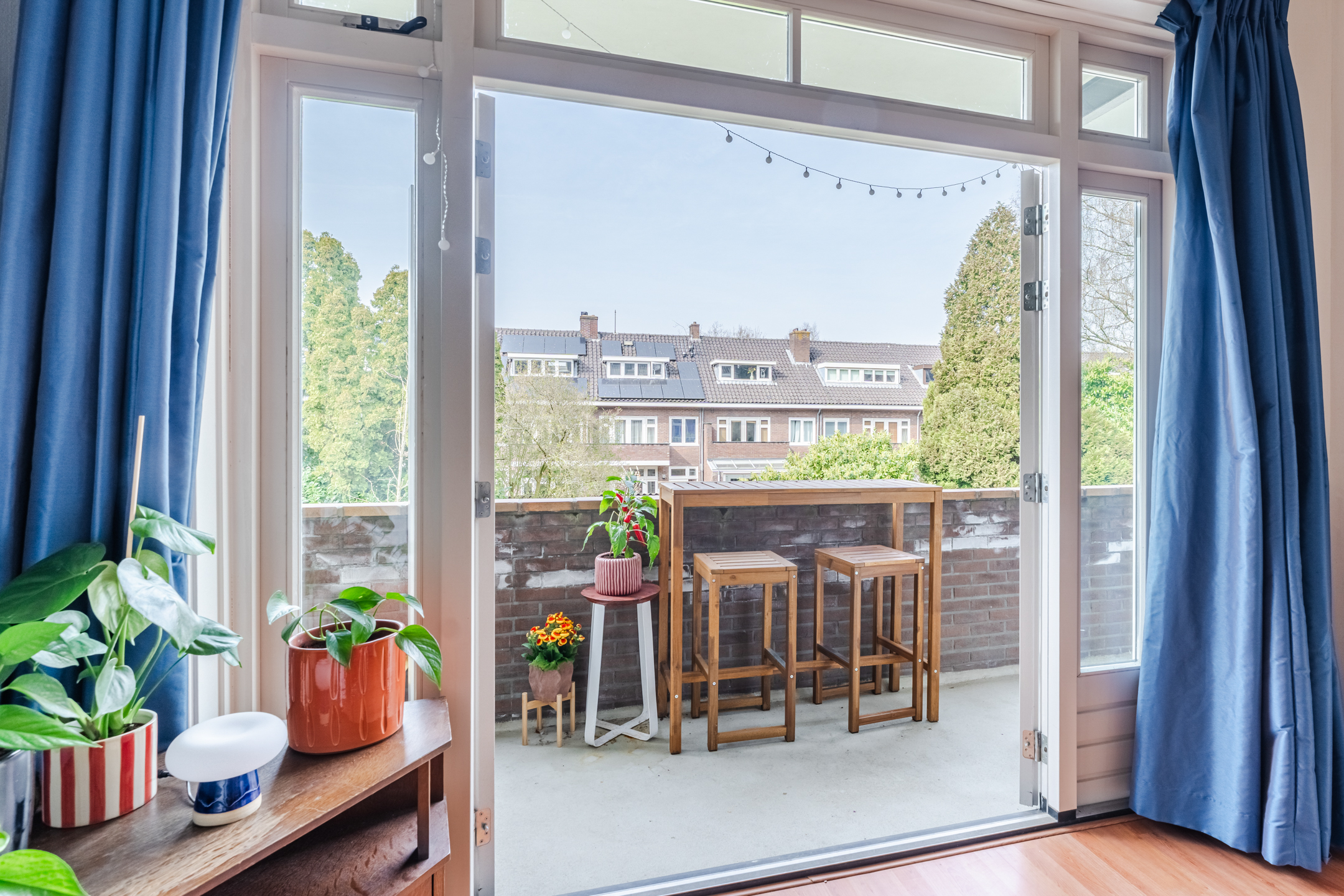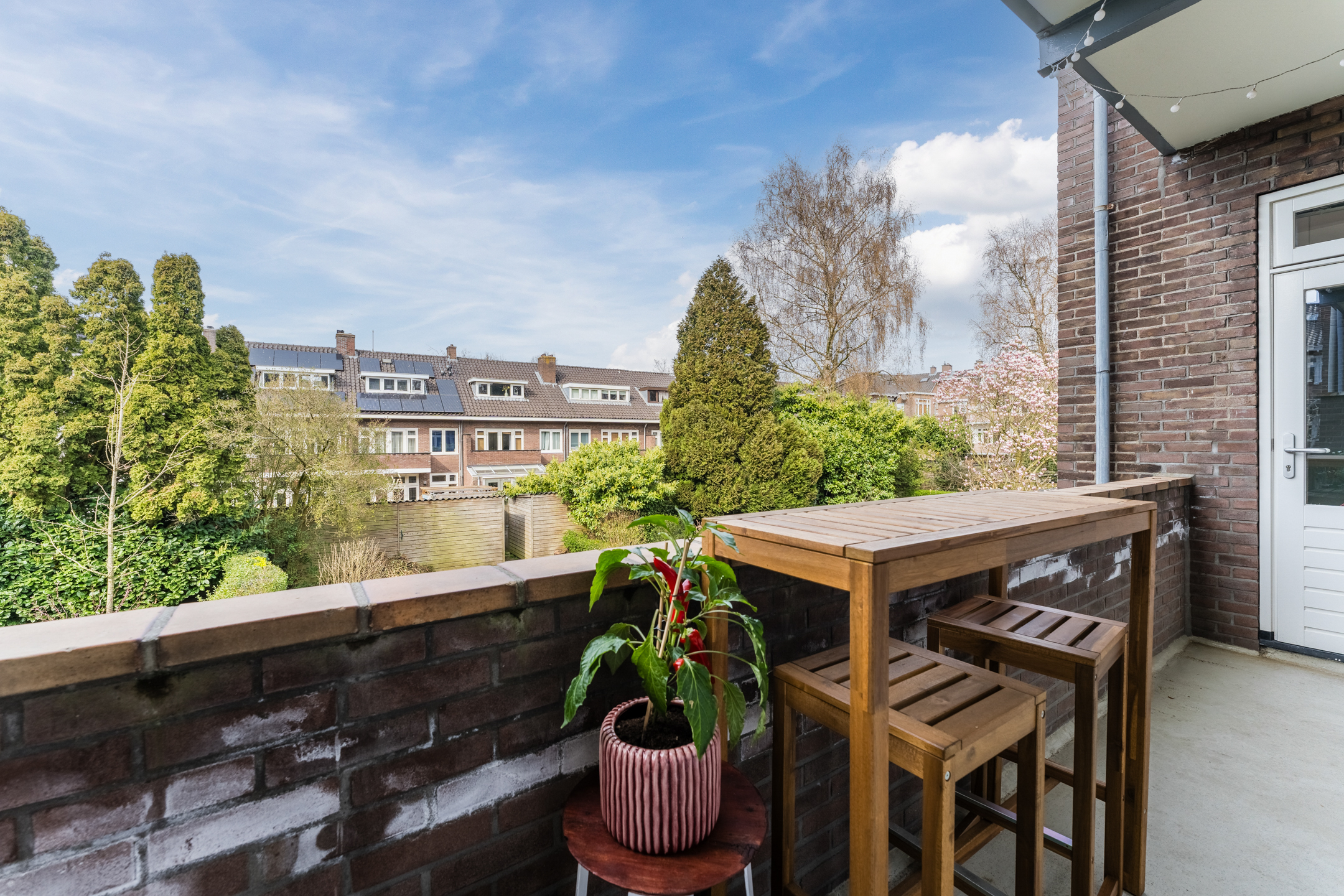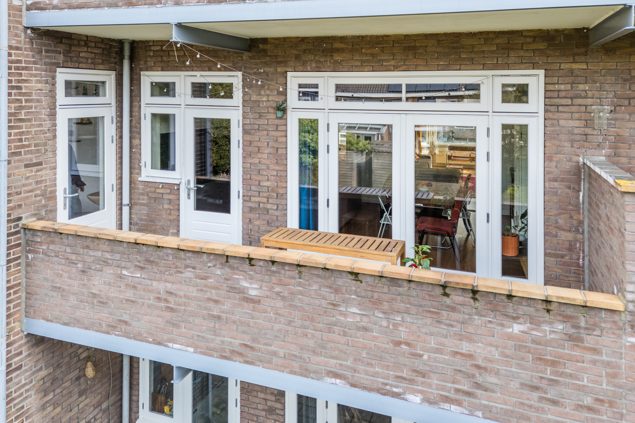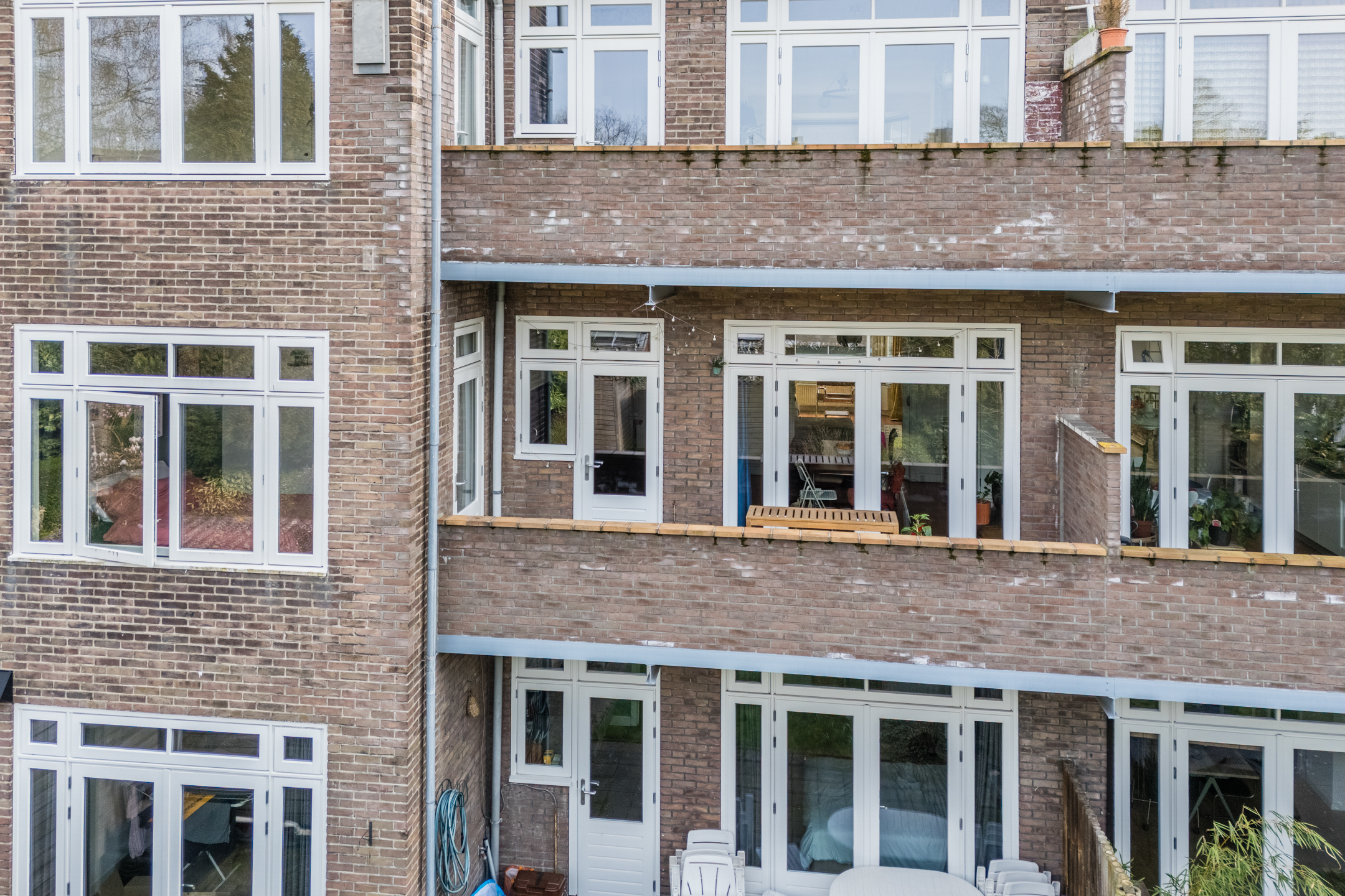 Aan beide zijden van de woning bevindt zich een charmant balkon, waardoor er altijd wel een fijn plekje in de zon te vinden is. Aan de achterzijde kijk je vrij weg over het groen van de omliggende tuinen en de hoge bomen, je merkt bijna niet dat je zo dicht bij de stad woont.