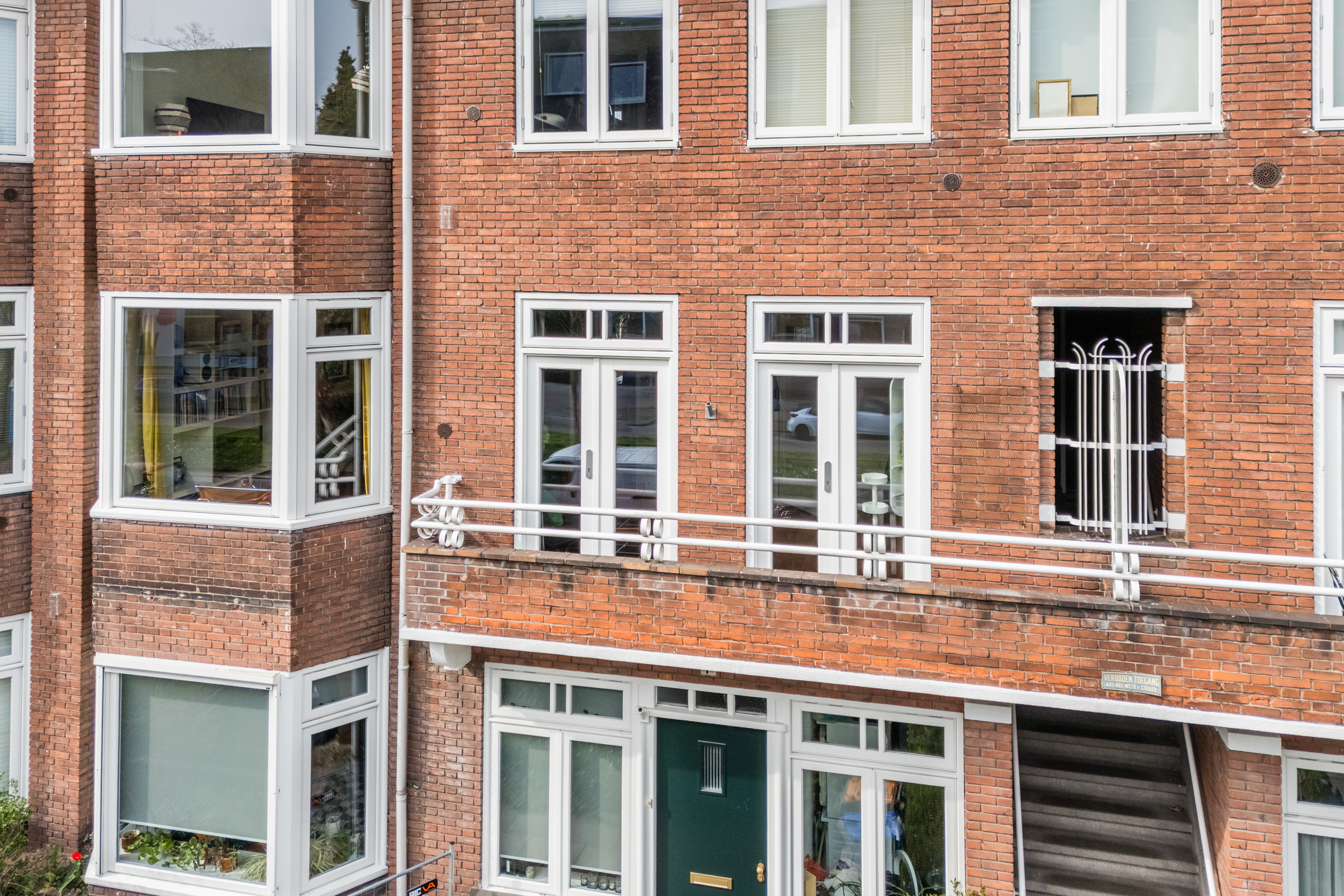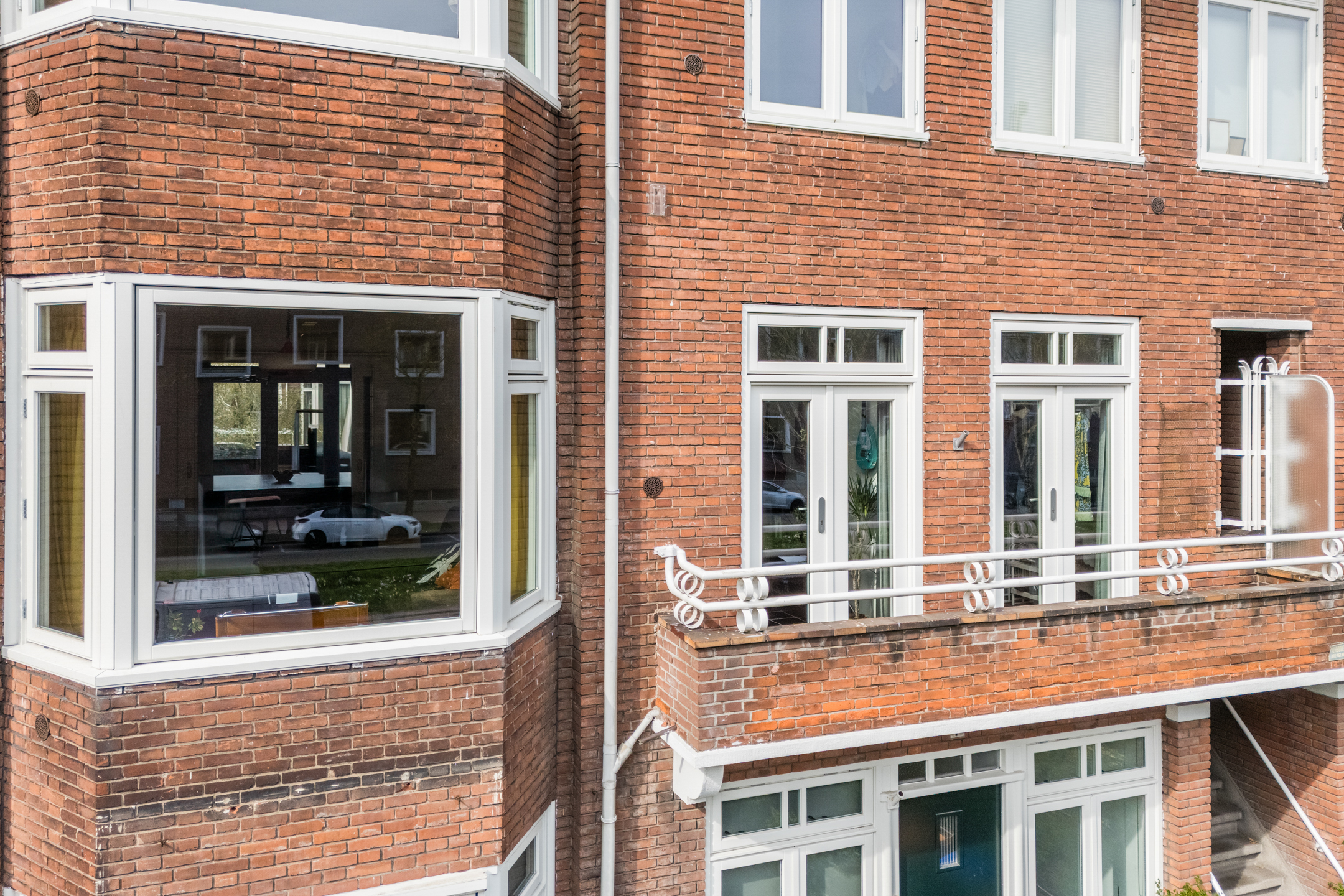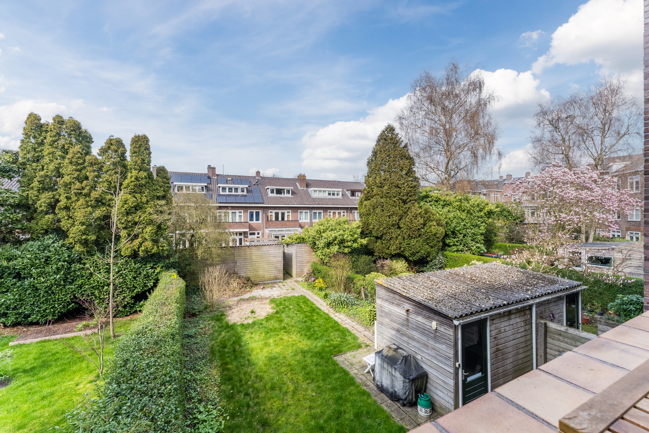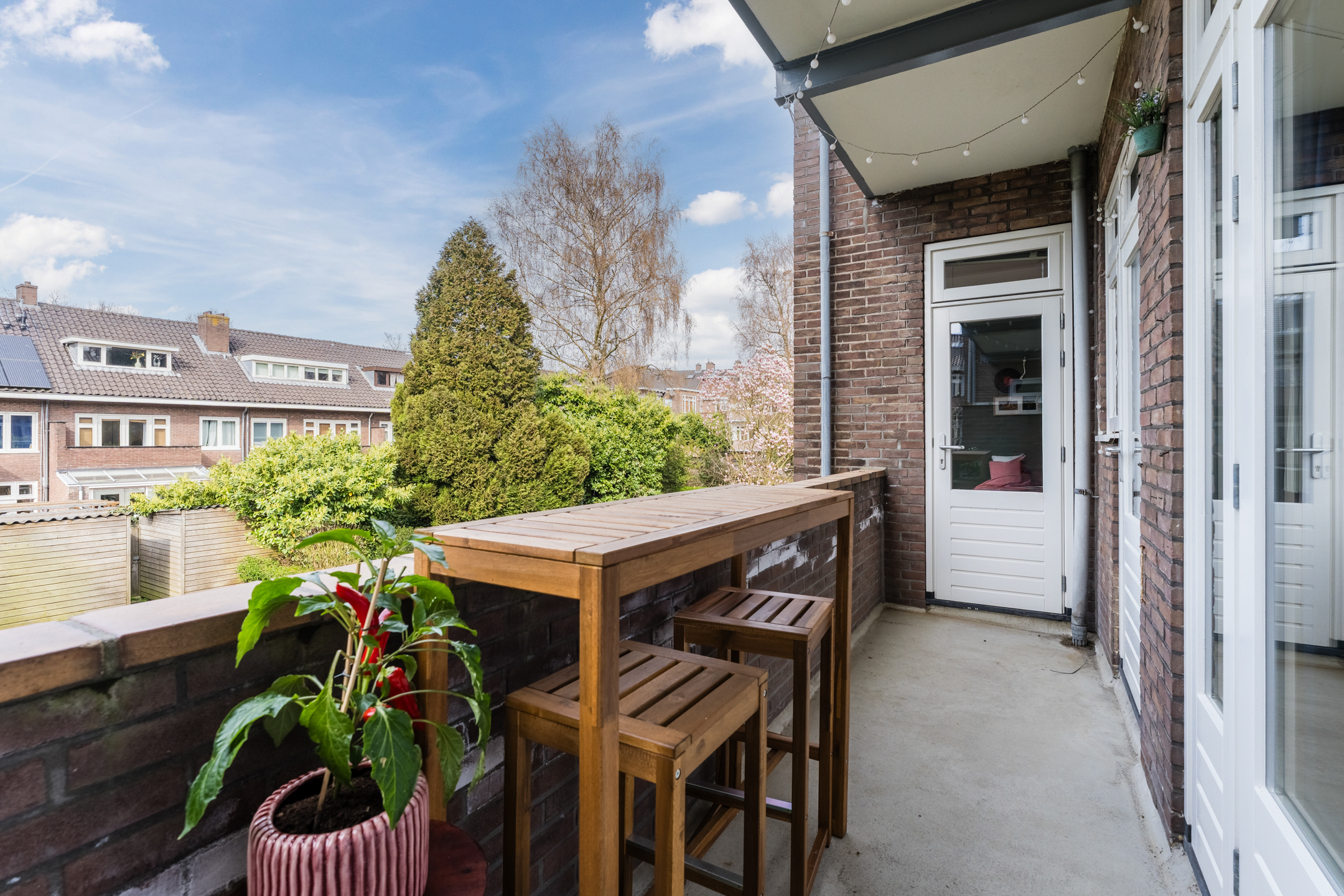 Aan beide zijden van de woning bevindt zich een charmant balkon, waardoor er altijd wel een fijn plekje in de zon te vinden is. Aan de achterzijde kijk je vrij weg over het groen van de omliggende tuinen en de hoge bomen, je merkt bijna niet dat je zo dicht bij de stad woont.