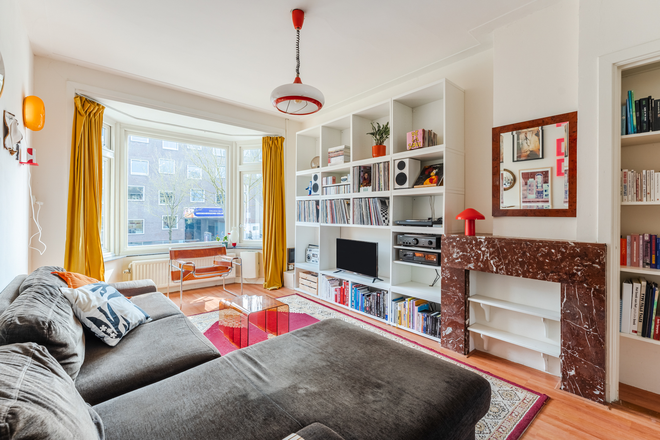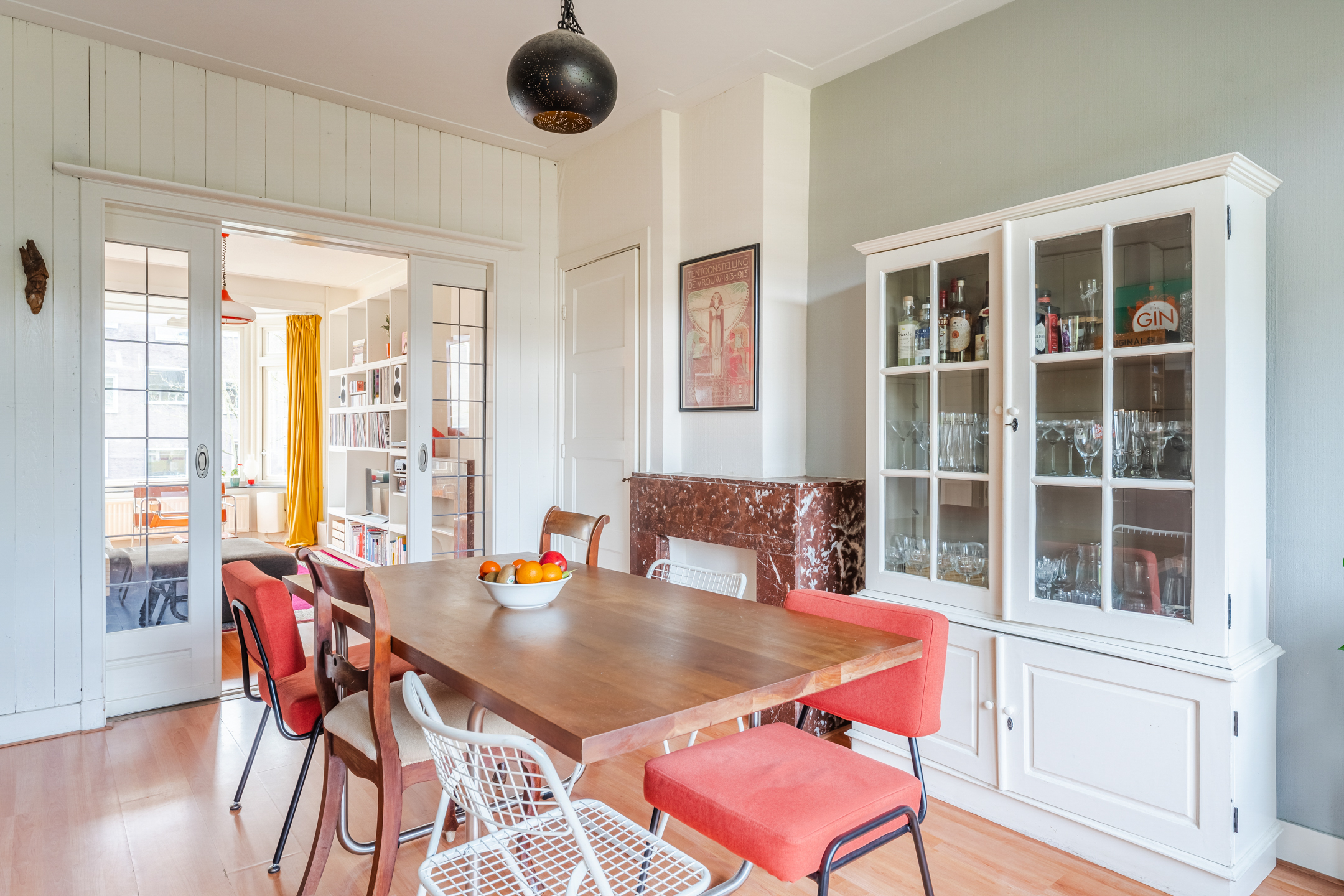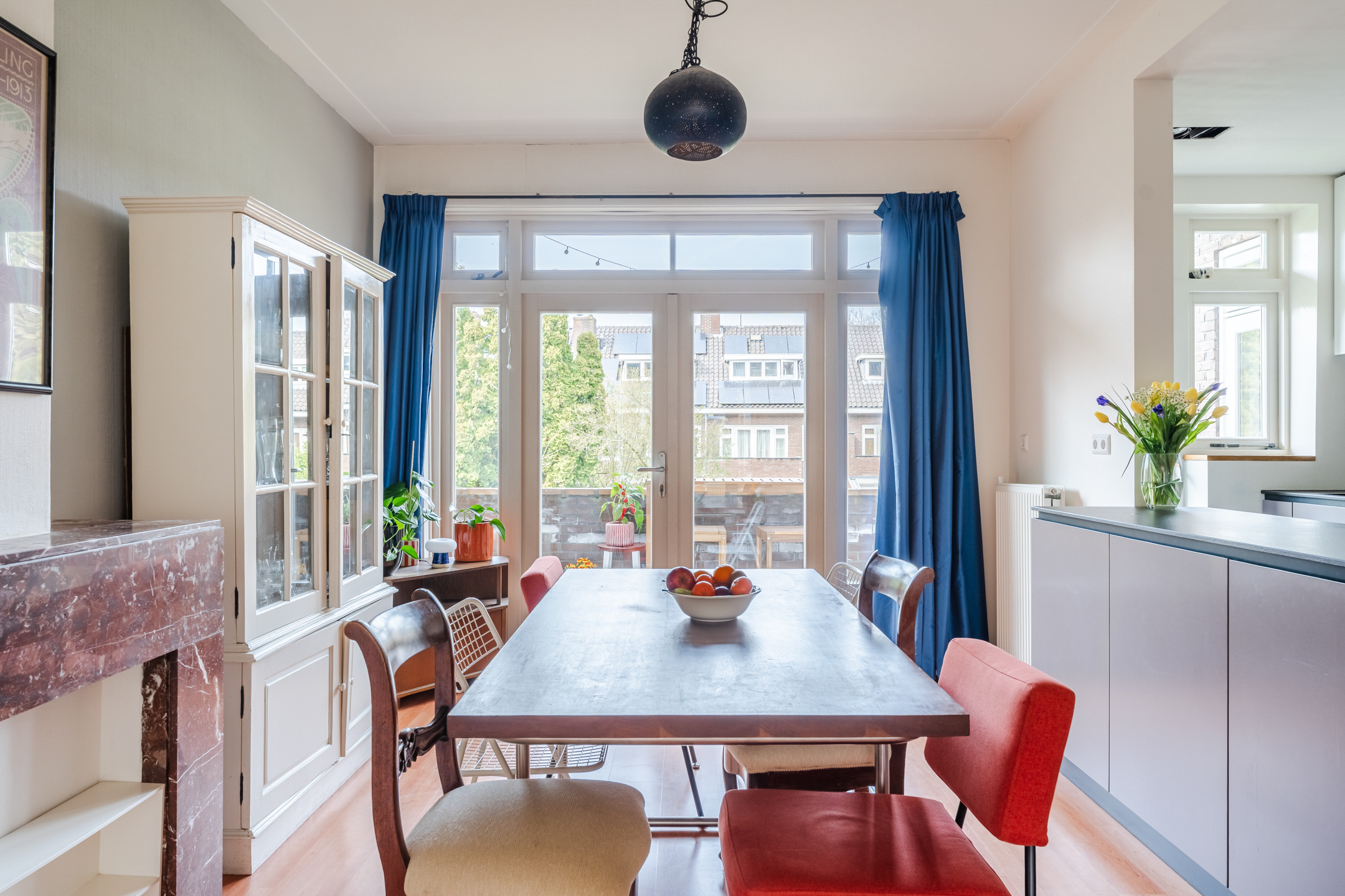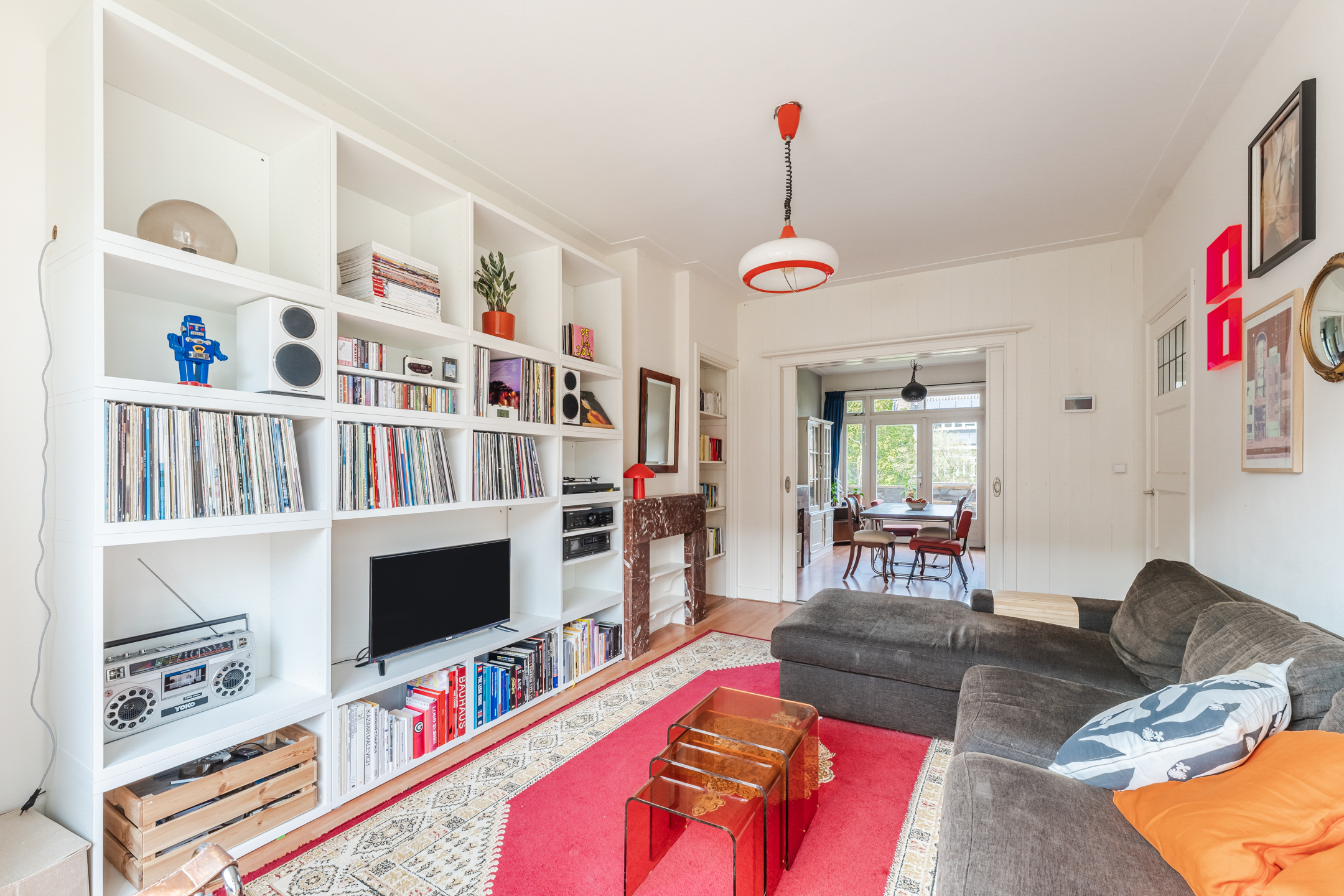 Grenzend aan de eetkamer bereik je, middels twee authentieke en-suitedeuren, de heerlijk lichte woonkamer. De erker en de natuurstenen haard geven deze ruimte extra sfeer en karakter. Vanaf de bank kijk je zo uit op de gezellige Vondellaan.