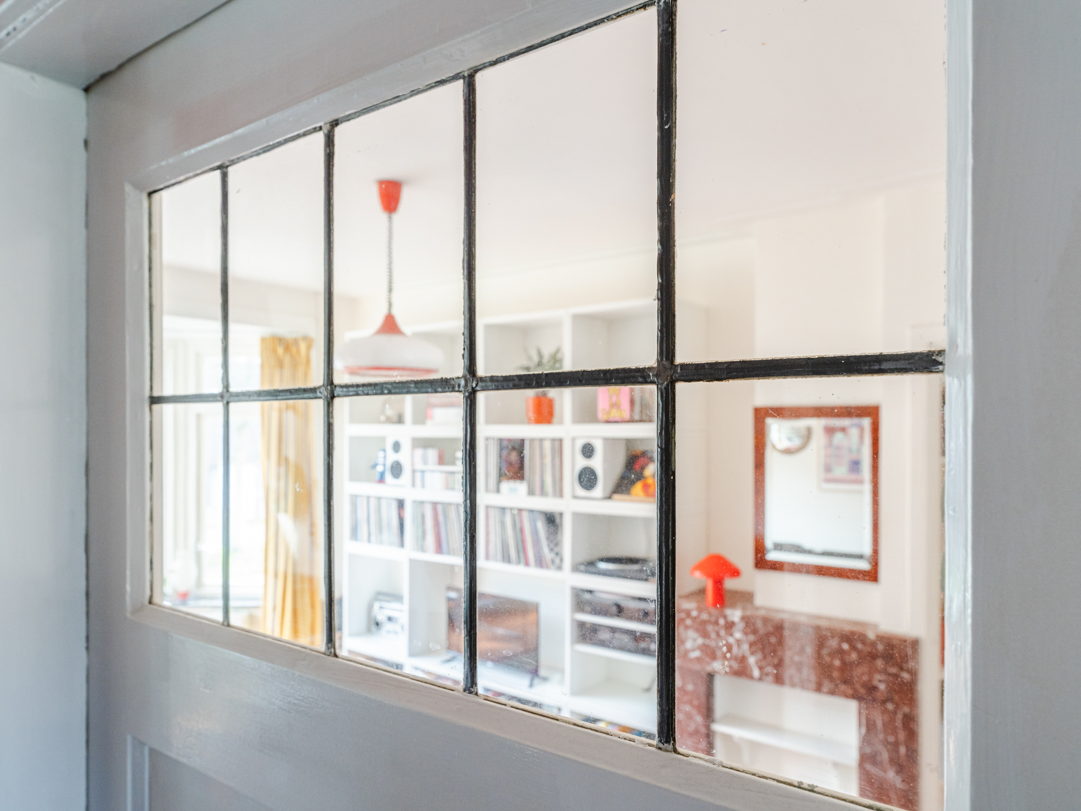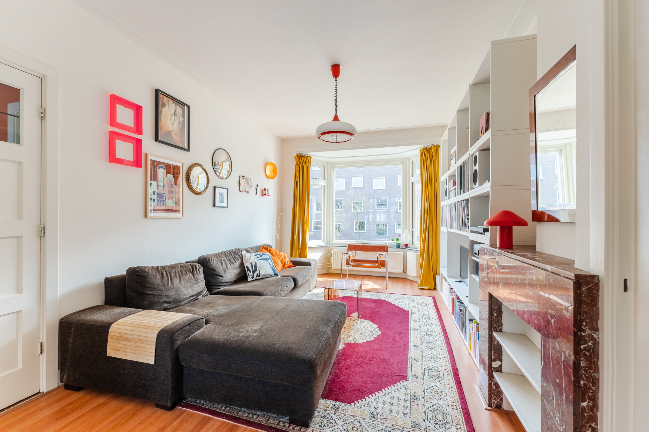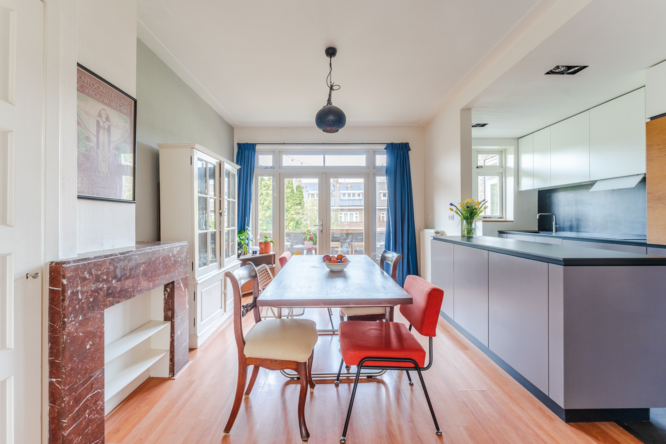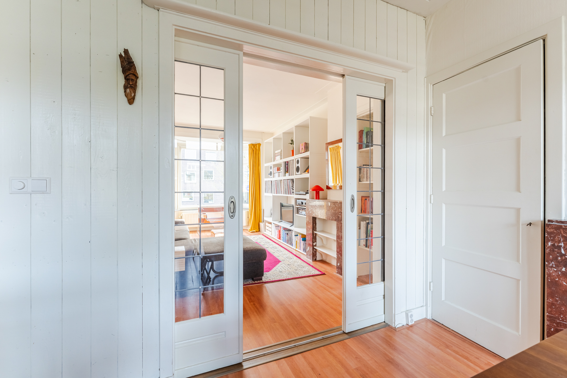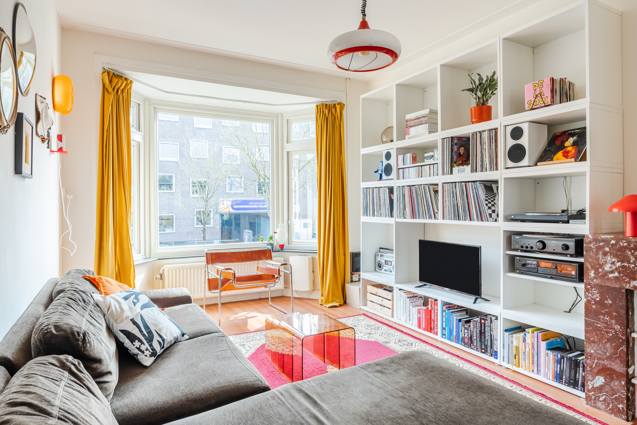 Grenzend aan de eetkamer bereik je, middels twee authentieke en-suitedeuren, de heerlijk lichte woonkamer. De erker en de natuurstenen haard geven deze ruimte extra sfeer en karakter. Vanaf de bank kijk je zo uit op de gezellige Vondellaan.
