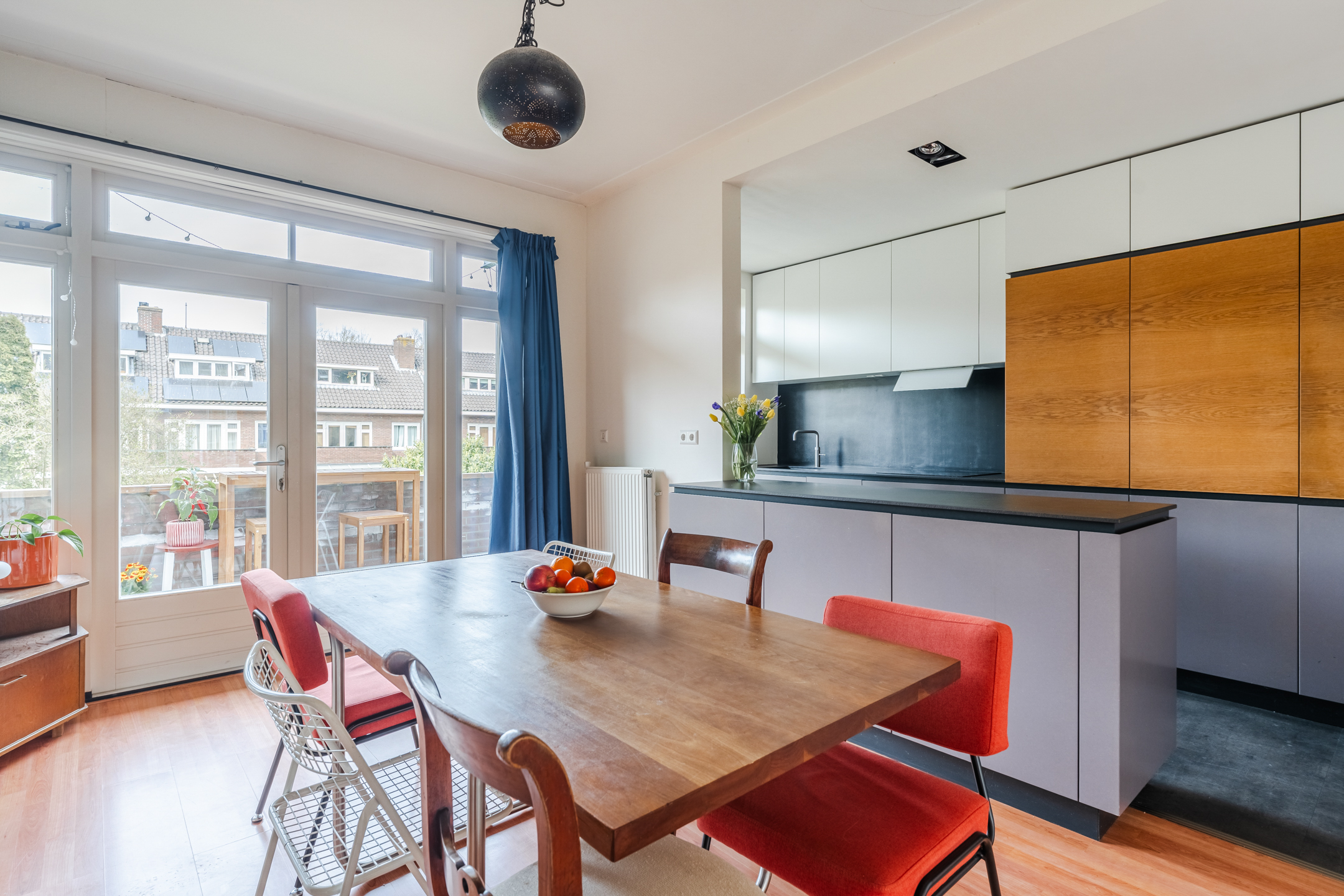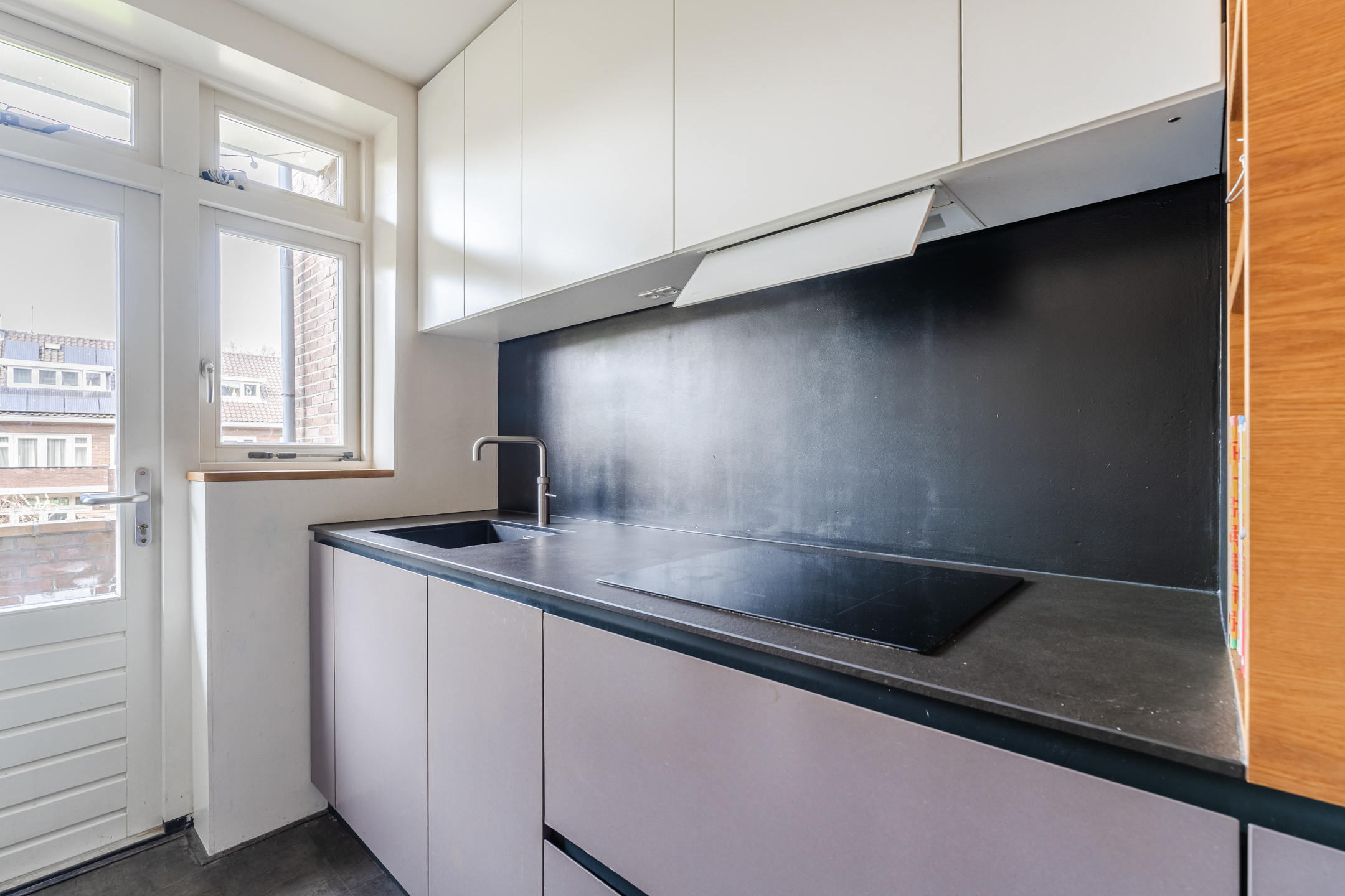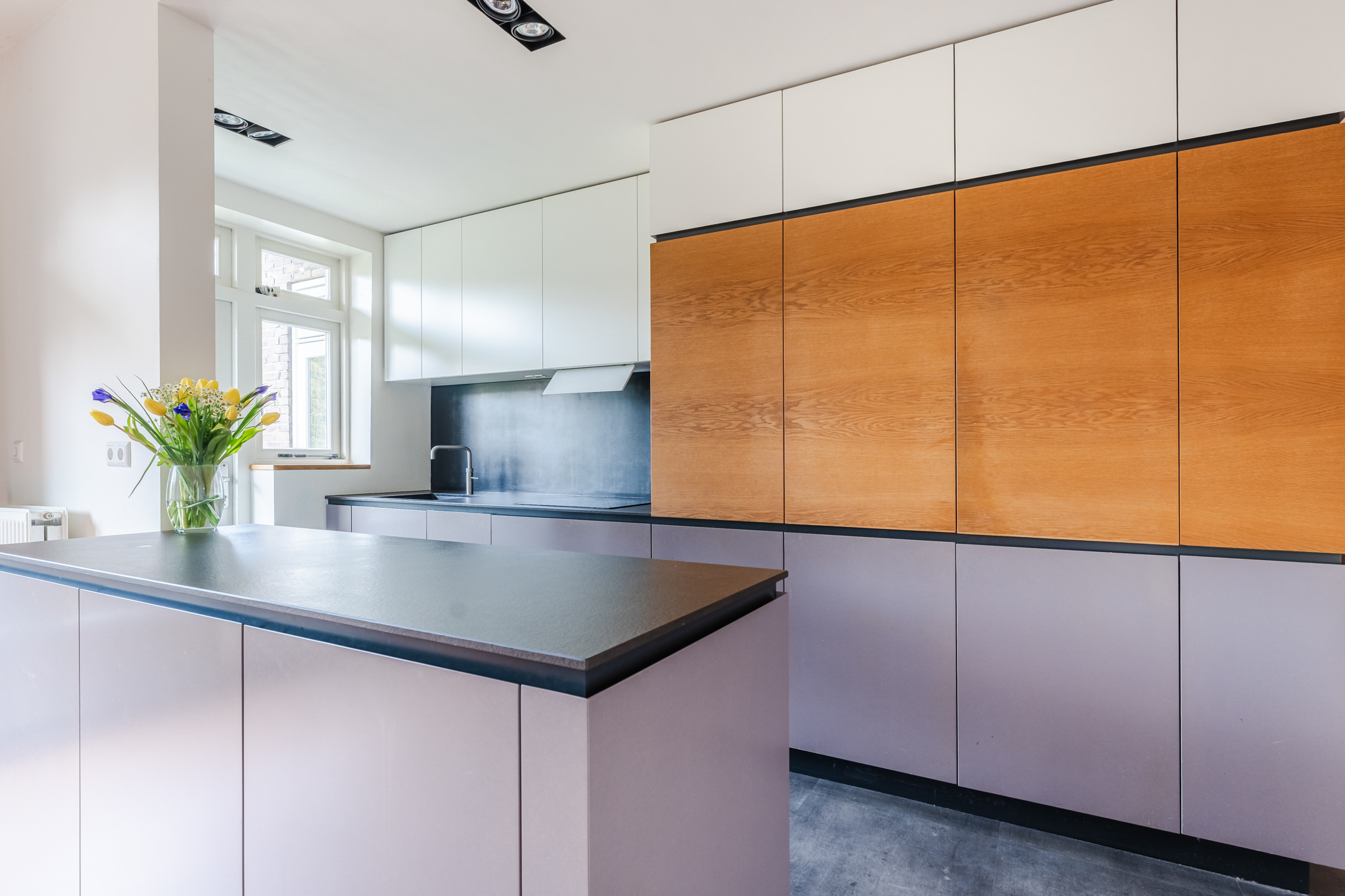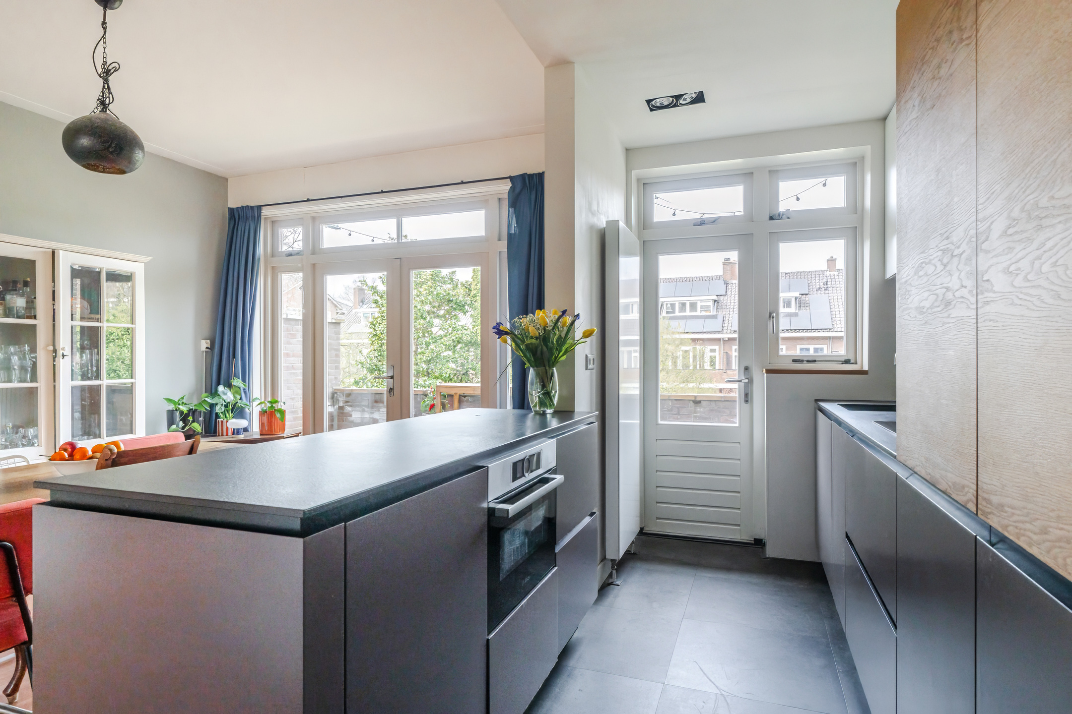 De keuken is uitgevoerd in een speelse kleurstelling, waarbij gebruik is gemaakt van natuurlijke houttinten, strakke witte en grijstinten kasten en een donker natuurstenen werkblad. Door het openbreken van de oorspronkelijk afgesloten keuken is er een enorme hoeveelheid lichtinval ontstaan en is er ruimte gecreëerd voor een royale eethoek. Vanuit hier heb je tevens toegang tot het balkon aan de achterzijde, bereikbaar via twee charmante openslaande deuren.
