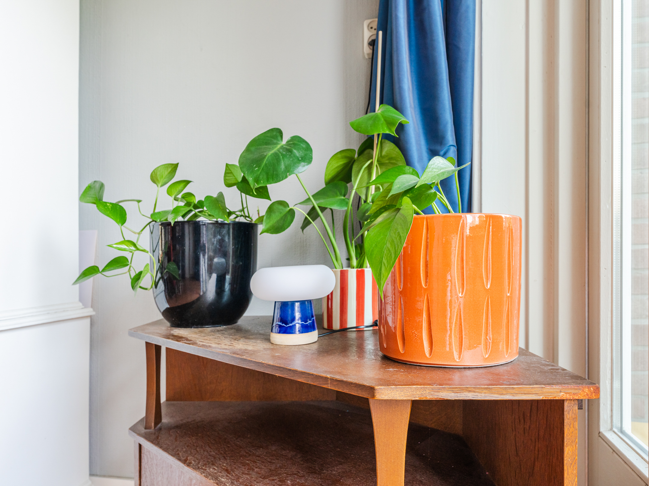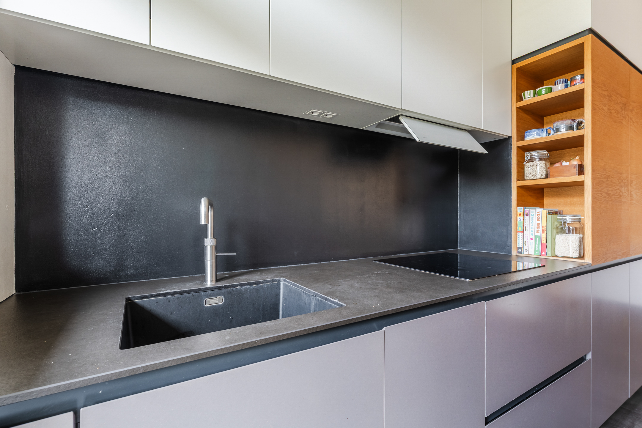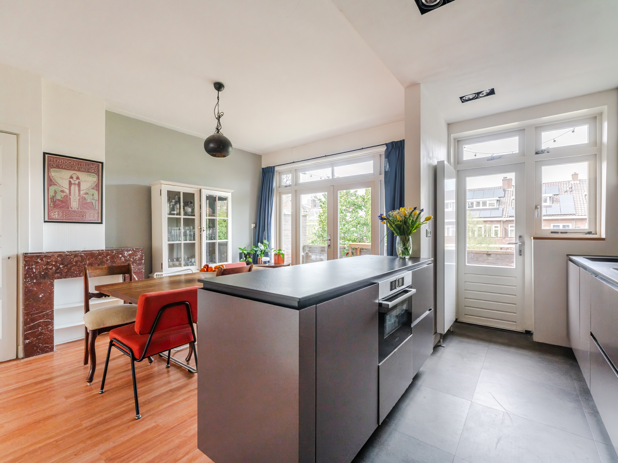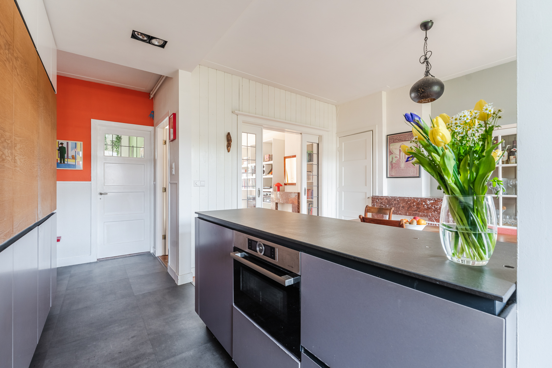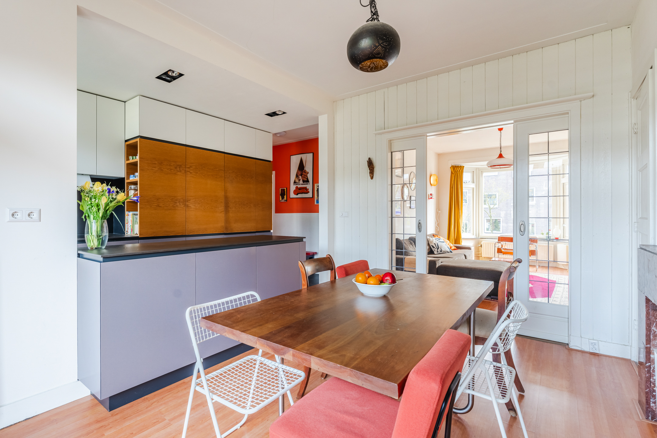 De keuken is uitgevoerd in een speelse kleurstelling, waarbij gebruik is gemaakt van natuurlijke houttinten, strakke witte en grijstinten kasten en een donker natuurstenen werkblad. Door het openbreken van de oorspronkelijk afgesloten keuken is er een enorme hoeveelheid lichtinval ontstaan en is er ruimte gecreëerd voor een royale eethoek. Vanuit hier heb je tevens toegang tot het balkon aan de achterzijde, bereikbaar via twee charmante openslaande deuren.