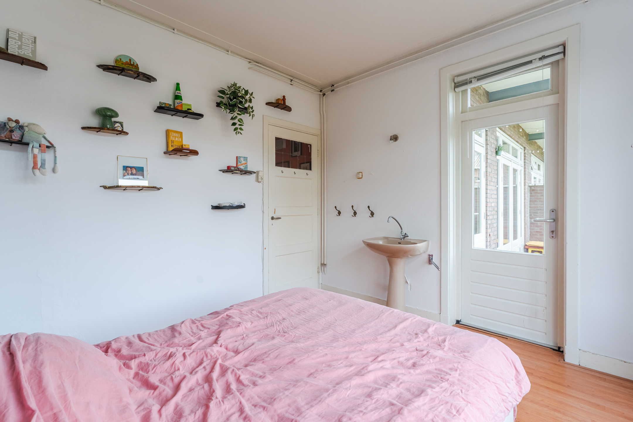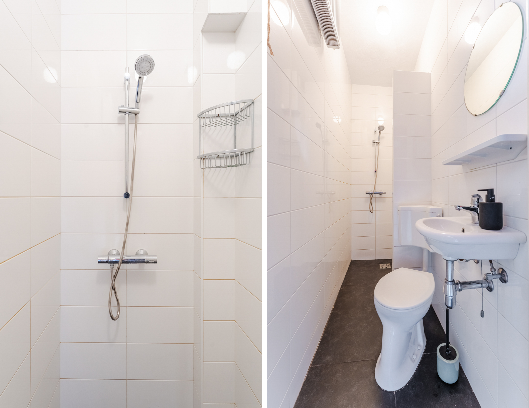 De badkamer is praktisch ingericht en voorzien van een douche en toilet. De vloer in de woning is netjes onderhouden en draagt bij aan de verzorgde uitstraling van het geheel.