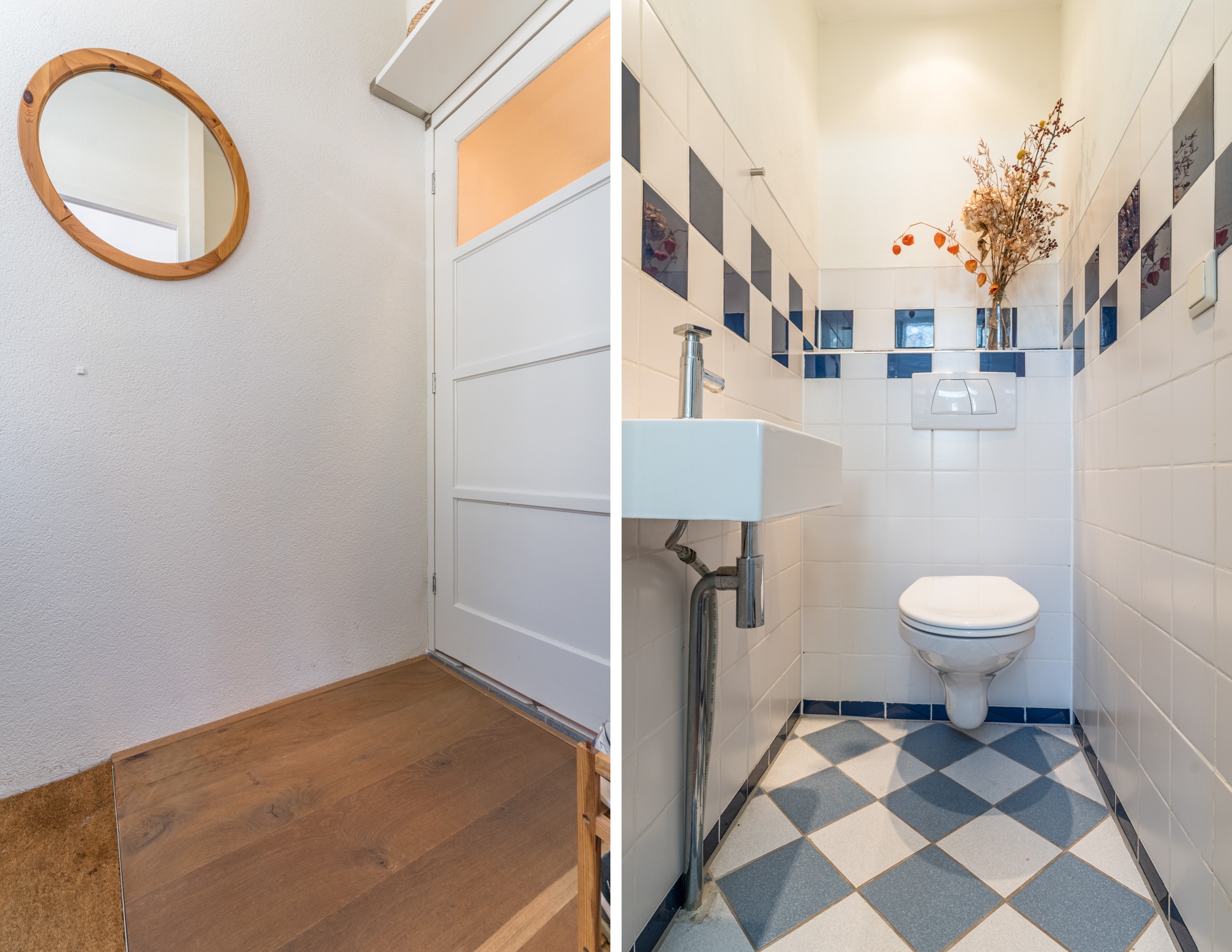 Entree met garderobe, toiletruimte met hangend toilet en fontein en toegang naar de woonkamer.