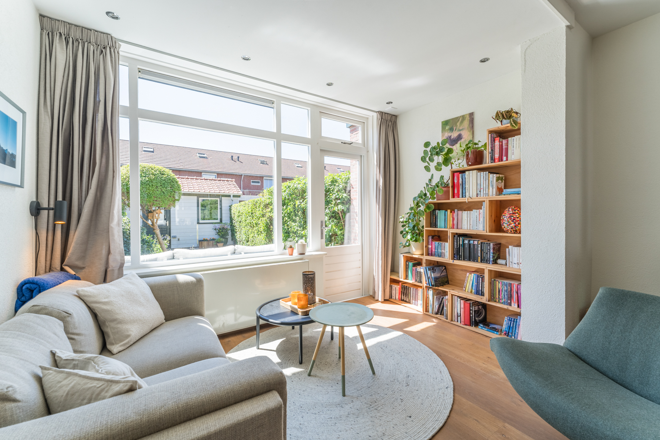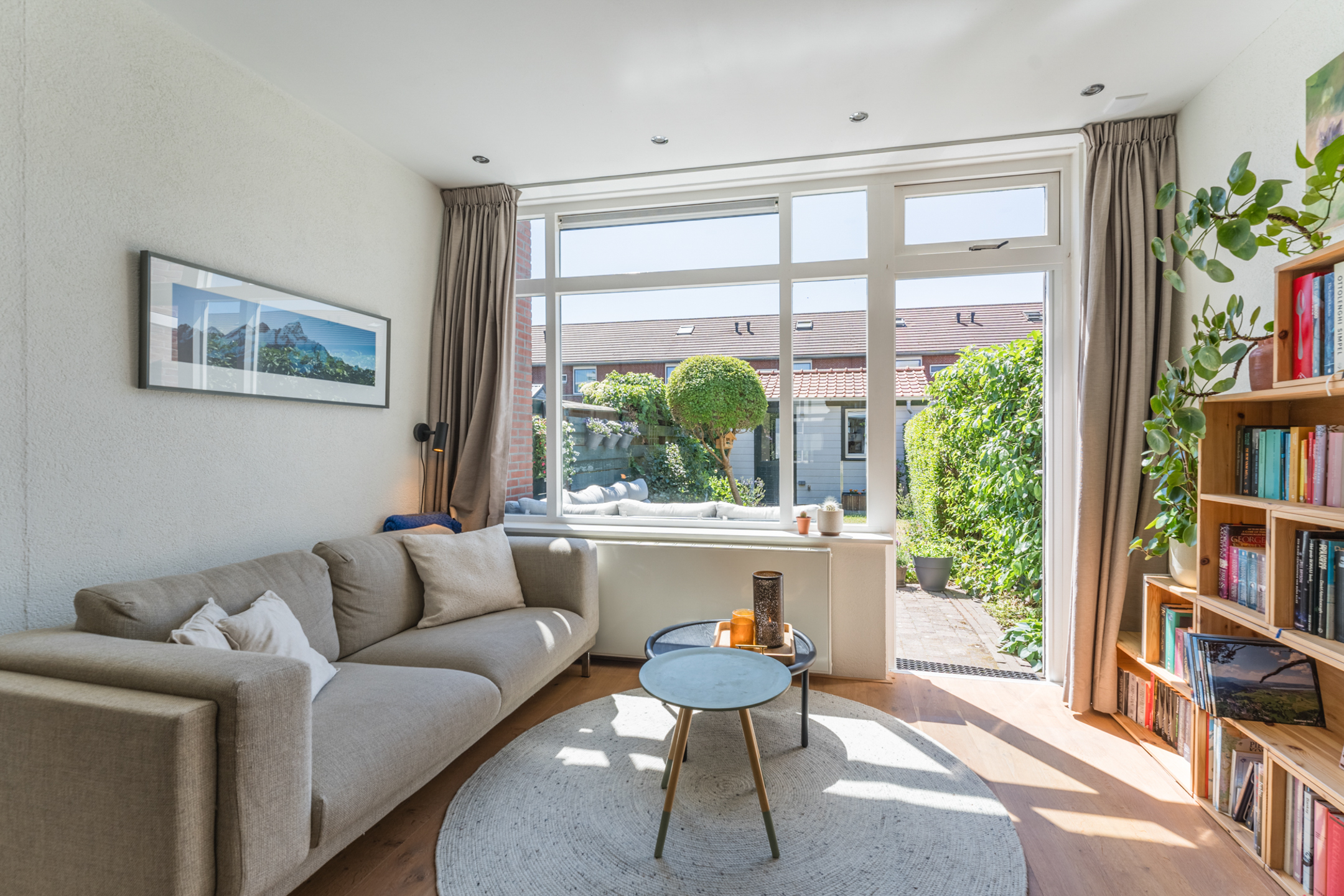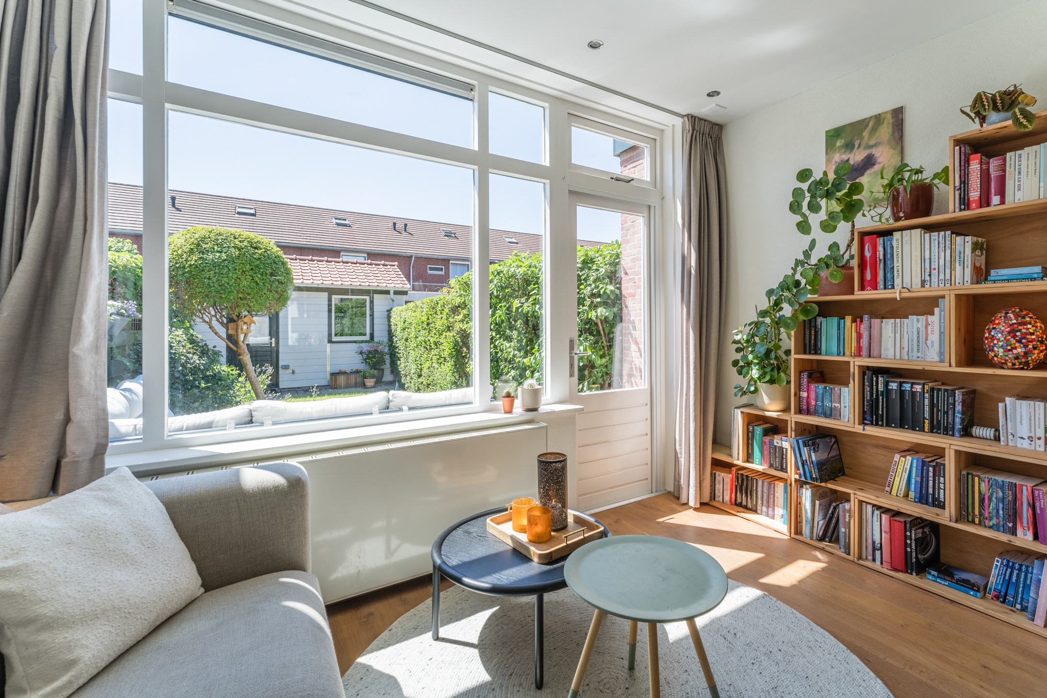 Aan de achterzijde van de woning tref je de uitgebouwde en gezellig ingerichte woonkamer. Door de prachtige plafondhoogte i.c.m. de aanwezigheid van een grote raampartij baadt de woonkamer in het zonlicht.