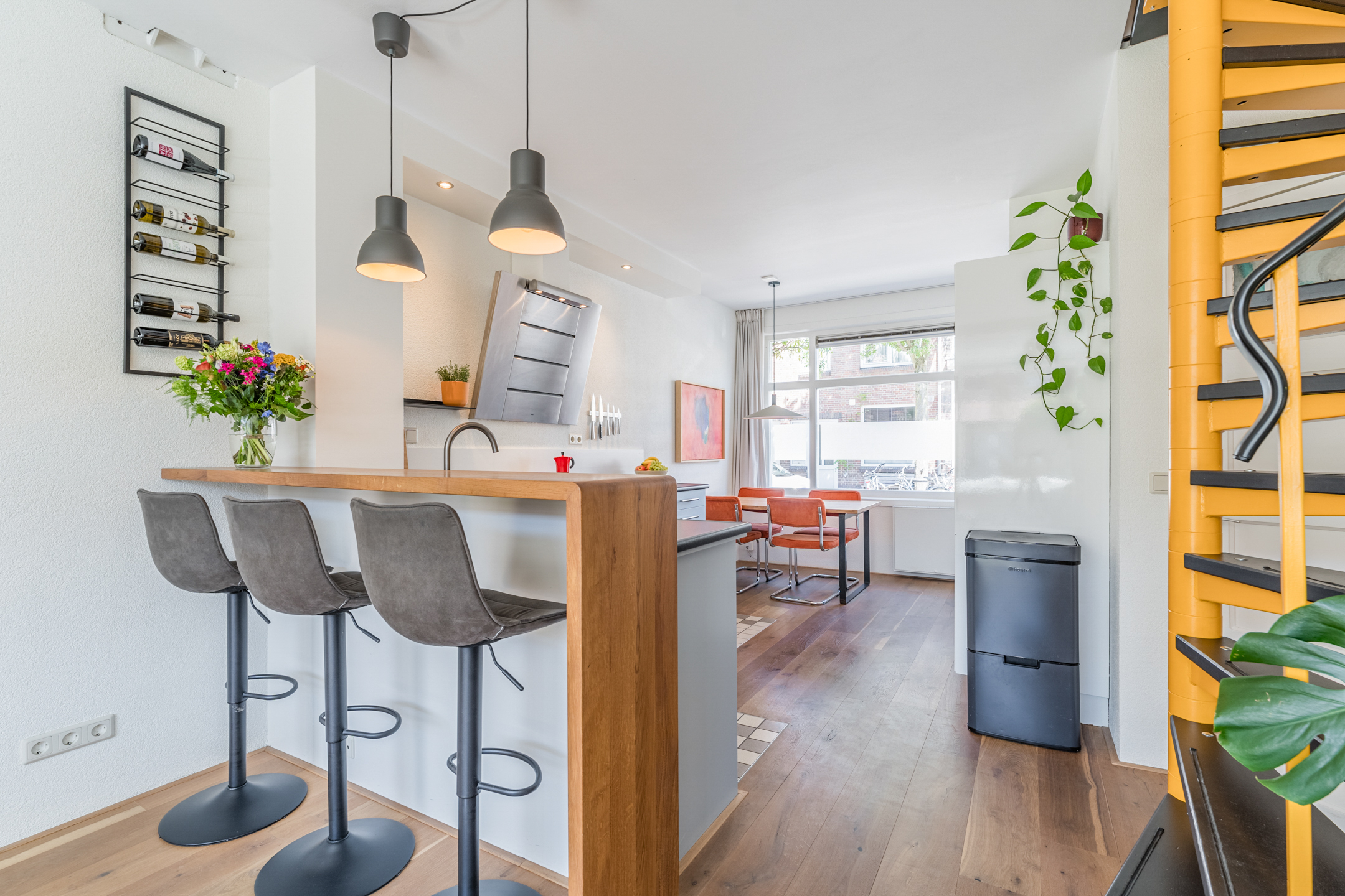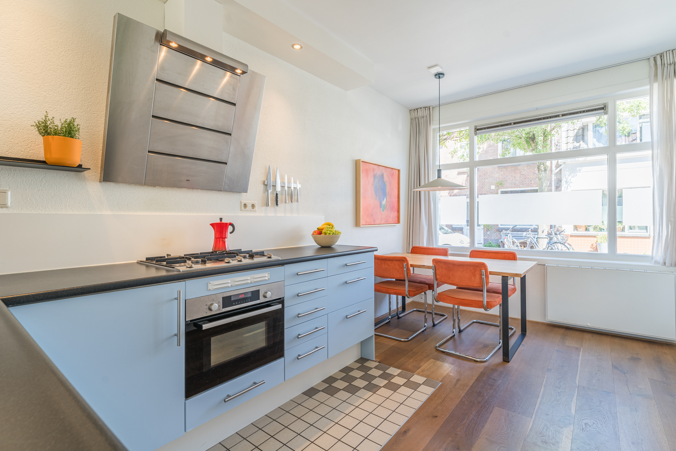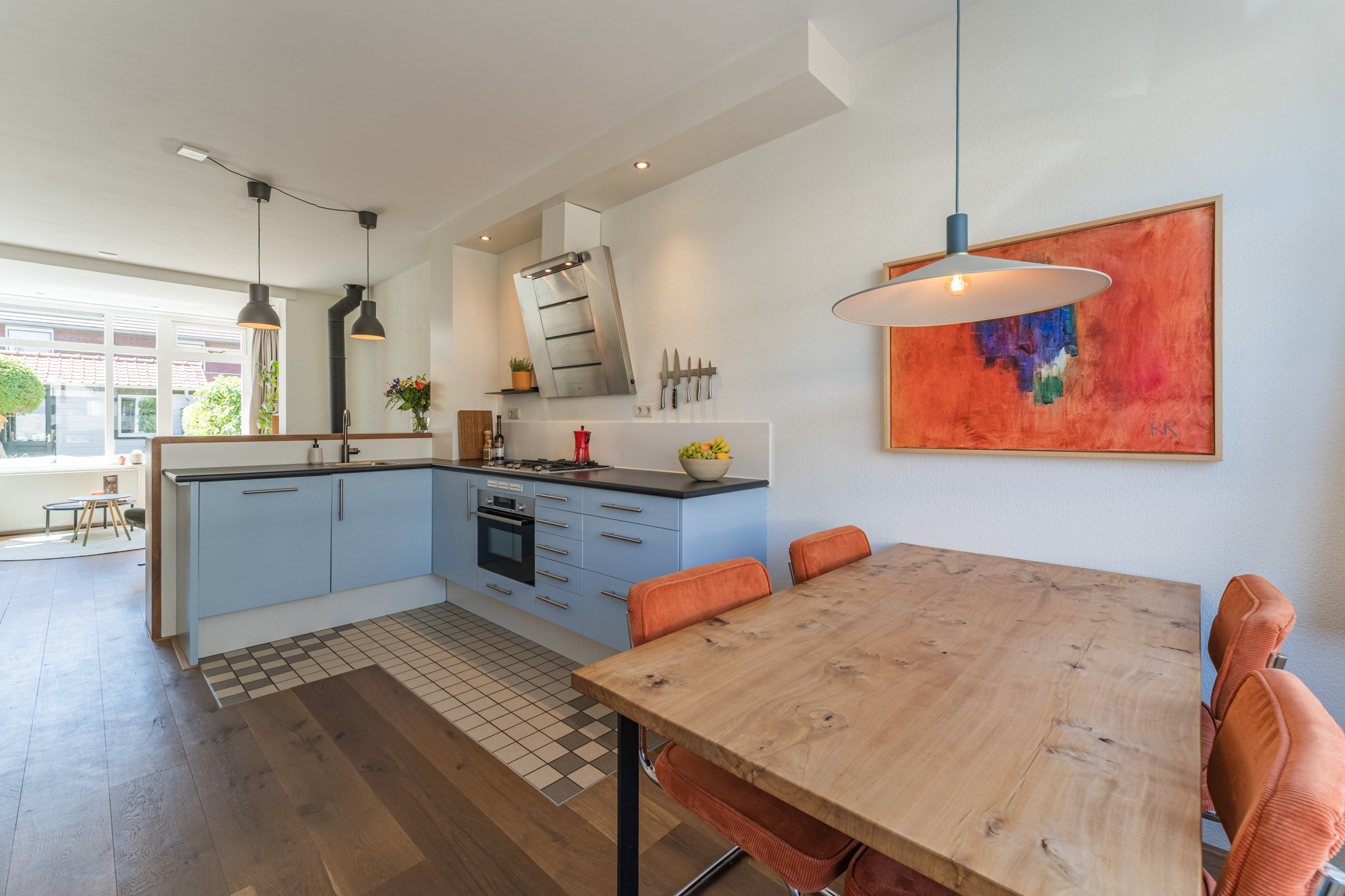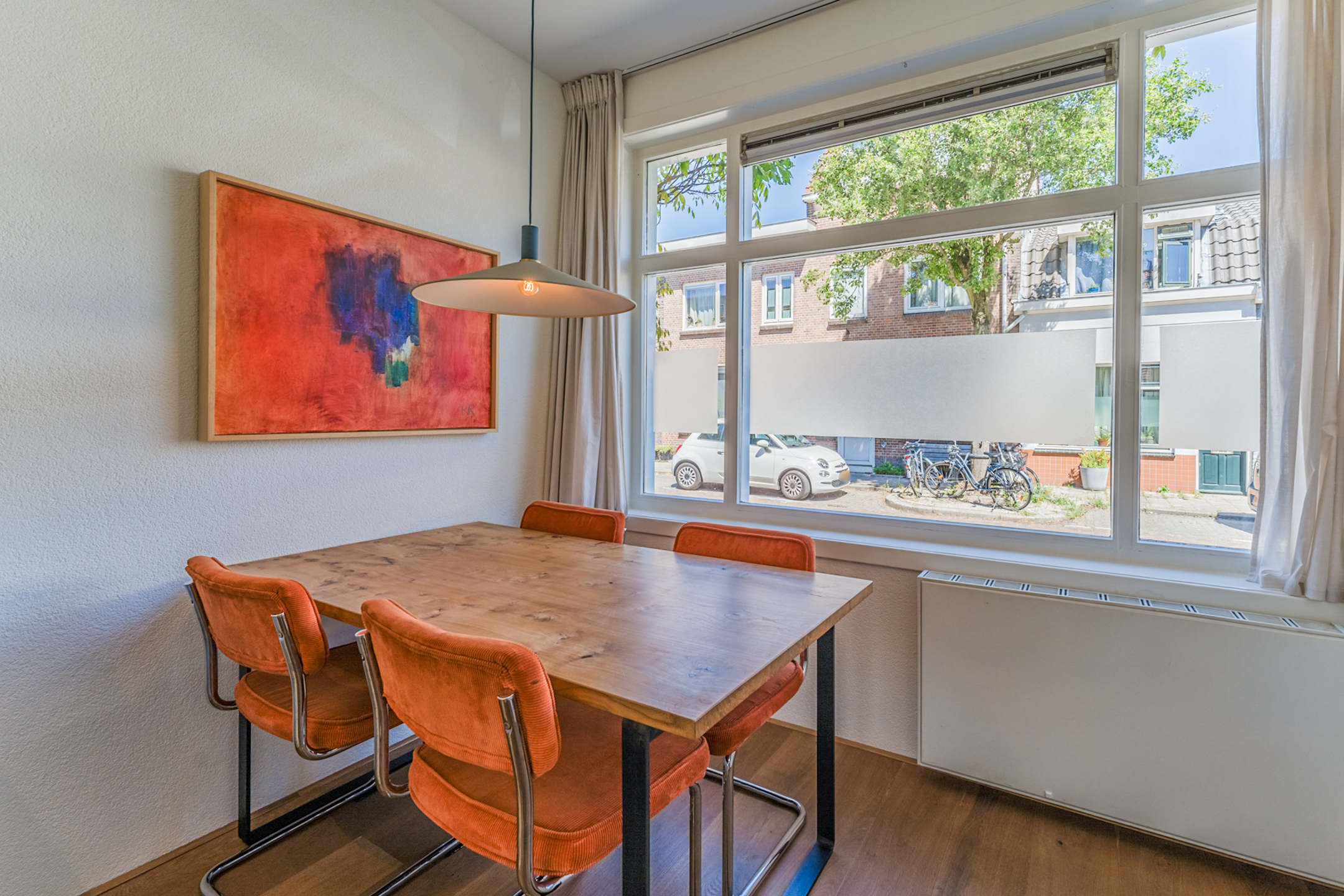 Aan de voorzijde van de woning bevindt zich de knusse eethoek met uitzicht op de gezellige Westravenstraat.