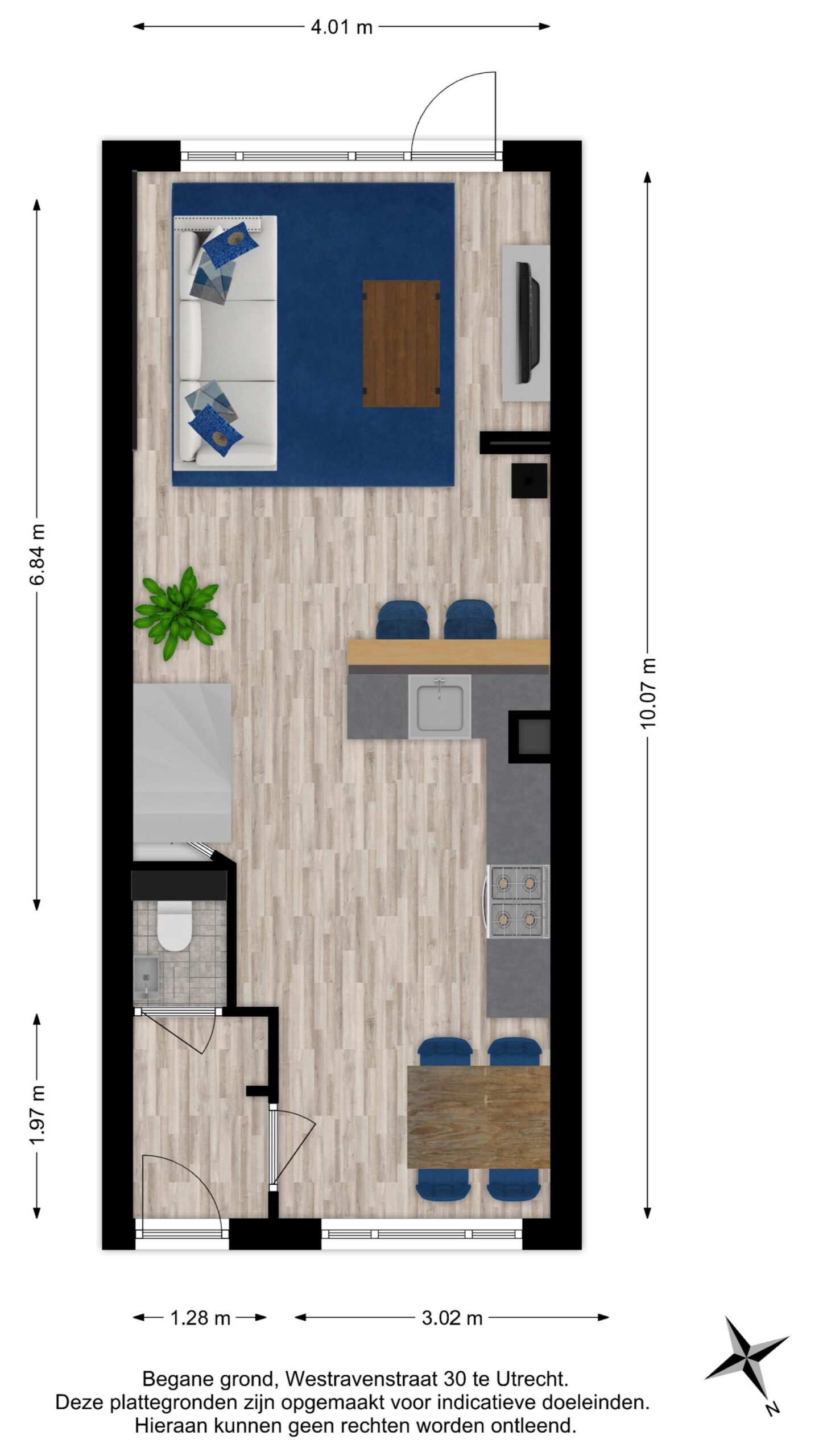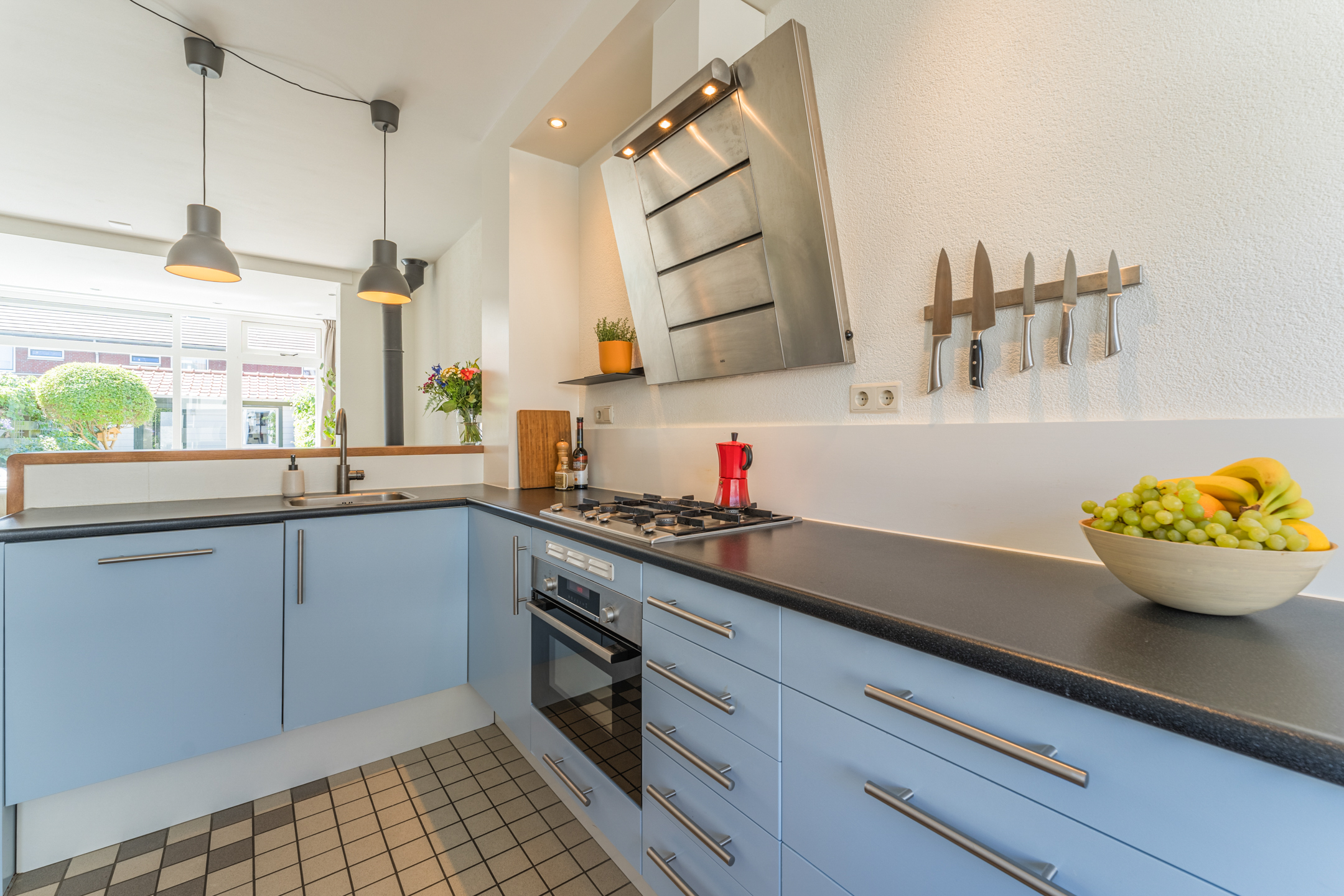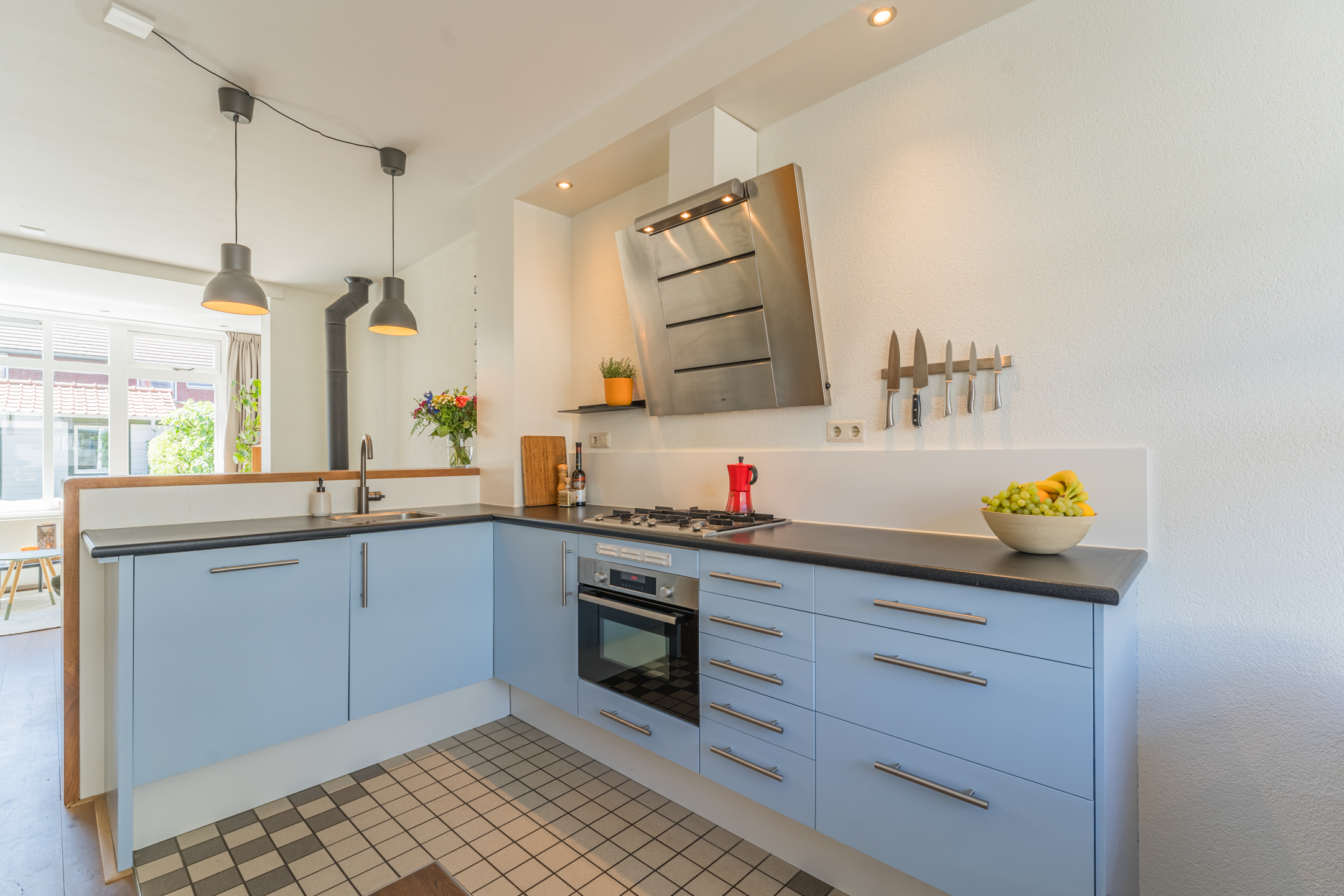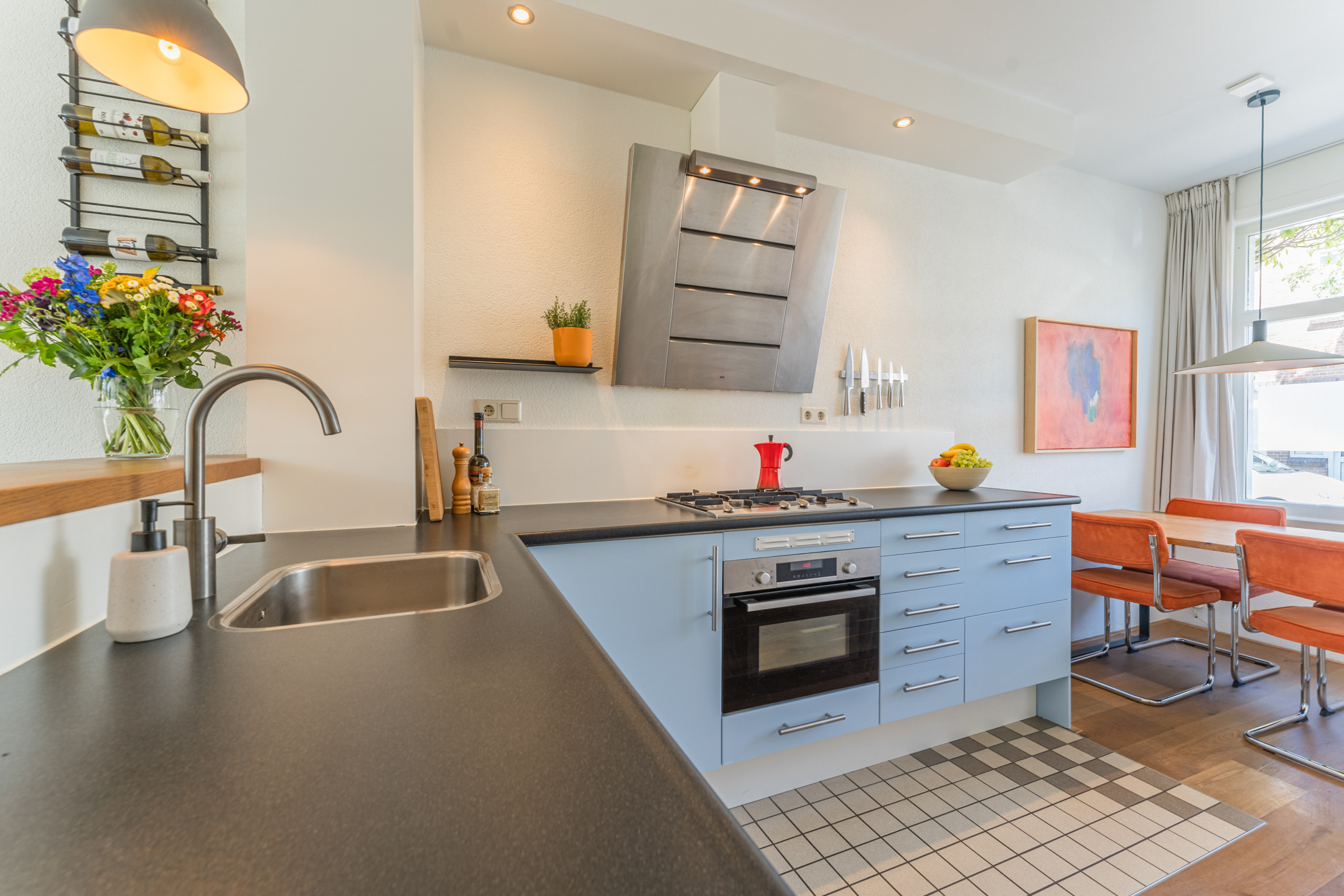 Aan de voorzijde van de woning bevindt zich de knusse eethoek met uitzicht op de gezellige Westravenstraat.