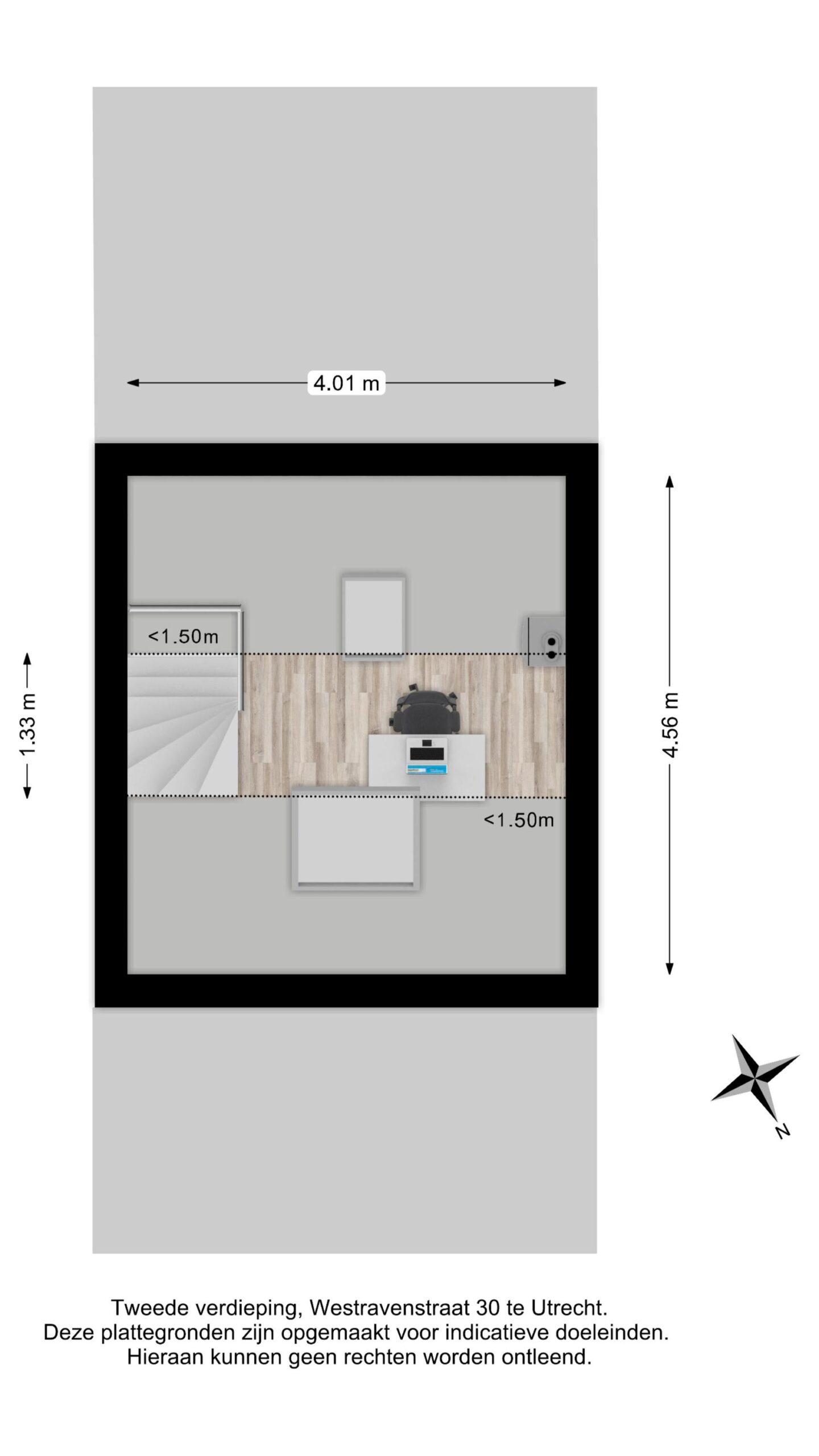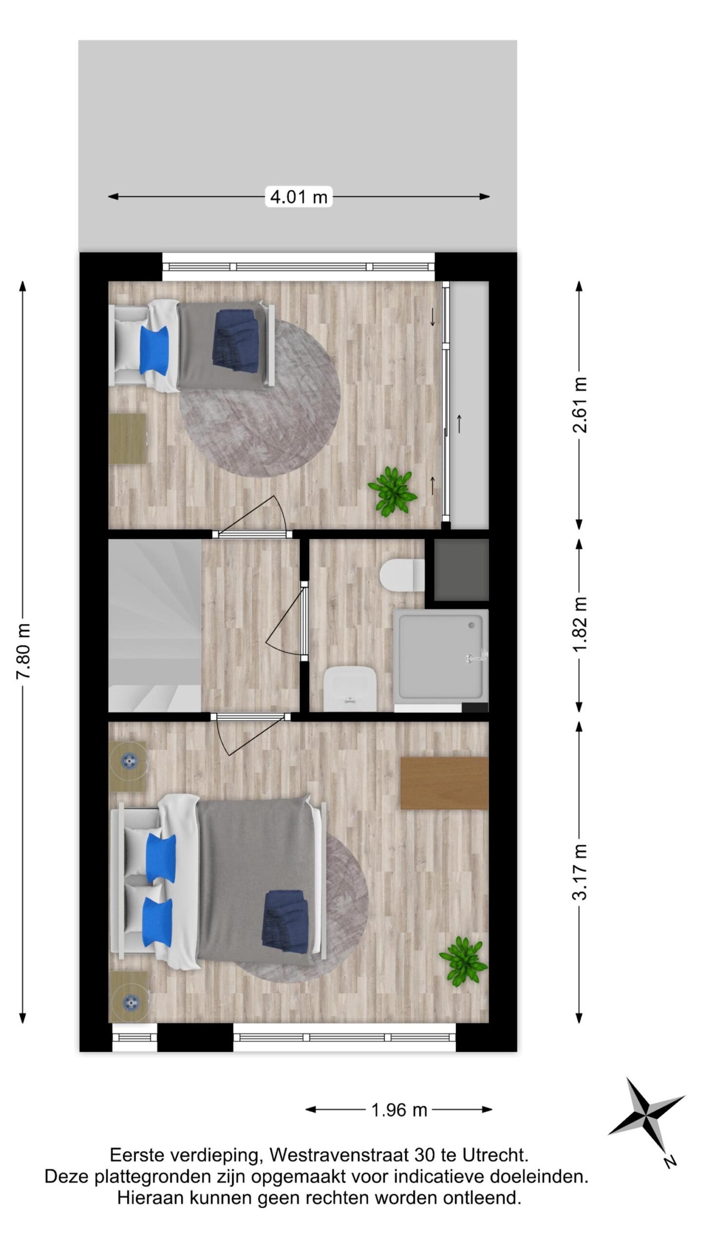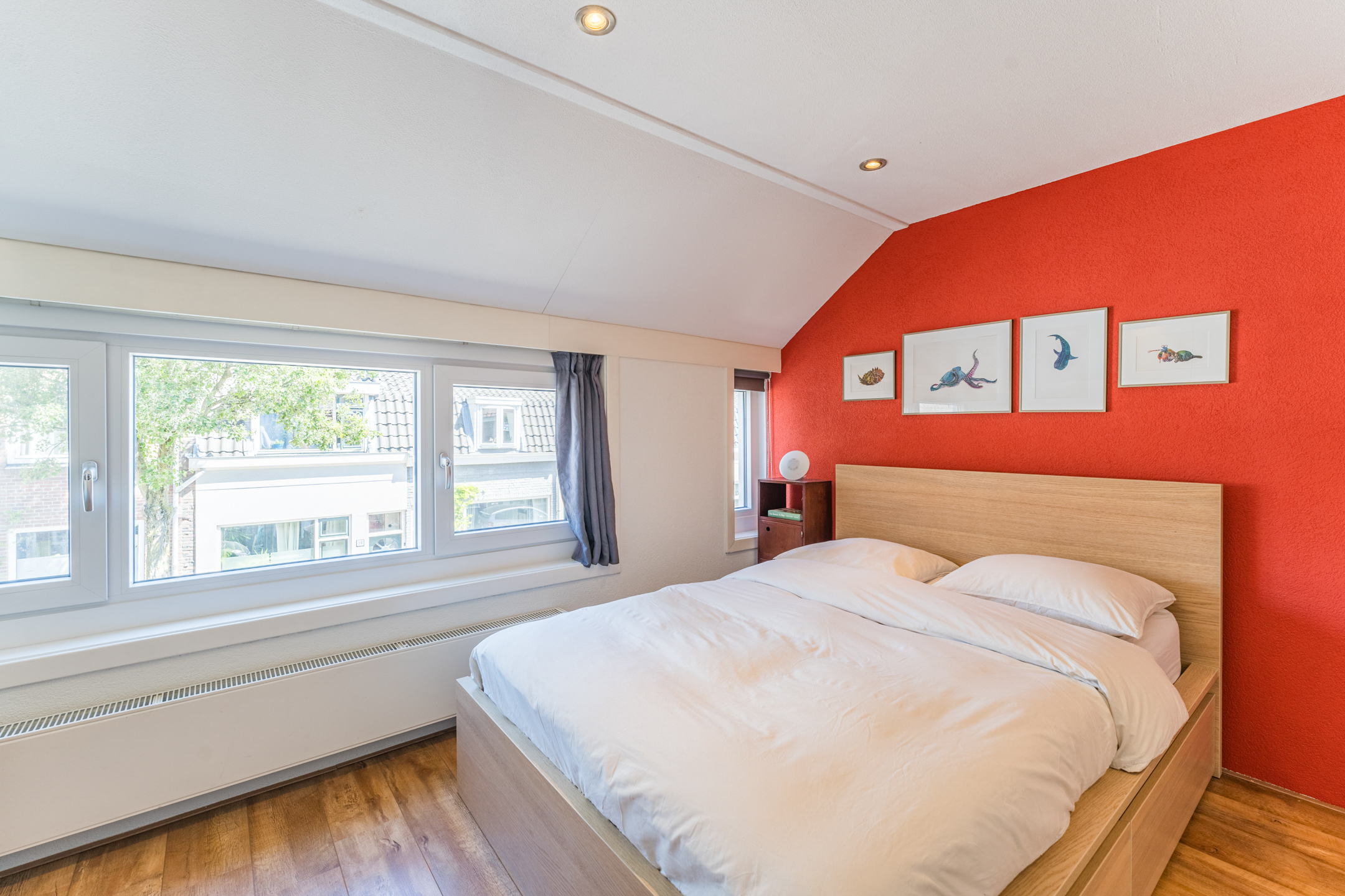Overloop met toegang tot twee woningbrede, multifunctionele (slaap)kamers en de inpandige badkamer. De slaapkamer aan de voorzijde van de woning heeft een riant formaat van ca. 13 m2 en beschikt over diverse draai-/kiep raampartijen die een fraai uitzicht bieden op de Westravenstraat.