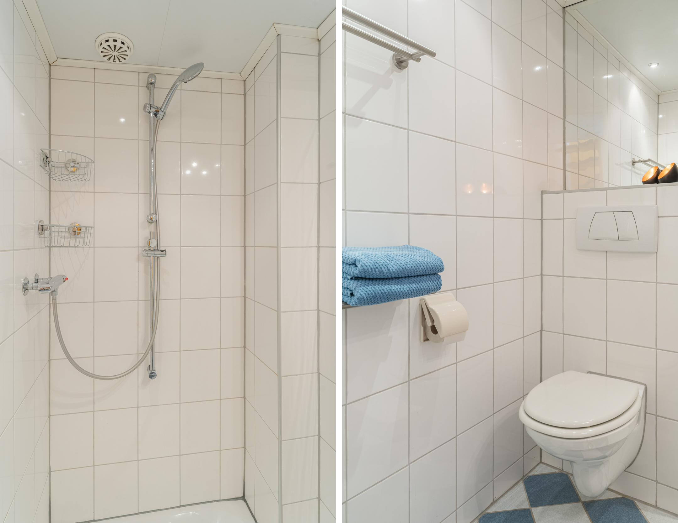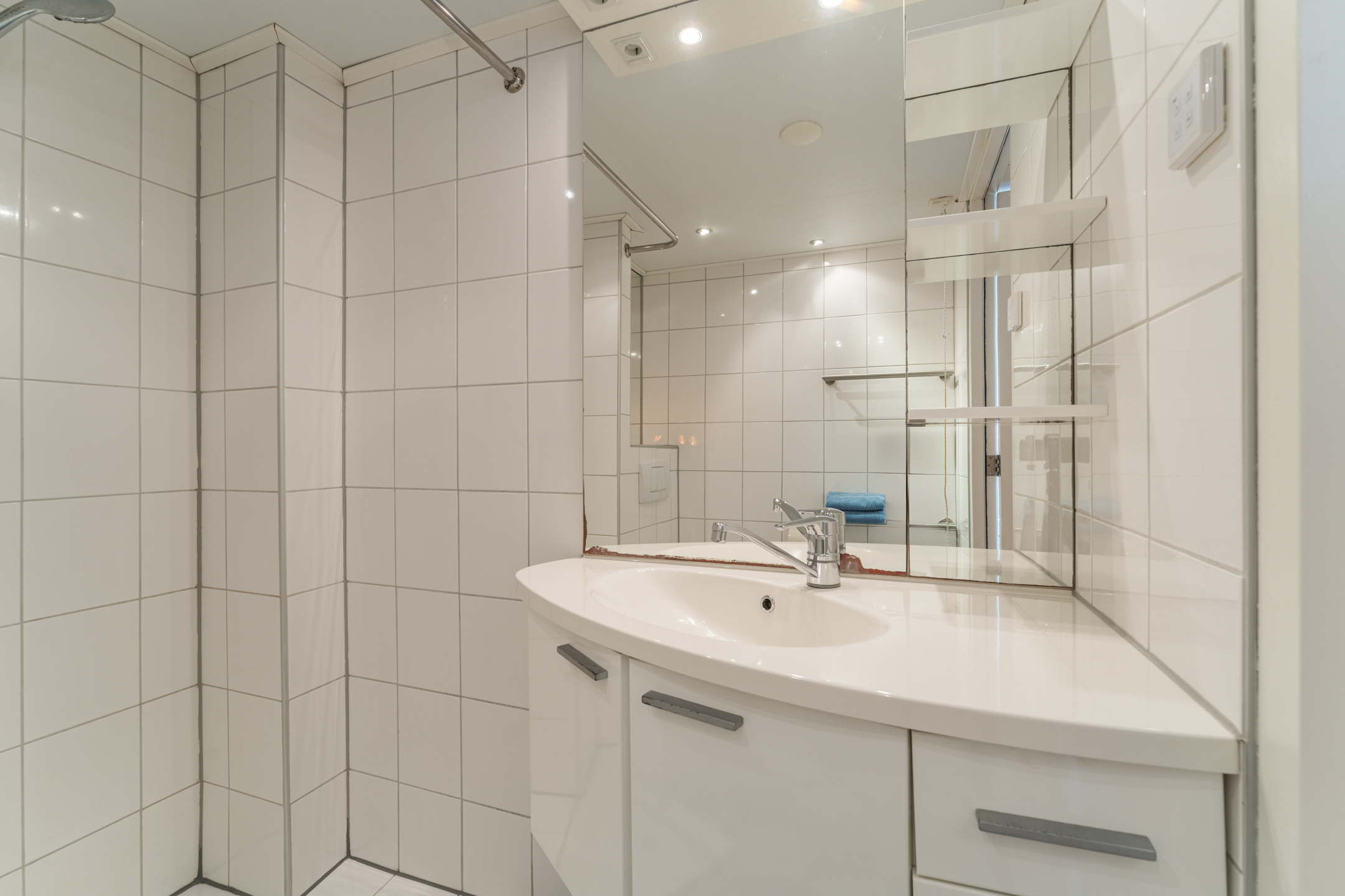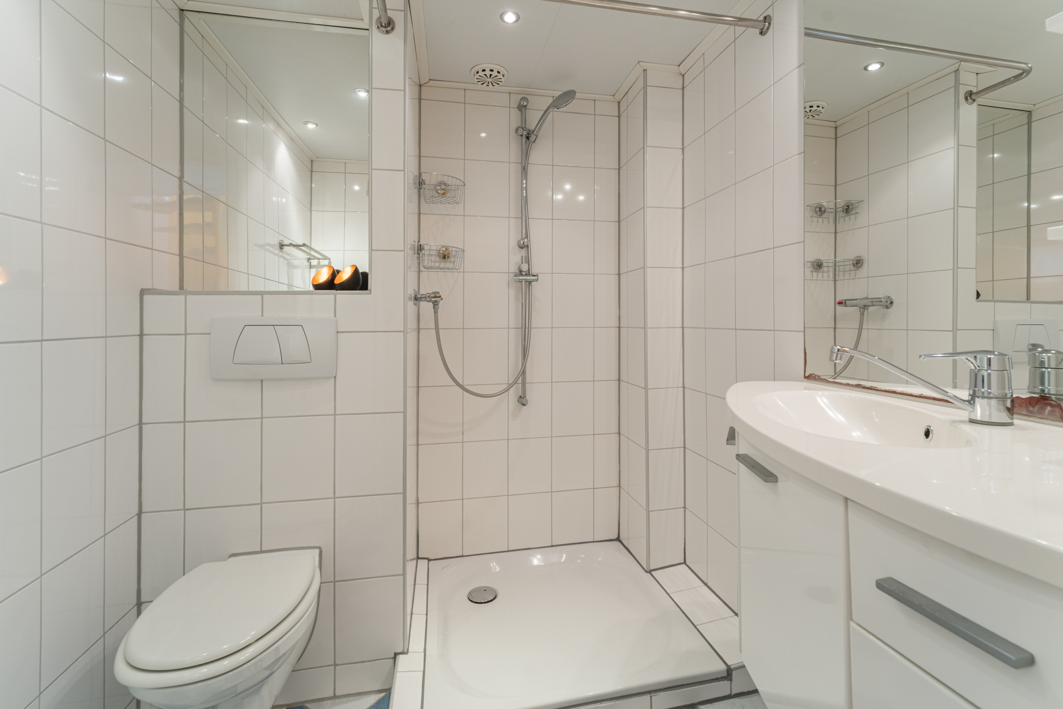 De inpandige badkamer (ca. 4 m2) is uitgevoerd in een rustige witte kleurstelling en voorzien van vloerverwarming, een douchecabine, een wastafel met praktische lades en een tweede hangend toilet. Mechanische ventilatie zorgt ervoor dat de ruimte goed geventileerd blijft.