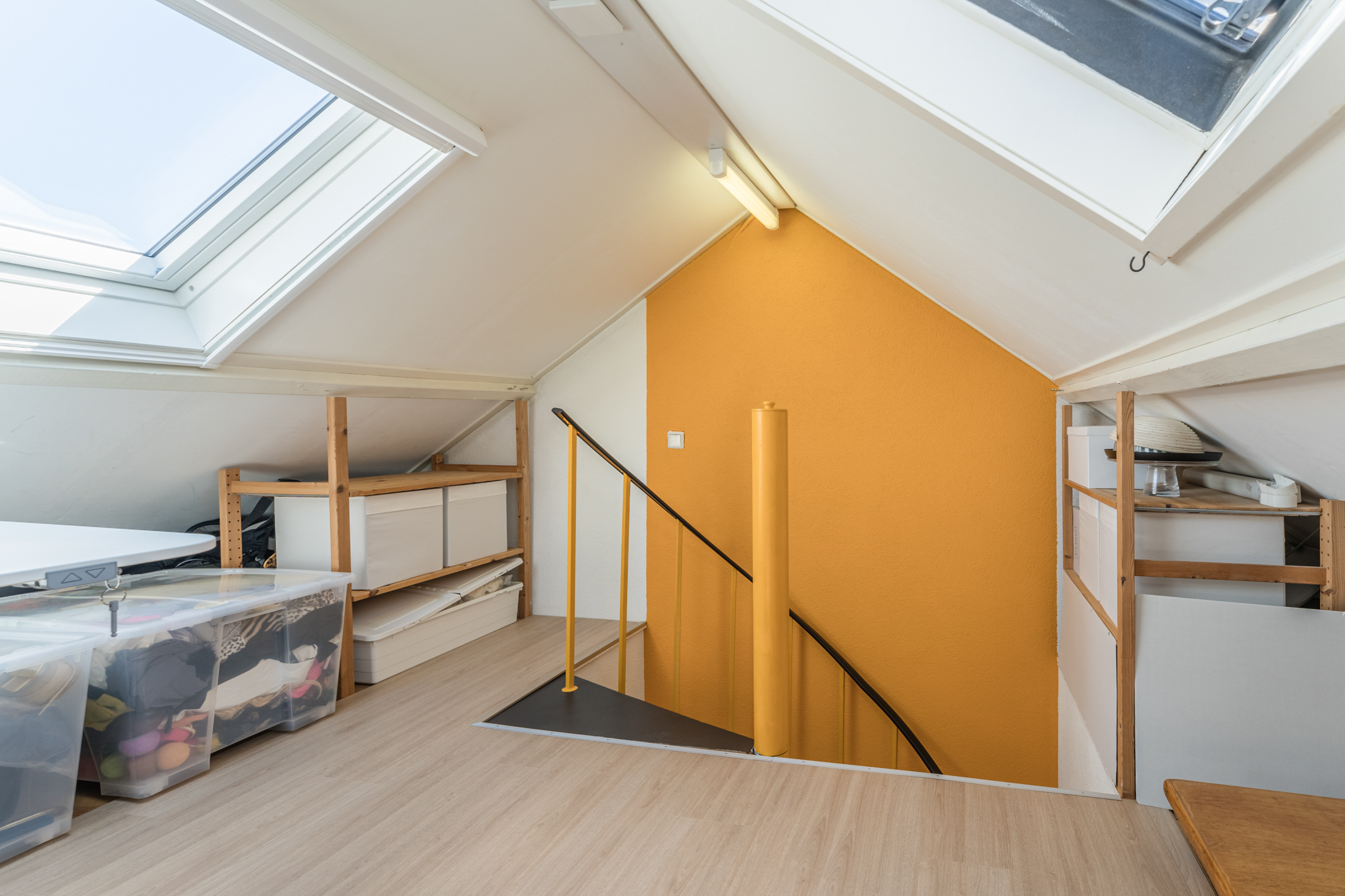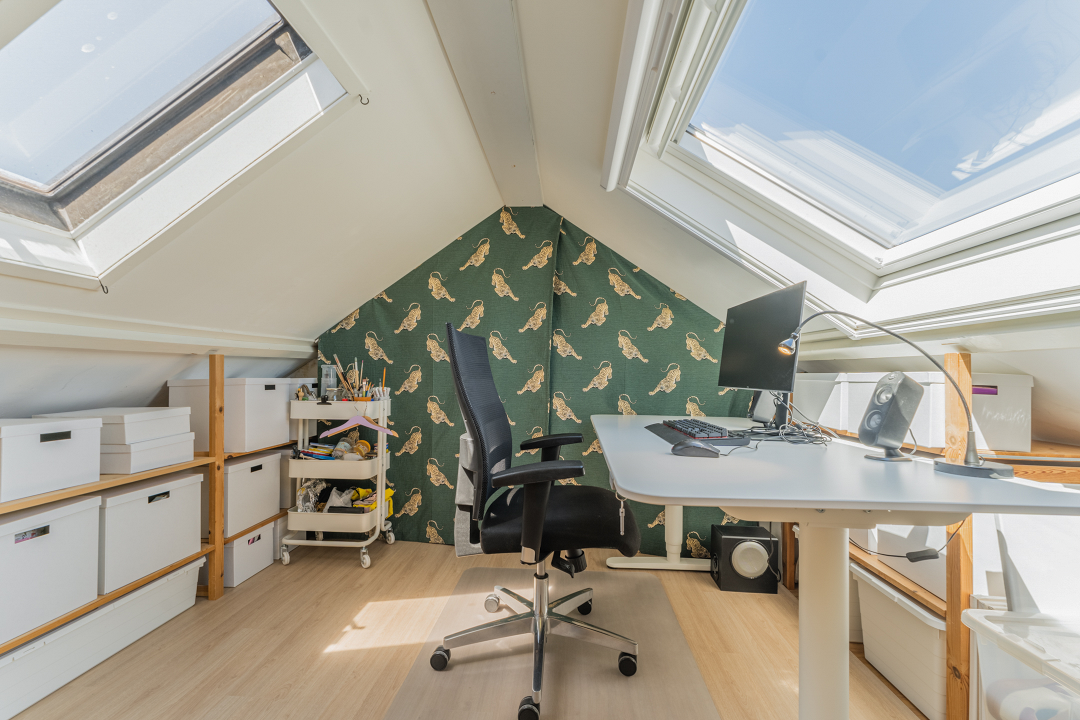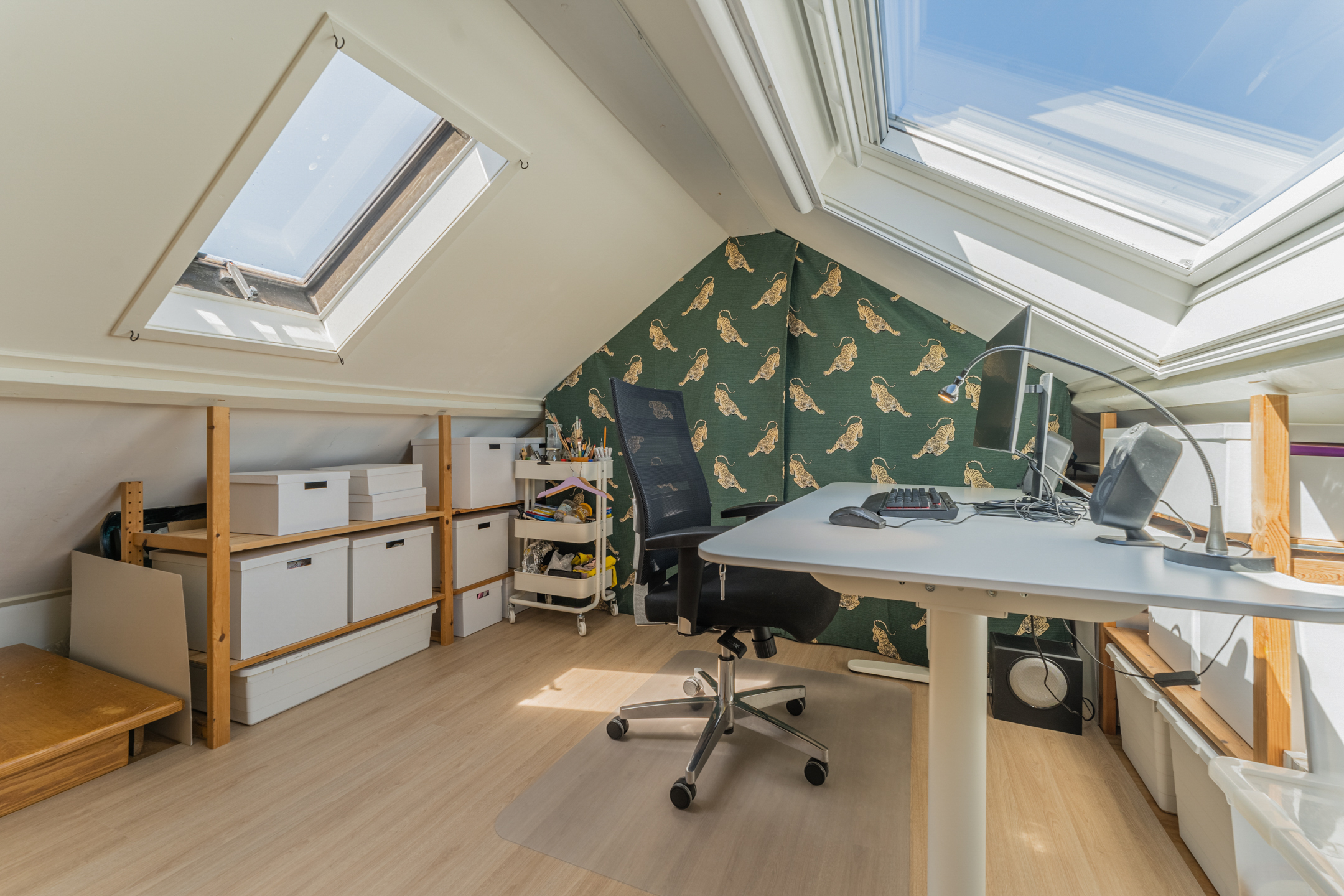 Middels een vaste trap bereik je de tweede verdieping met een plafond op stahoogte, waar een prettige studeerkamer is gerealiseerd. De twee grote dakramen zorgen voor heerlijk veel lichtinval.