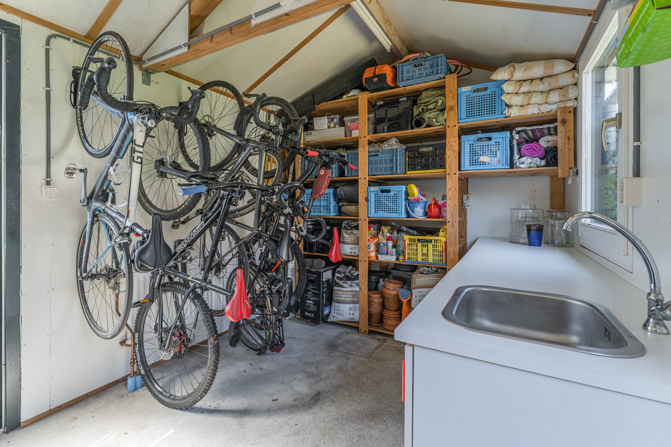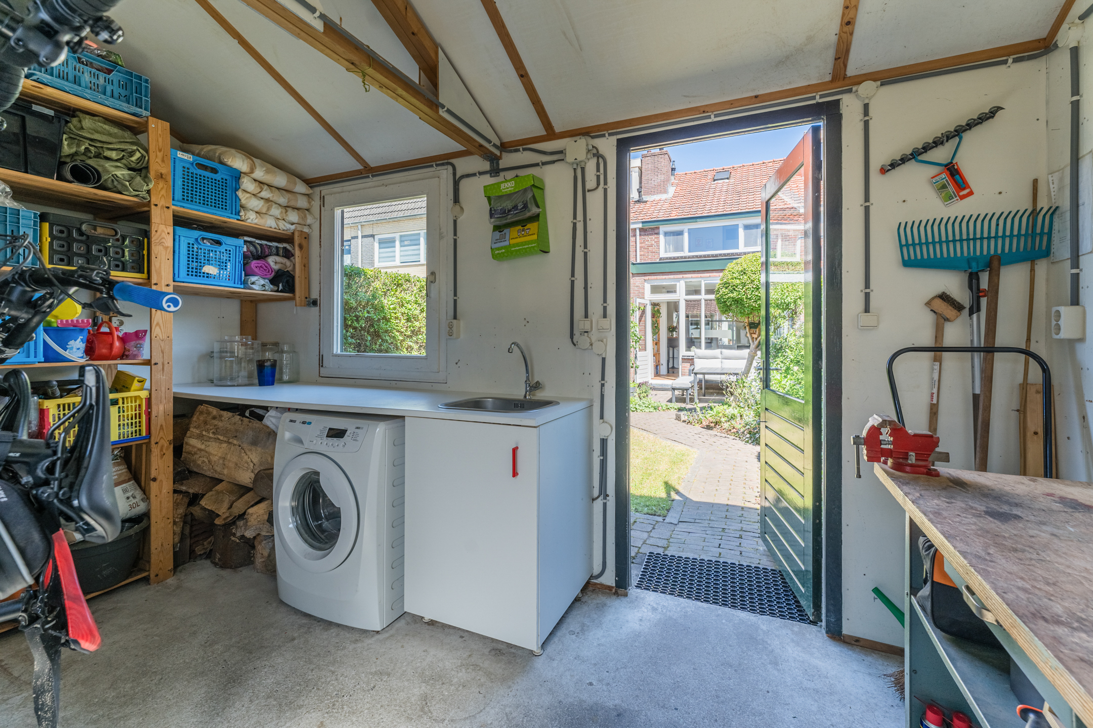 Achterin de tuin bevindt zich een ruime, vrijstaande berging. De berging beschikt over verwarming, een betonnen vloer, aanrechtblad met wasbak en een wasmachineaansluiting. Daarnaast is deze vorstvrij. De achterom zorgt ervoor dat je eenvoudig je fiets kunt stallen.