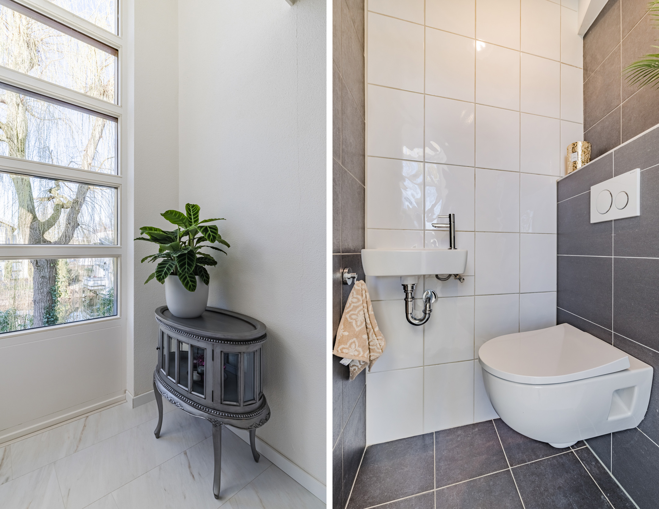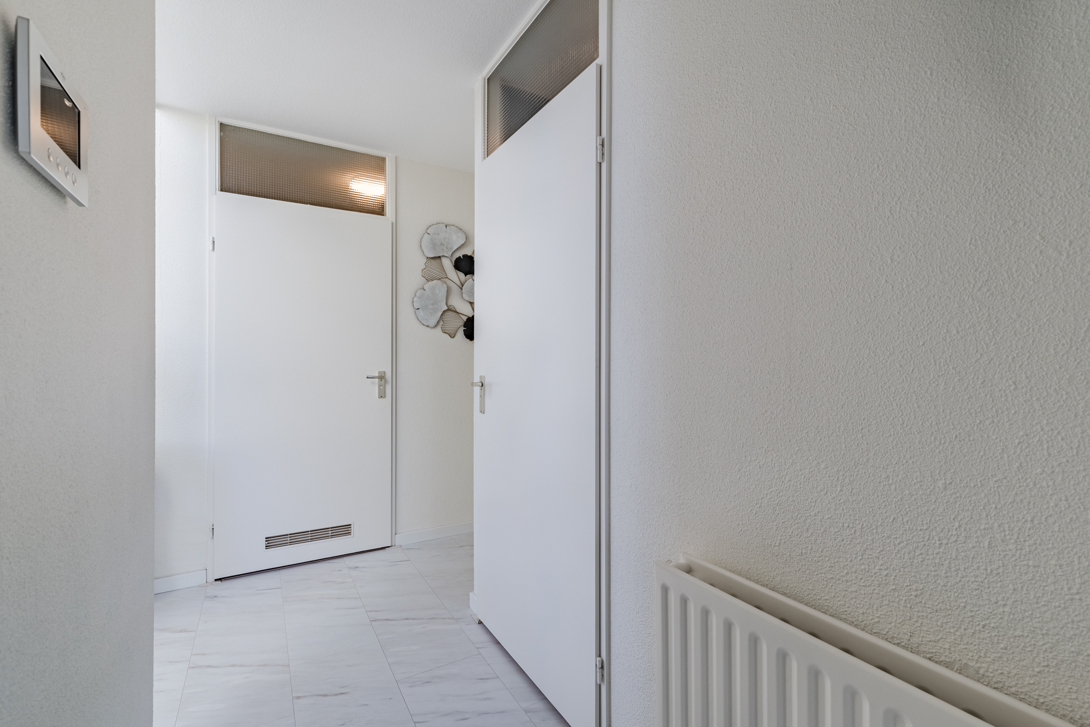 Overloop met toegang tot de verschillende vertrekken. Hier bevindt zich de toiletruimte met hangend toilet en fontein.