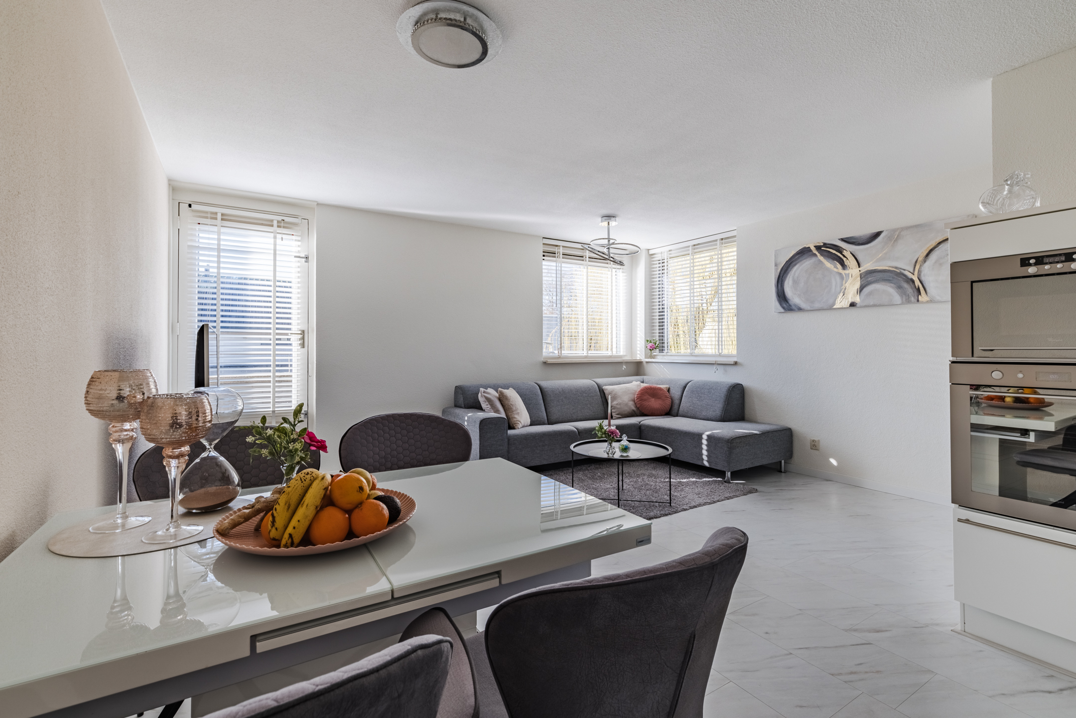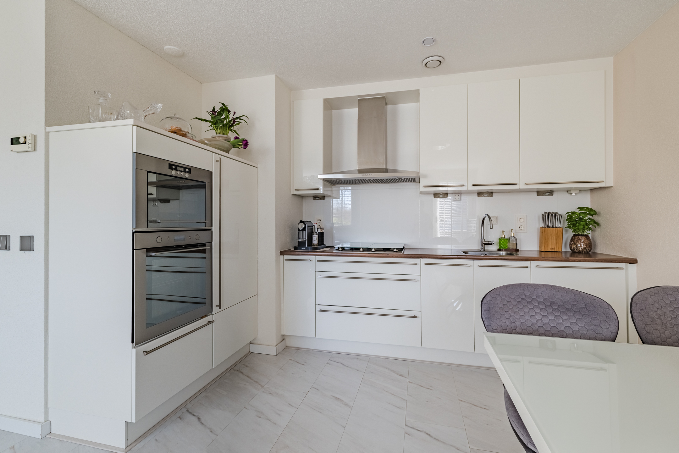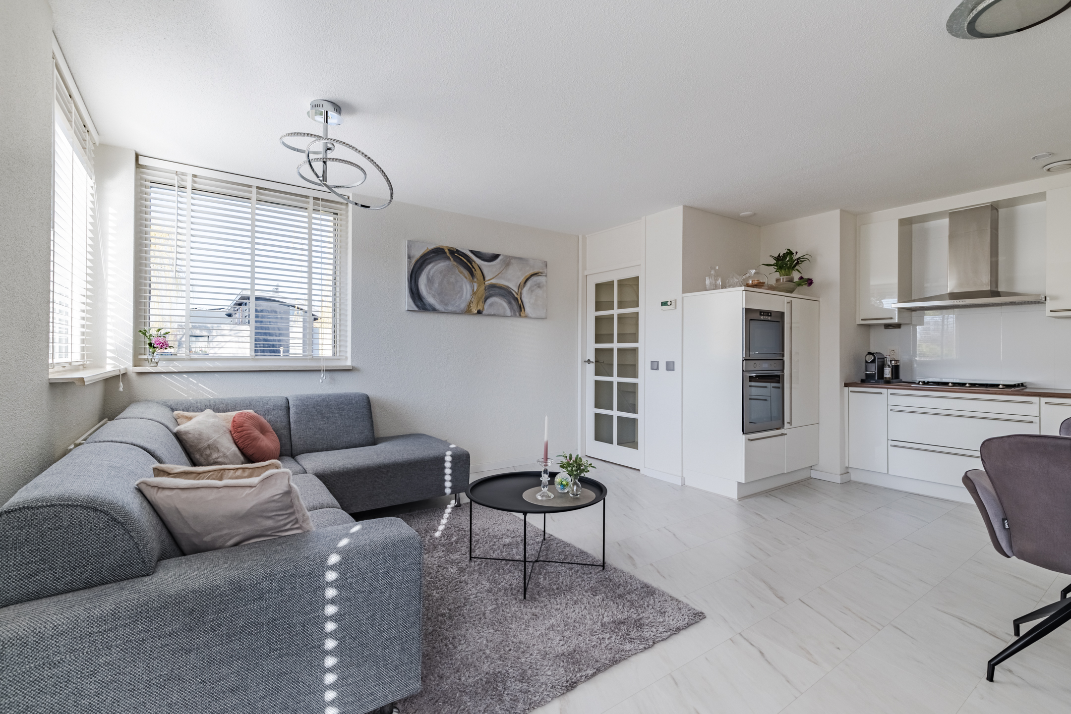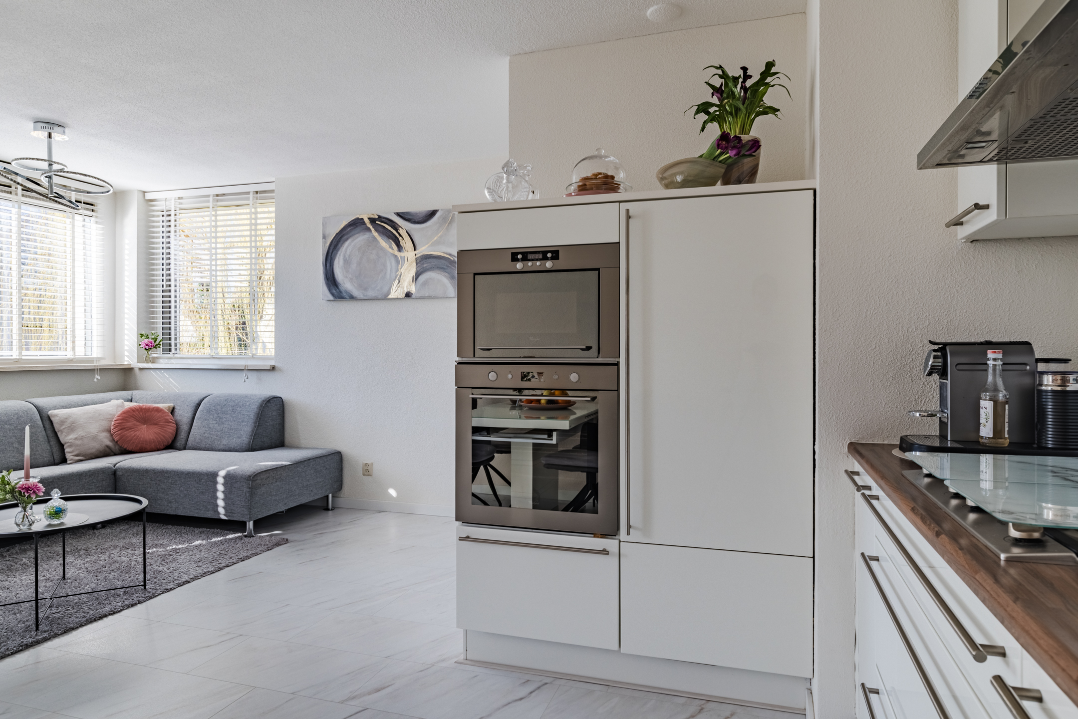 De woonkamer met open keuken vormt het hart van de woning. Dankzij de grote raampartijen op het Zuiden valt hier een aangename hoeveelheid daglicht naar binnen waardoor de ruimte bijzonder licht en sfeervol aanvoelt. De moderne open keuken is voorzien van onder andere een vaatwasser, koelkast, gaskookplaat, magnetron, oven en een rvs afzuigkap. Vanuit de woonkamer stap je zo het zonnige terras op (ca. 19 m2). Hier kun je heerlijk genieten van de zon en het uitzicht op het omliggende groen en het water.