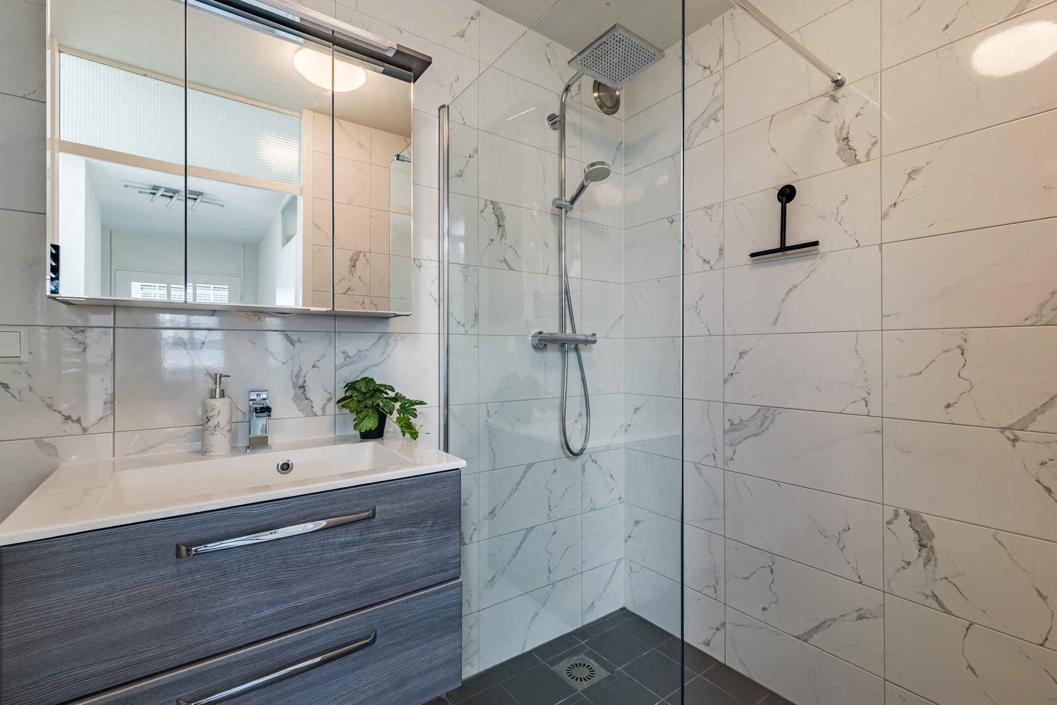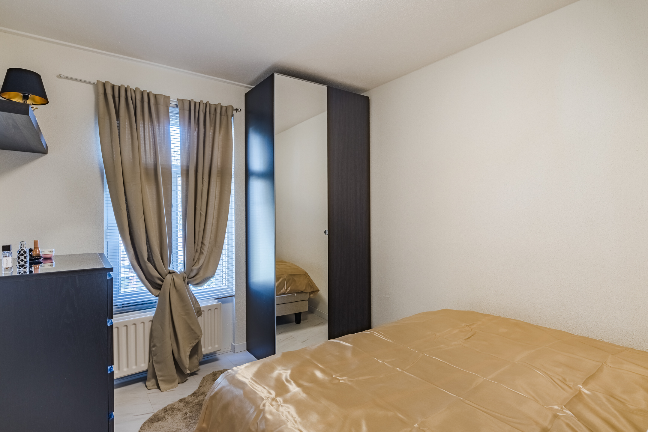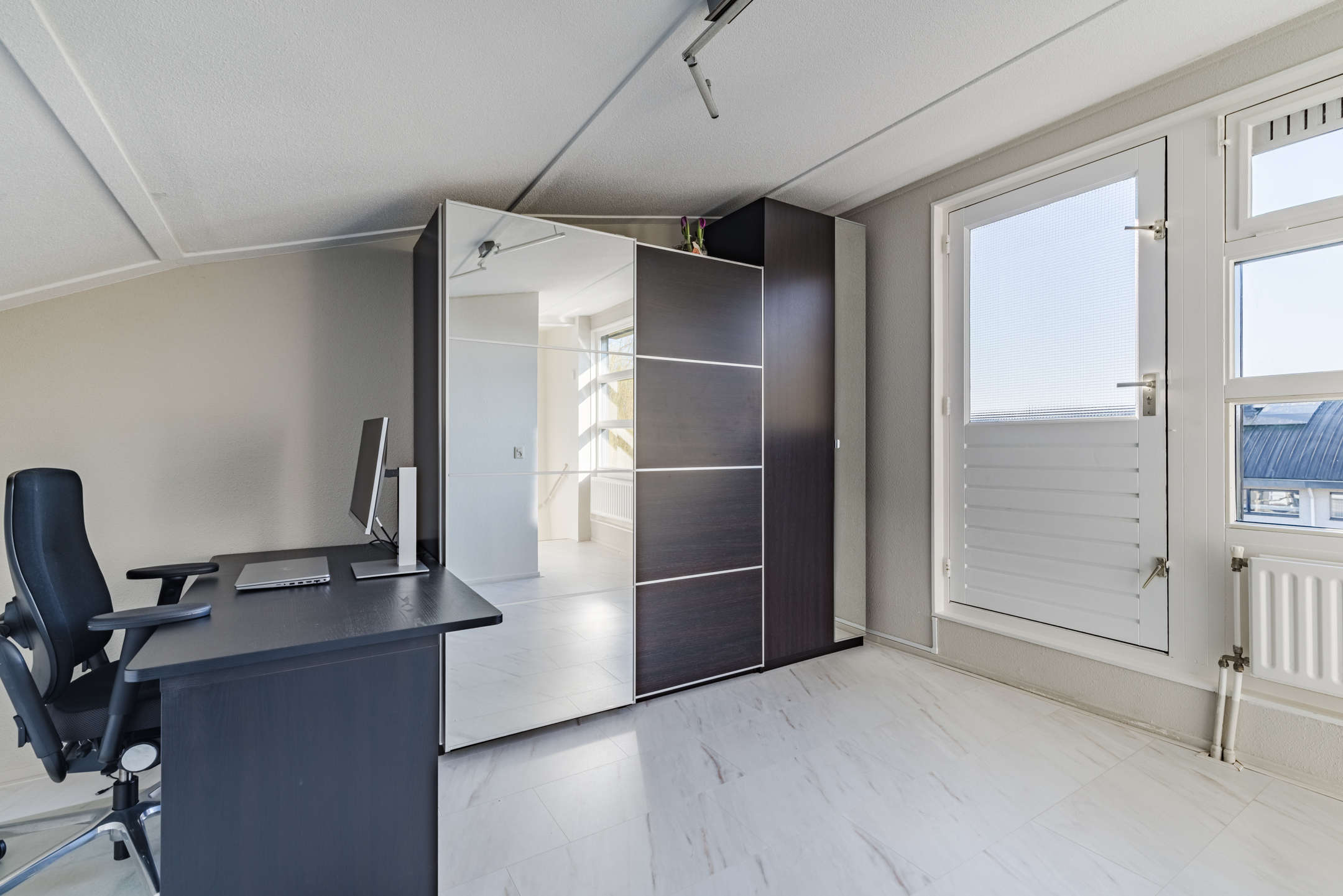 Aan de achterzijde van deze verdieping bevindt zich een volwaardige slaapkamer en de moderne badkamer. De badkamer, uitgevoerd met een moderne marmerlook tegel, is voorzien van een douche en een stijlvol wastafelmeubel. De gehele woonlaag is afgewerkt met een nette laminaatvloer en spachtelputz wandafwerking wat zorgt voor een verzorgde en moderne uitstraling.