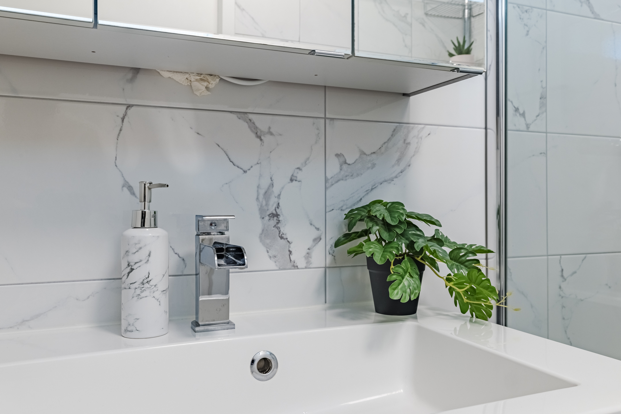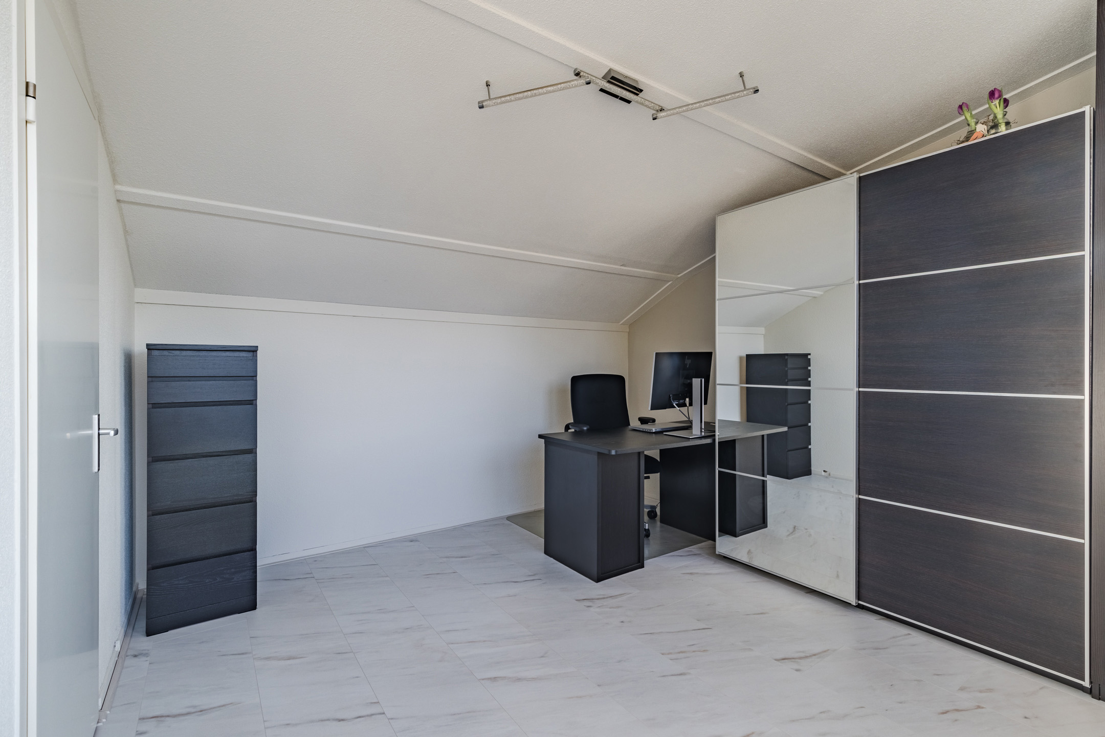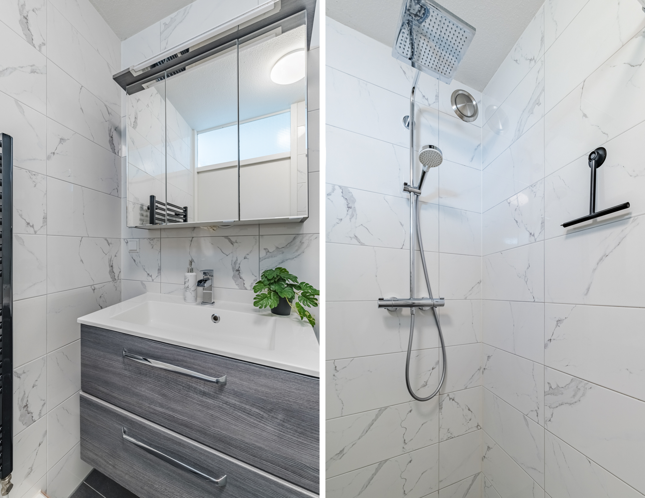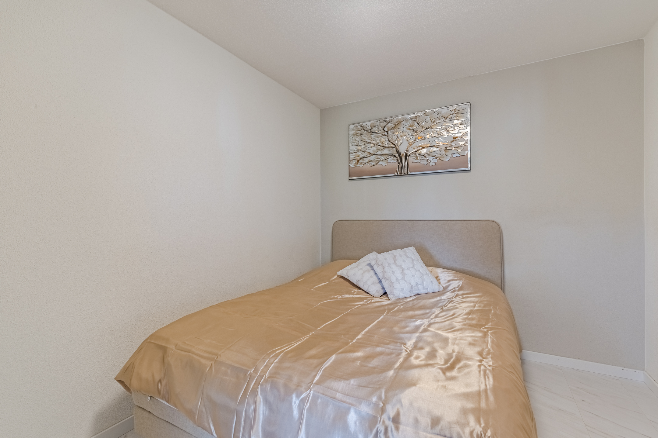 Aan de achterzijde van deze verdieping bevindt zich een volwaardige slaapkamer en de moderne badkamer. De badkamer, uitgevoerd met een moderne marmerlook tegel, is voorzien van een douche en een stijlvol wastafelmeubel. De gehele woonlaag is afgewerkt met een nette laminaatvloer en spachtelputz wandafwerking wat zorgt voor een verzorgde en moderne uitstraling.