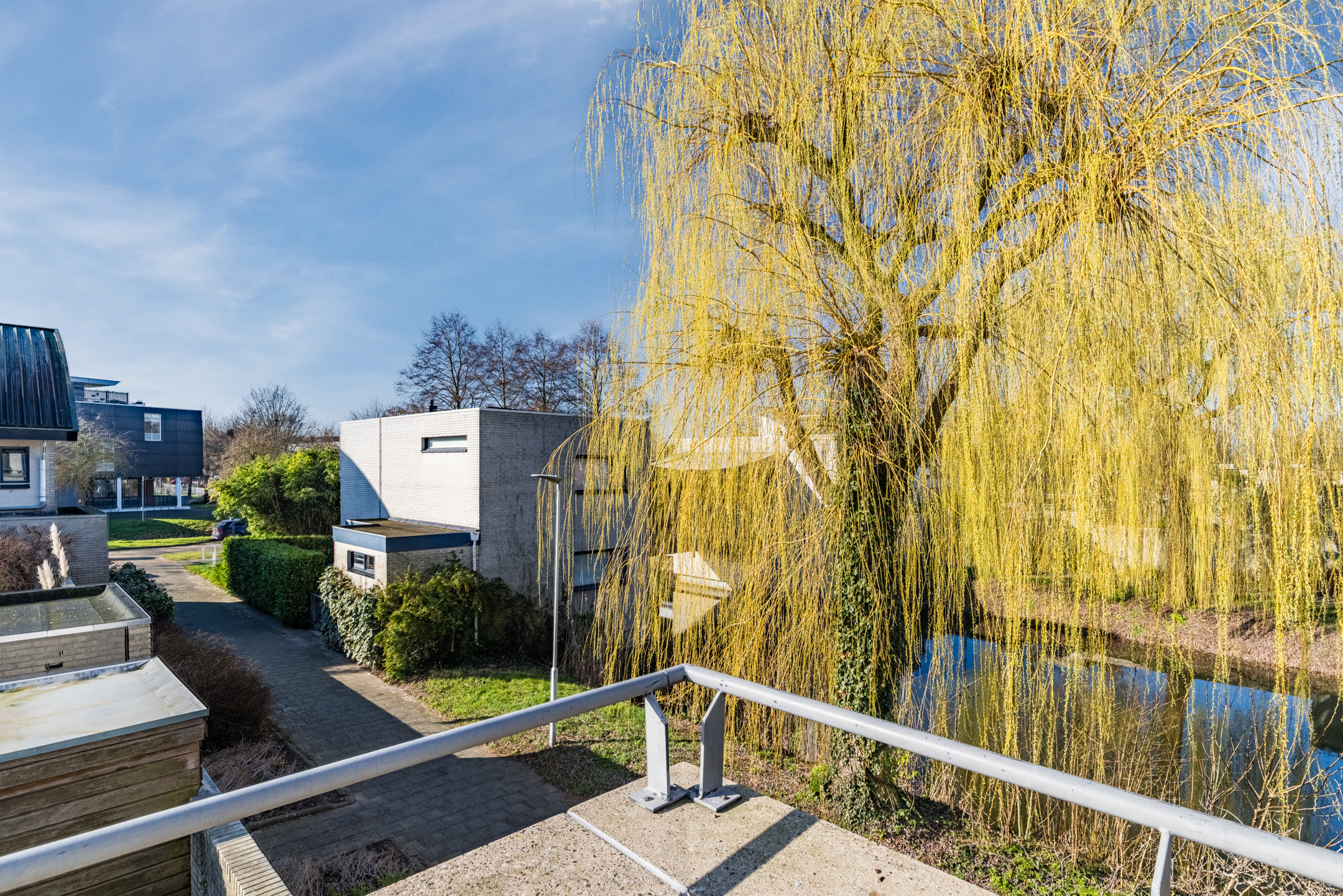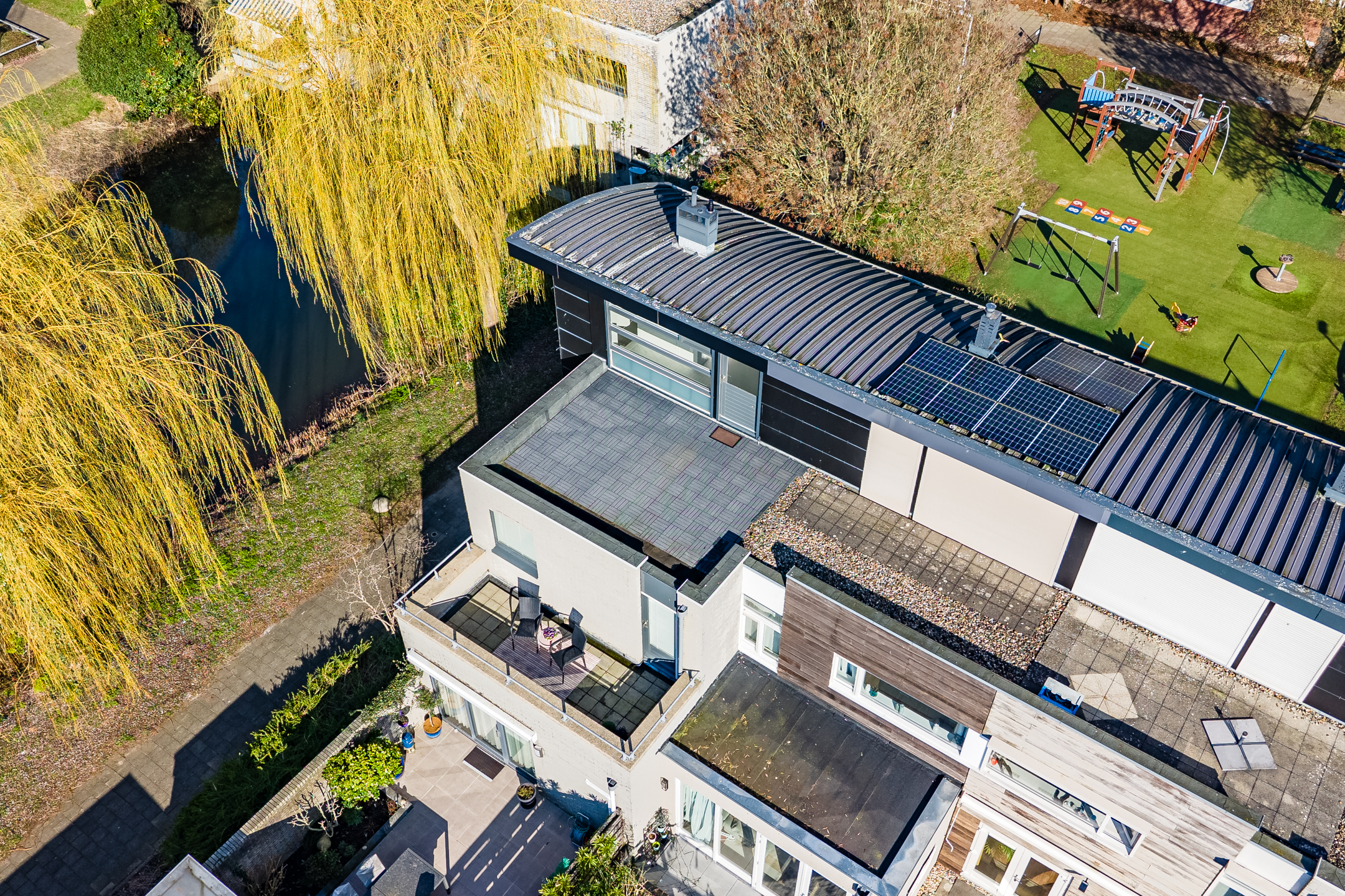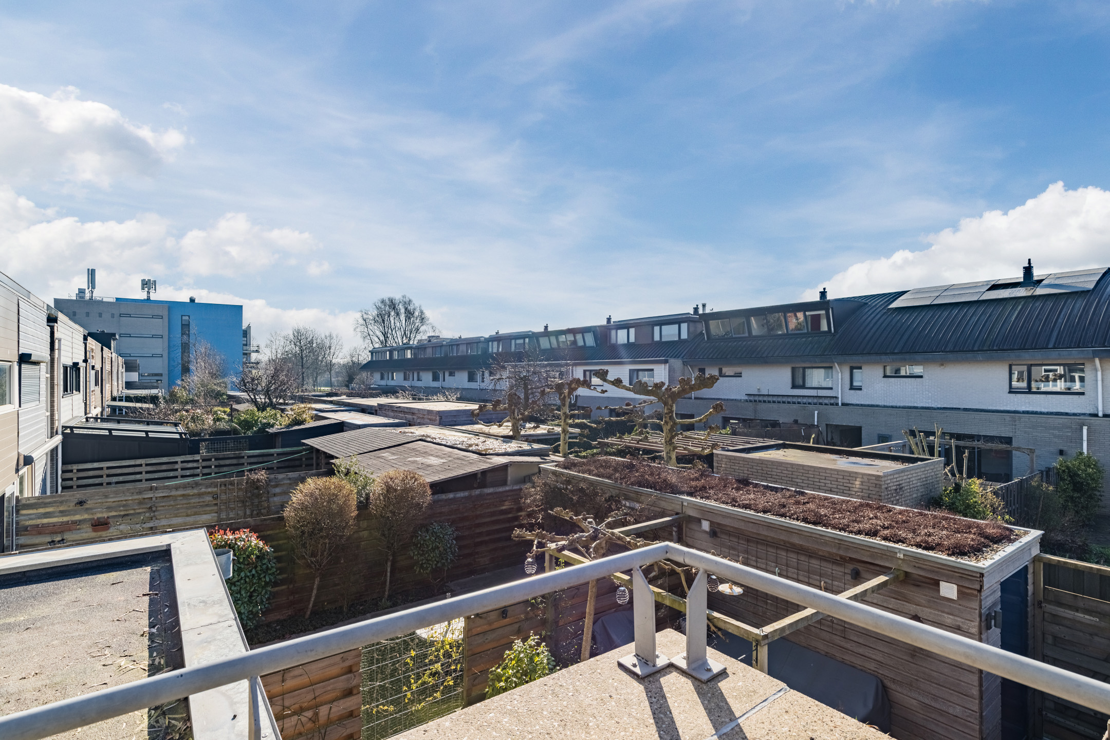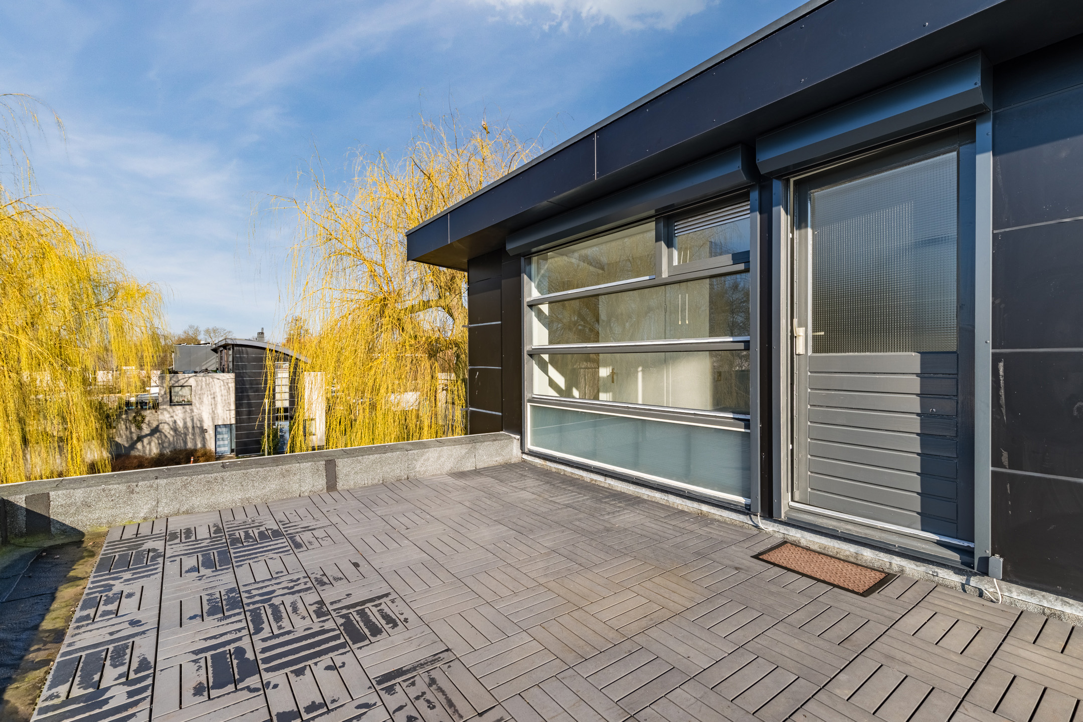 Vanuit de slaapkamer heb je toegang tot het zonnige dakterras op het platte dak. Dit terras biedt een vrij uitzicht over het omliggende groen en water. Op heldere dagen zie je zelfs de karakteristieke kerktoren van Vleuten, wat het uitzicht een charmant en dorps karakter geeft!