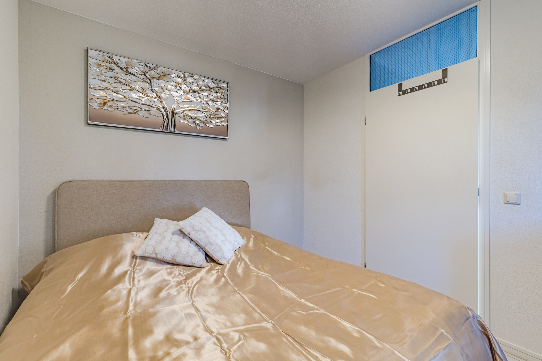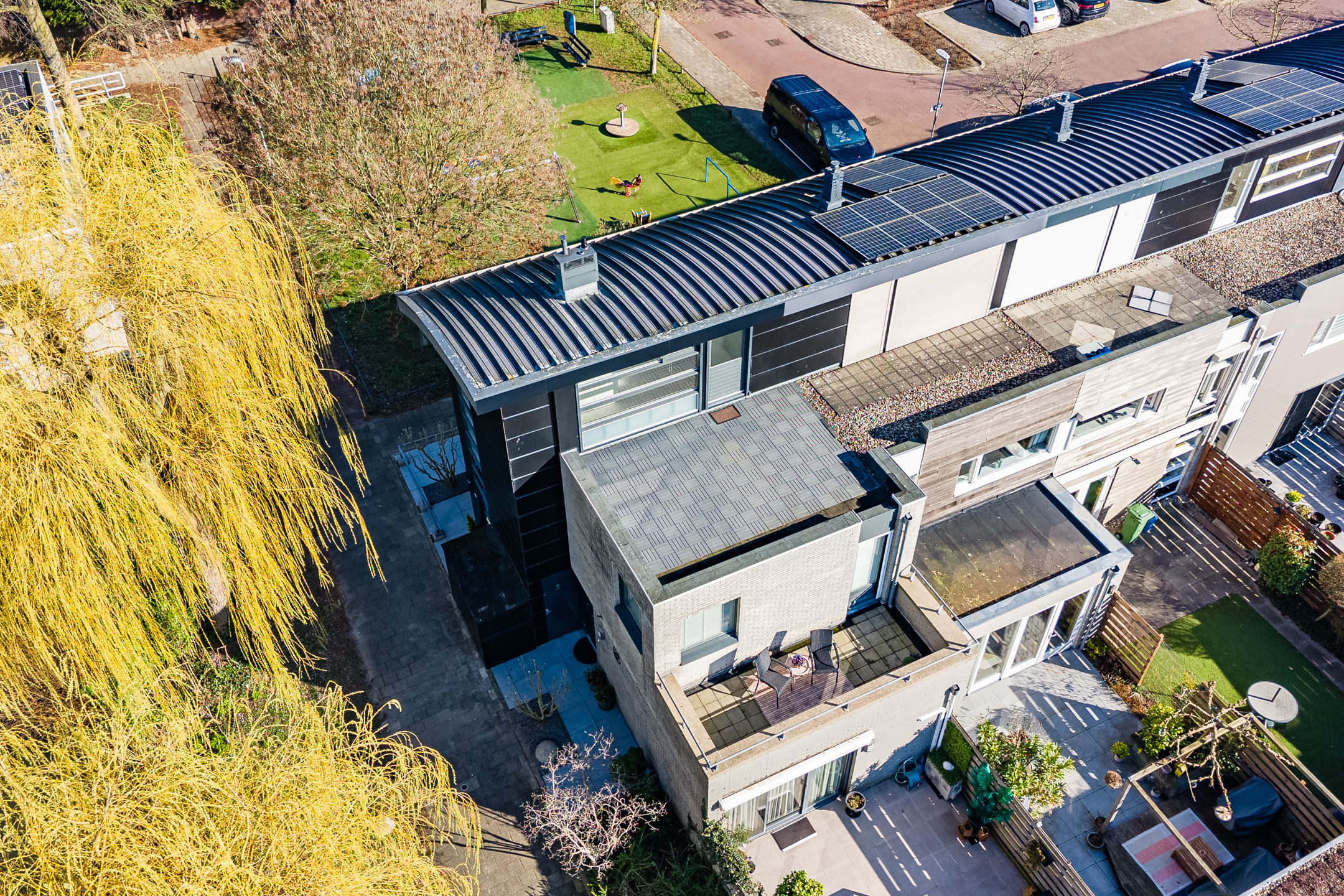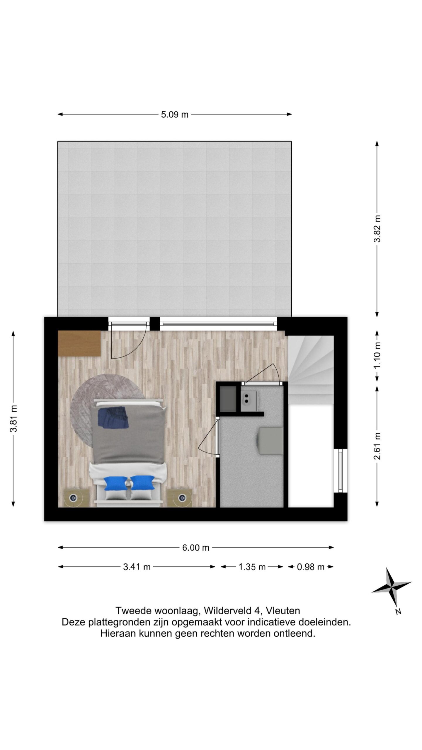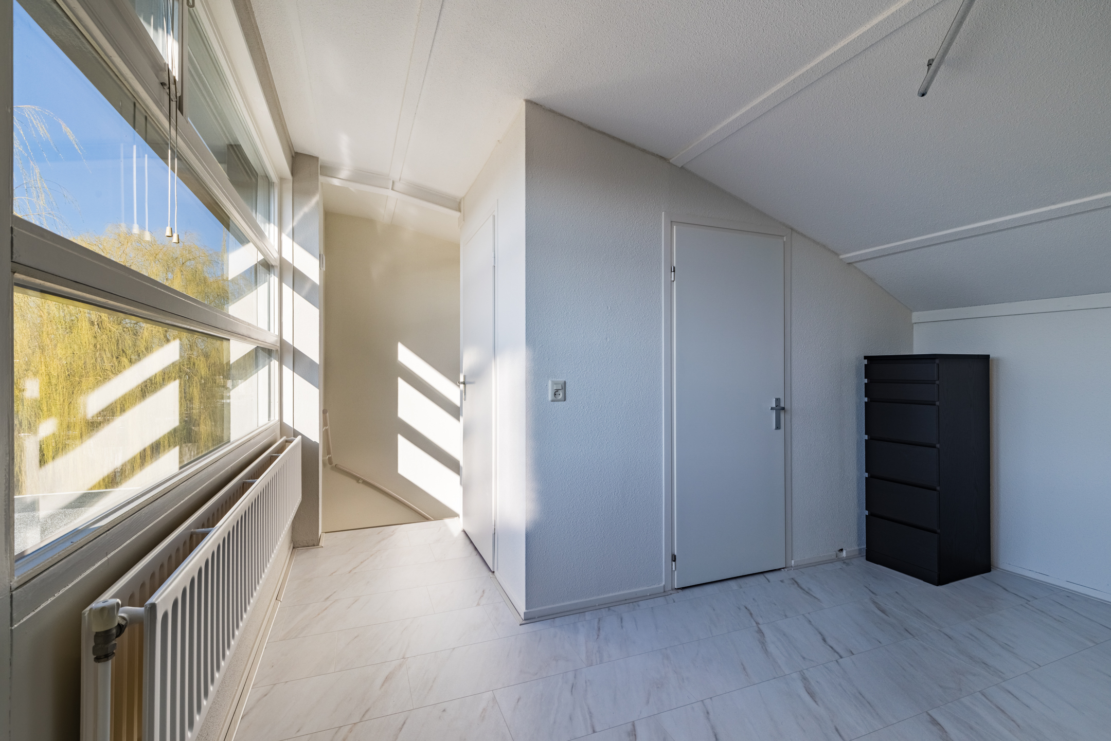 Vanuit de slaapkamer heb je toegang tot het zonnige dakterras op het platte dak. Dit terras biedt een vrij uitzicht over het omliggende groen en water. Op heldere dagen zie je zelfs de karakteristieke kerktoren van Vleuten, wat het uitzicht een charmant en dorps karakter geeft!