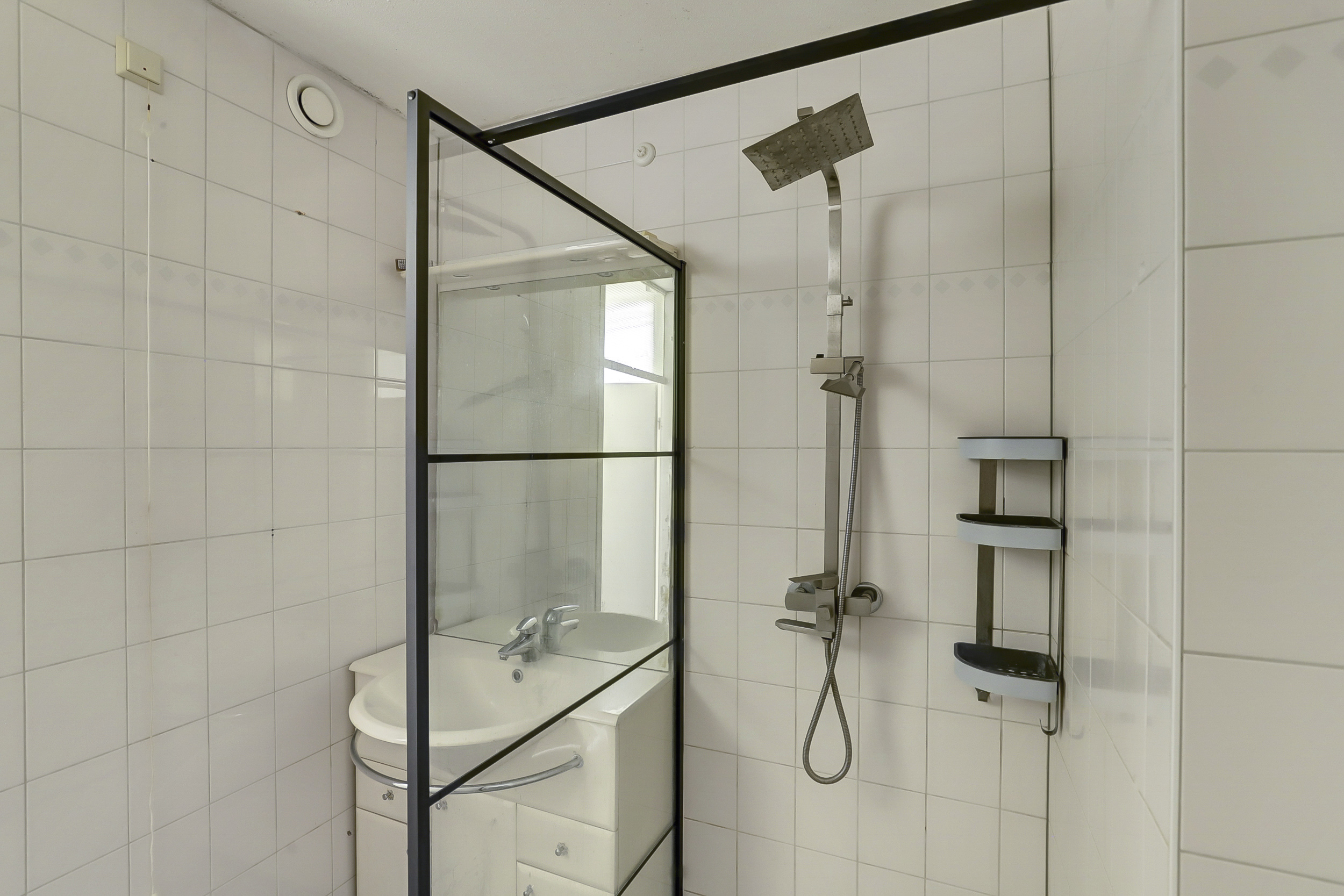 Entree, ruime hal, berging, toiletruimte v.v. staand toilet met fonteintje, badkamer v.v. douche en wastafel, toegang tot 2 volwaardige slaapkamers en de woonkamer.