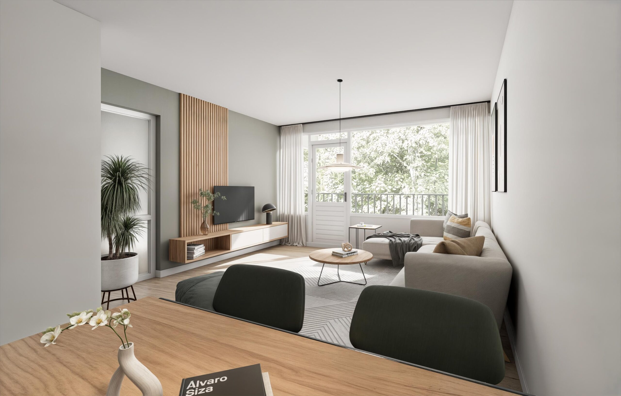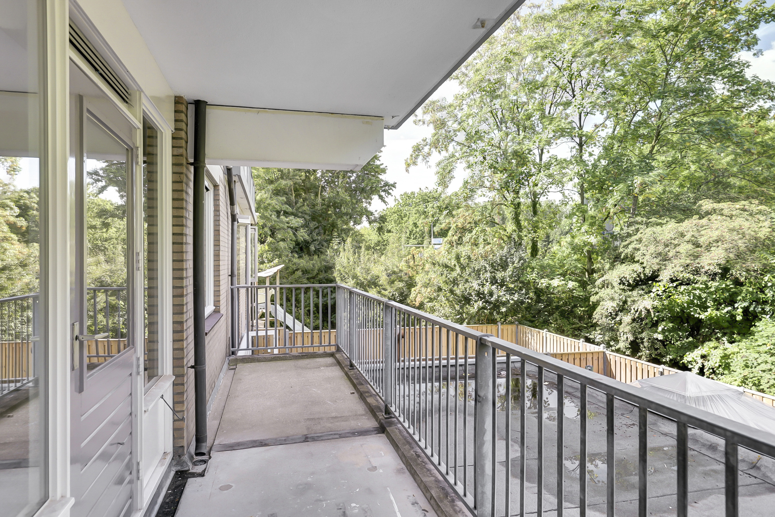 Het balkon op het westen is gesitueerd over de gehele breedte van het appartement en bereikbaar vanuit de woonkamer en slaapkamer. Zo kun je hier na een lange werkdag onder het genot van een drankje heerlijk genieten van middag/avondzon.